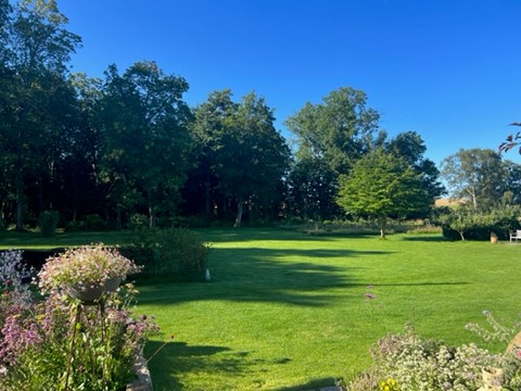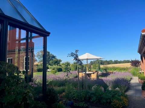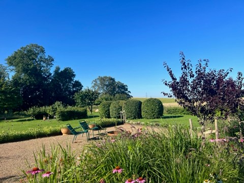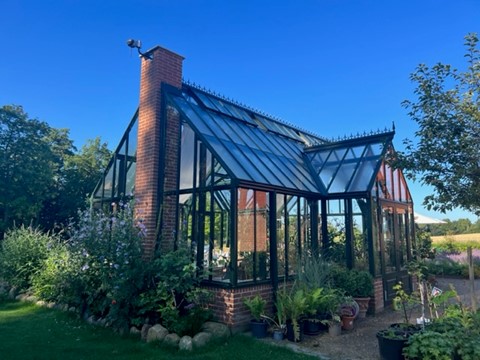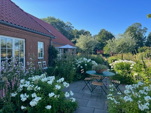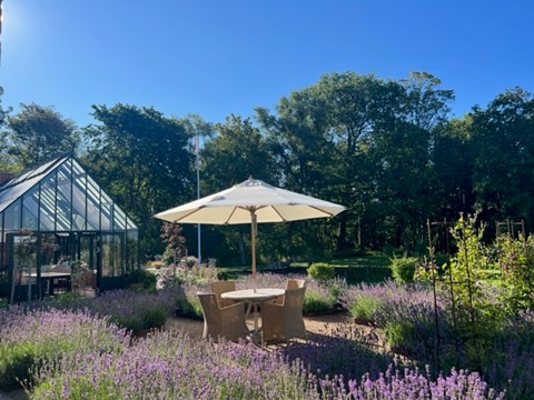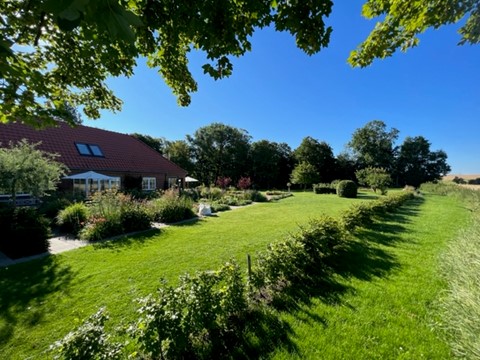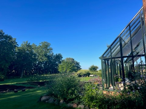 Stort orangeri til både mennesker og planter. Mange mindre terrasser og siddepladser er placeret i havens forskellige rum. Nyanlagt frugtlund med vild vegetation omkring træerne og køkkenhaven er under opførsel.
