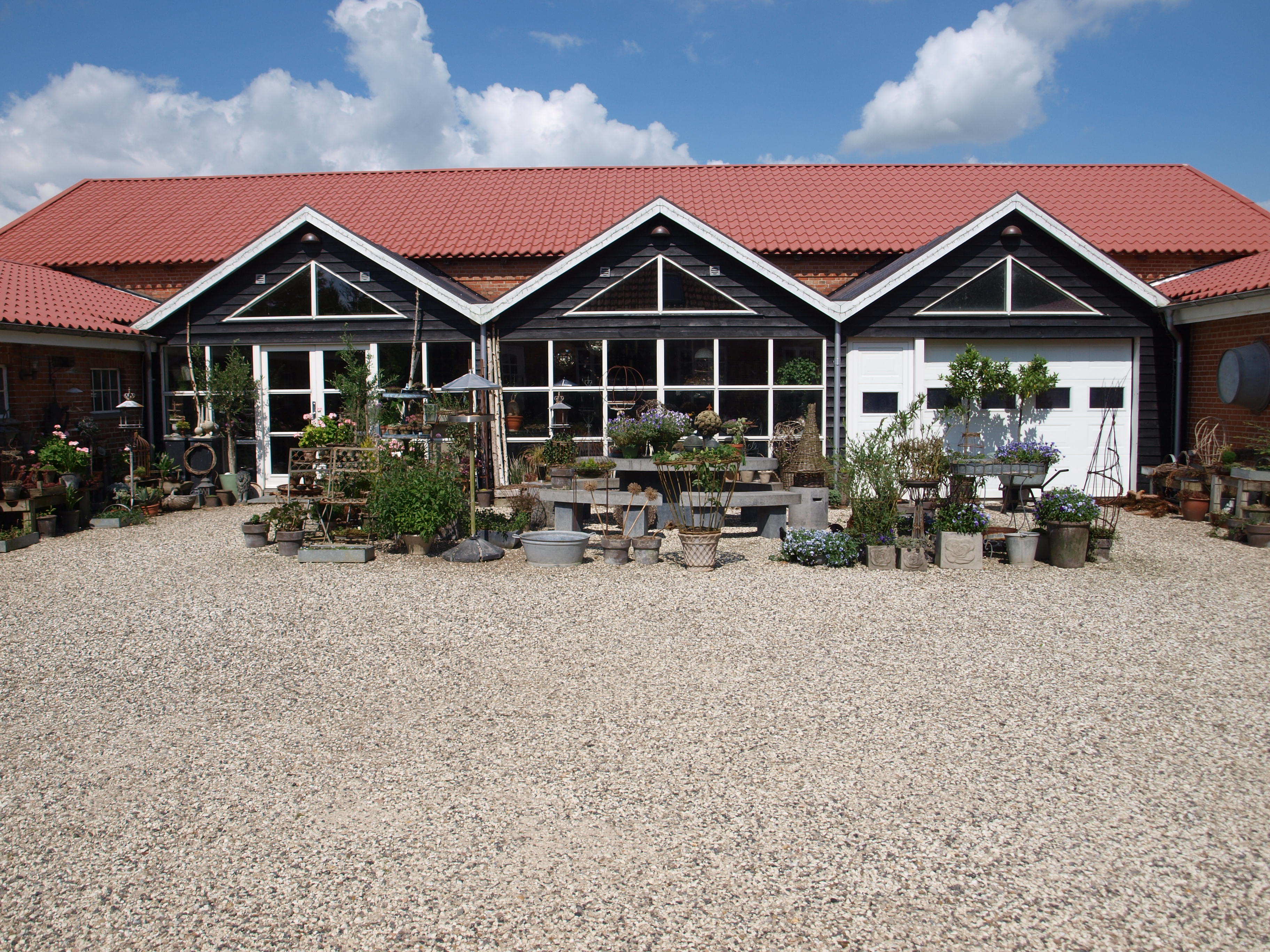 Haven er meget alsidig med alm. og sjældne træer, buske, stauder, roser historiske buskroser og historiske slyngroser på høje jernstativer og buer, der er formklippet buske og træer. Der er vand i haven, et lille drivhus og et plastik drivhus til drivning af roser og andre spænde planter, et hyggeligt orangeri (hvor i kan nyde kaffen) med flere spændende terrasser omkring. Der er salg i butikken af binderi artikler, lys m.m. flette pil i sorter, planter og jern stativer til haven. Efter aftale kan Aase tilbyde kurser / demo i pile flet med blomster, binderi og julebinderi i blomster værkstedet eller ude i have kredsene. For åbnings tider: Følg os på facebook: Aase Hviid
