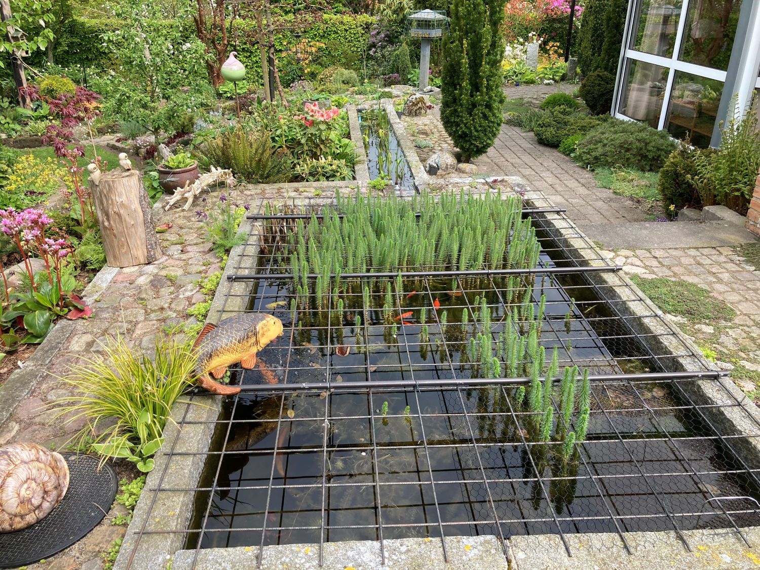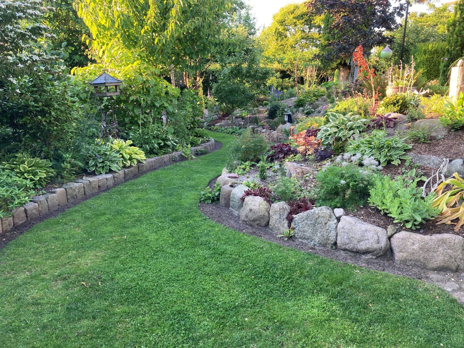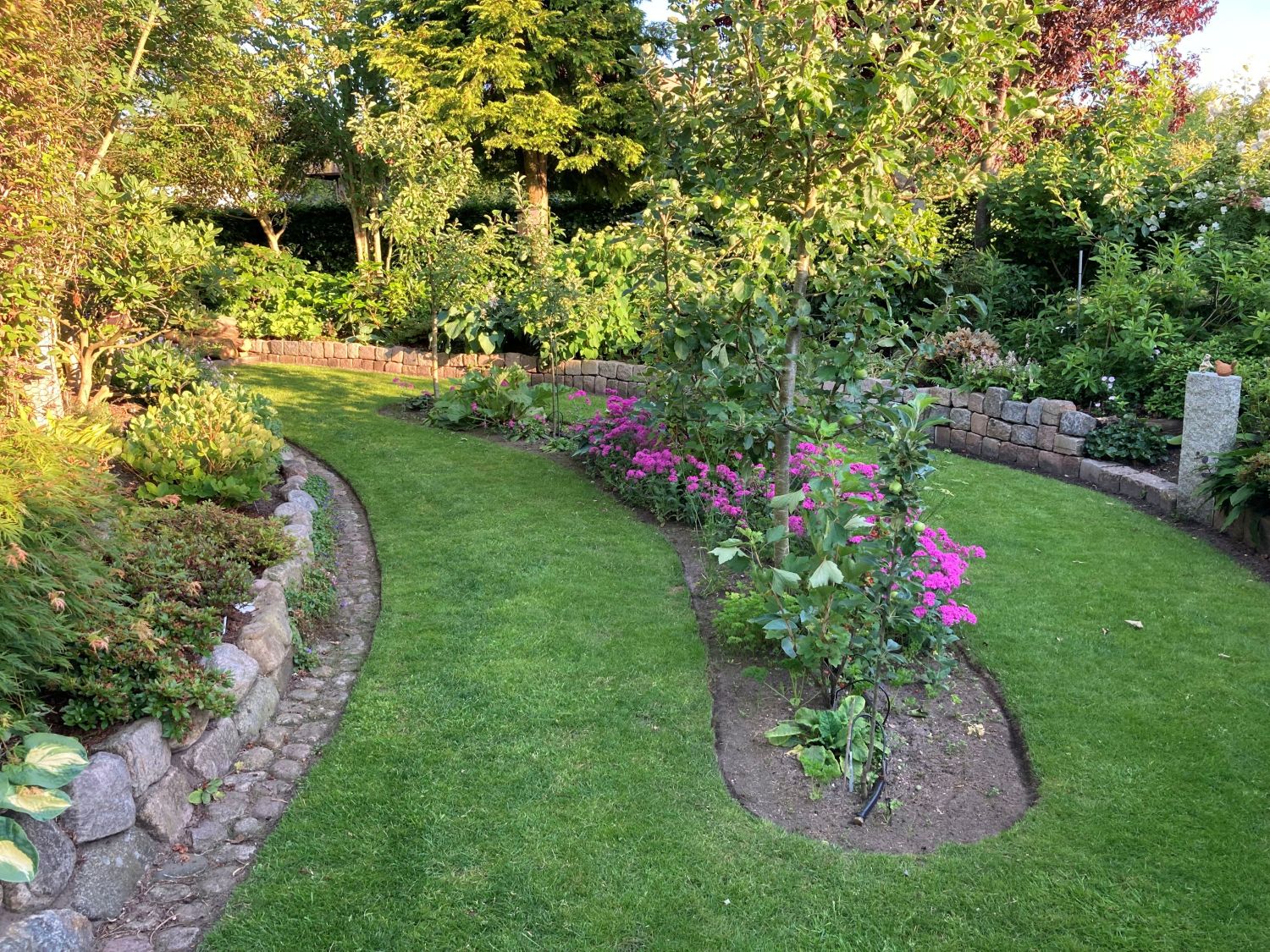 Have med rhododendron, alpinbed, havebassin, skovbed og æbletræer.