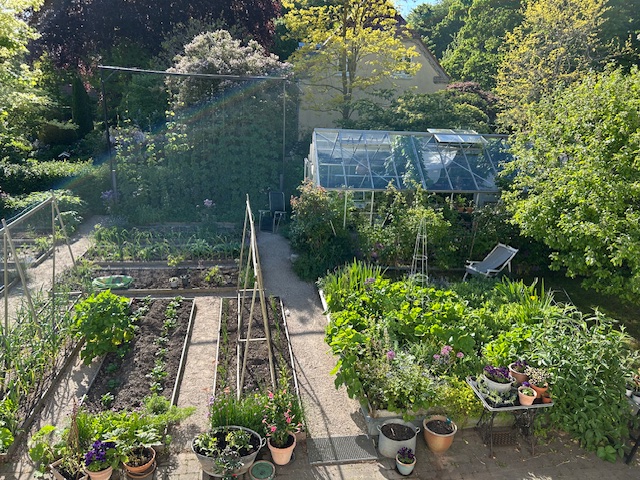 To gamle, hyggelige og forskellige haver, meget frodige og dejlige. Stauder, frugttræer, roser, køkkenhaver, drivhus.
