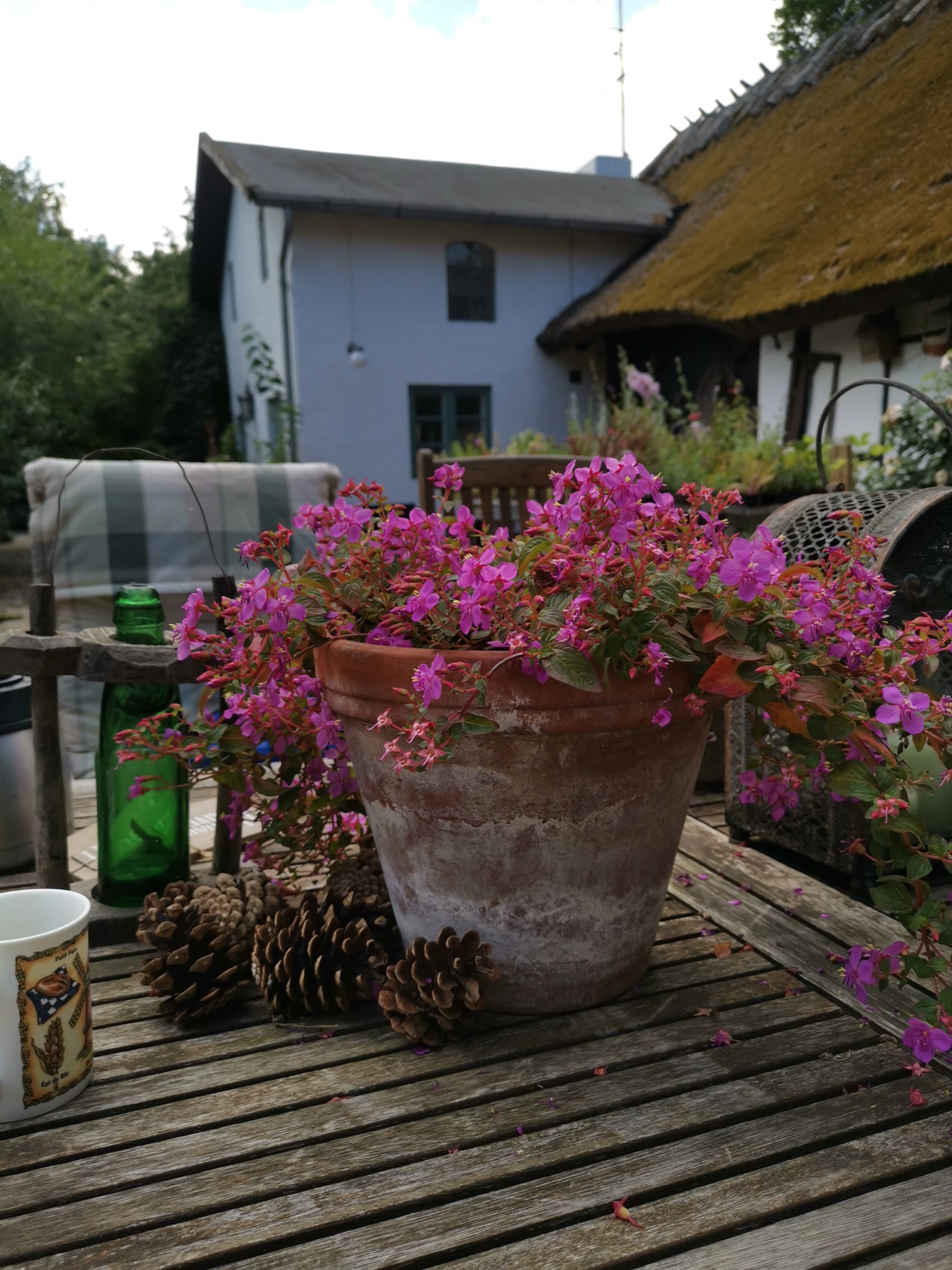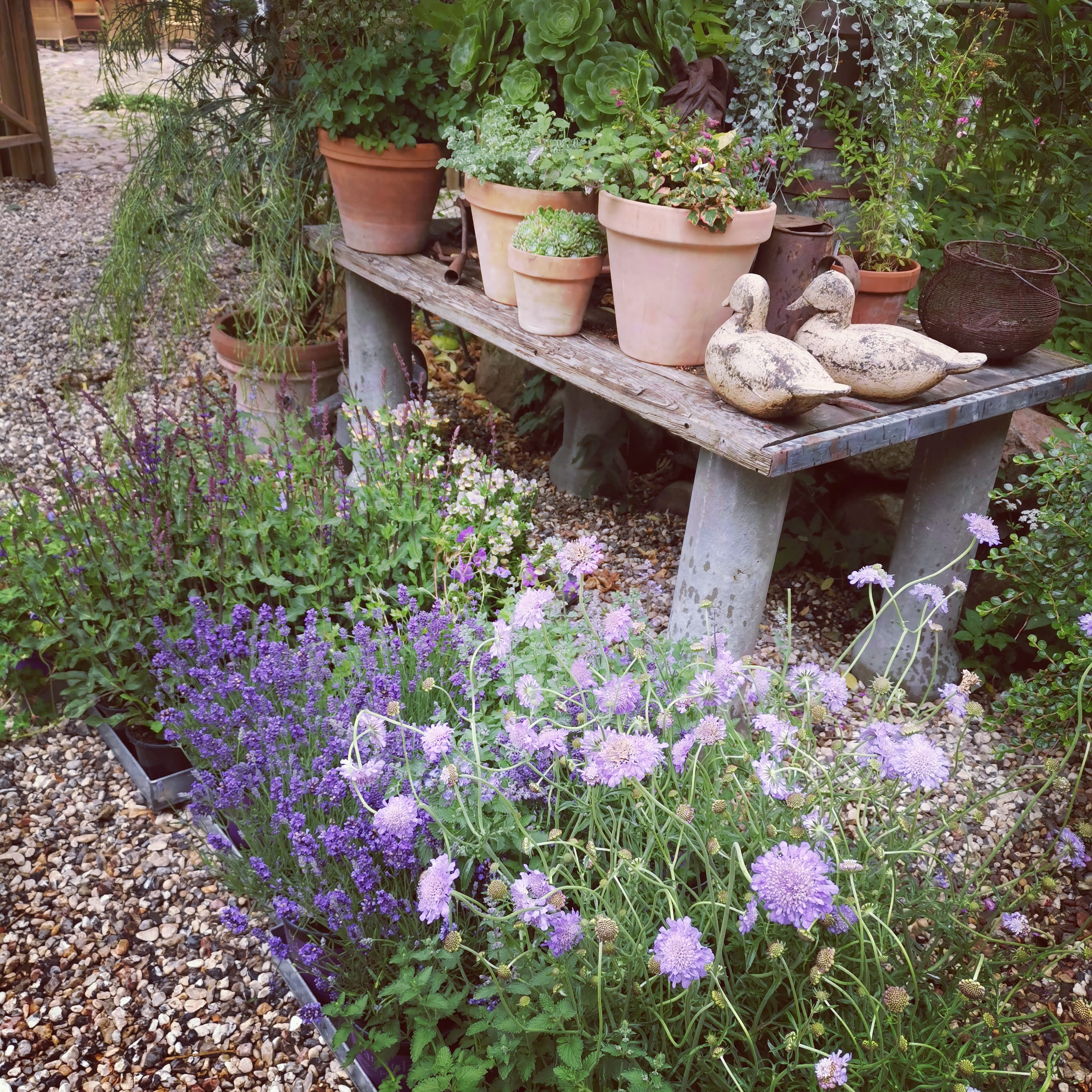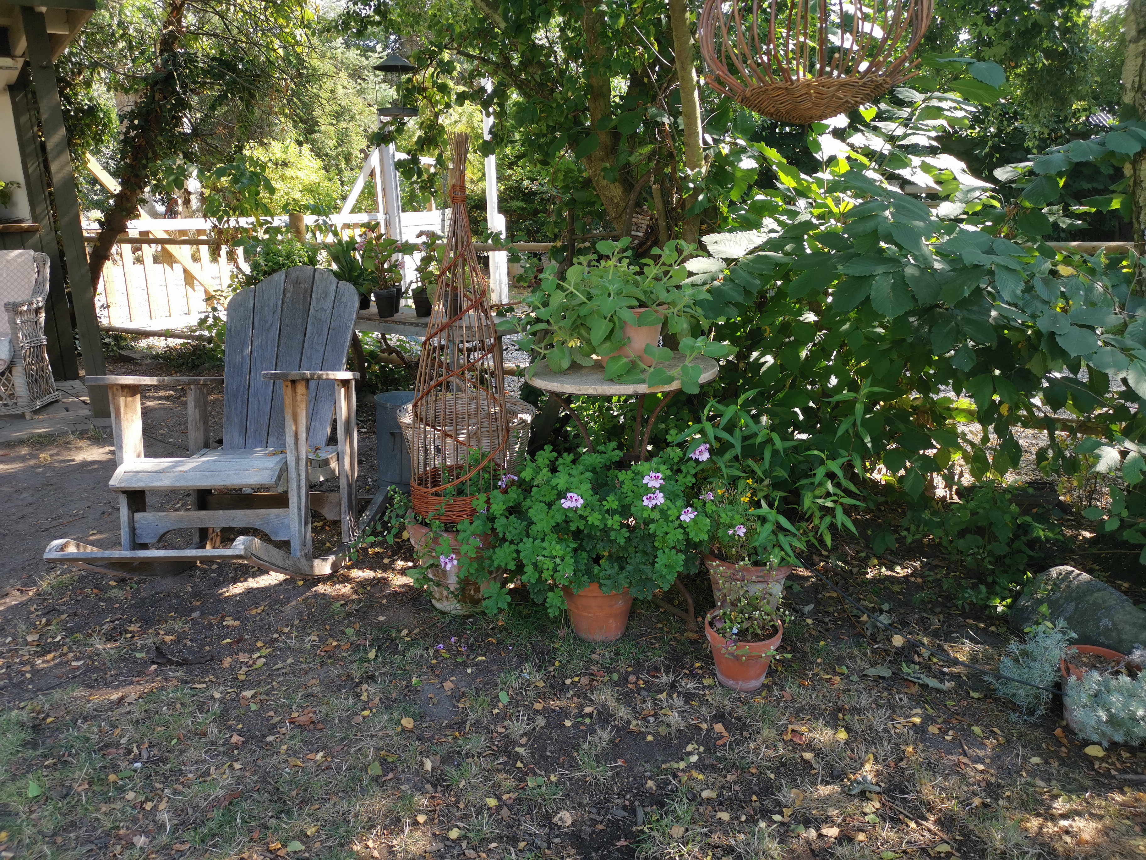 Bondegårdshave med små rum, mange urter, sjældenheder, duftpelagonier og gamle træer