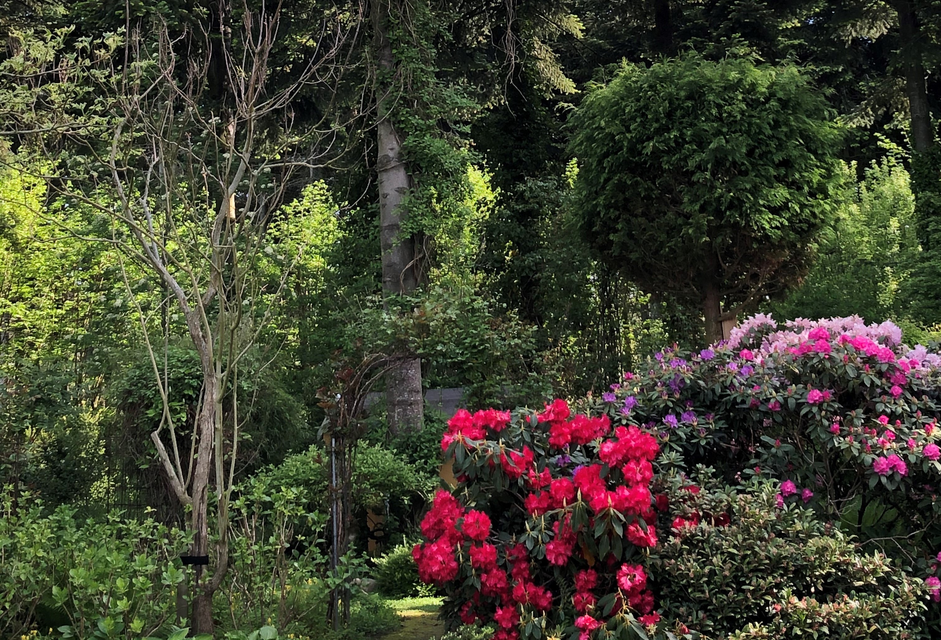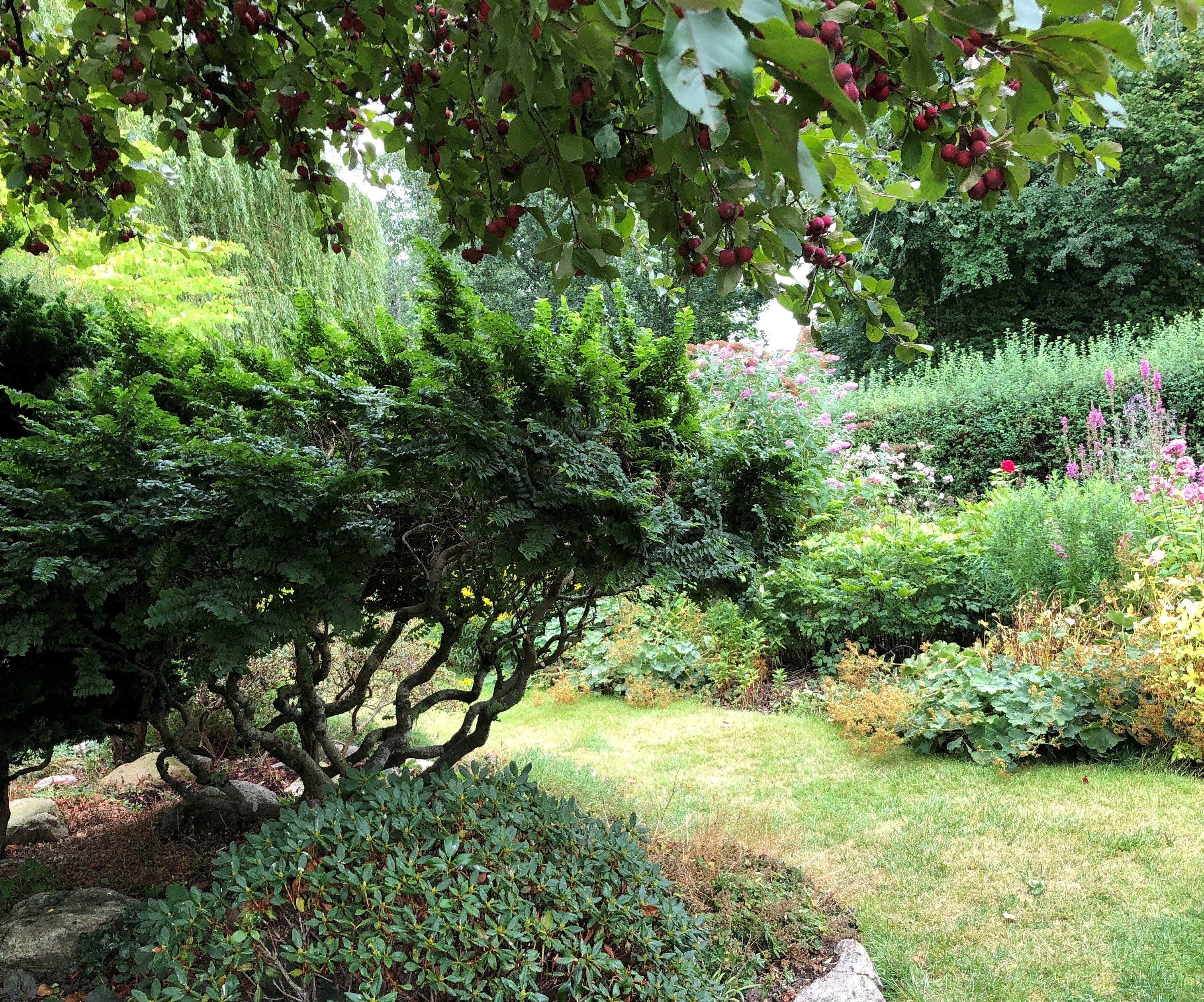 Mange forskellige rum og planter. Bl.a. forskellige hosta, storkenæb, roser, hortensia, frugtbuske og -træer.