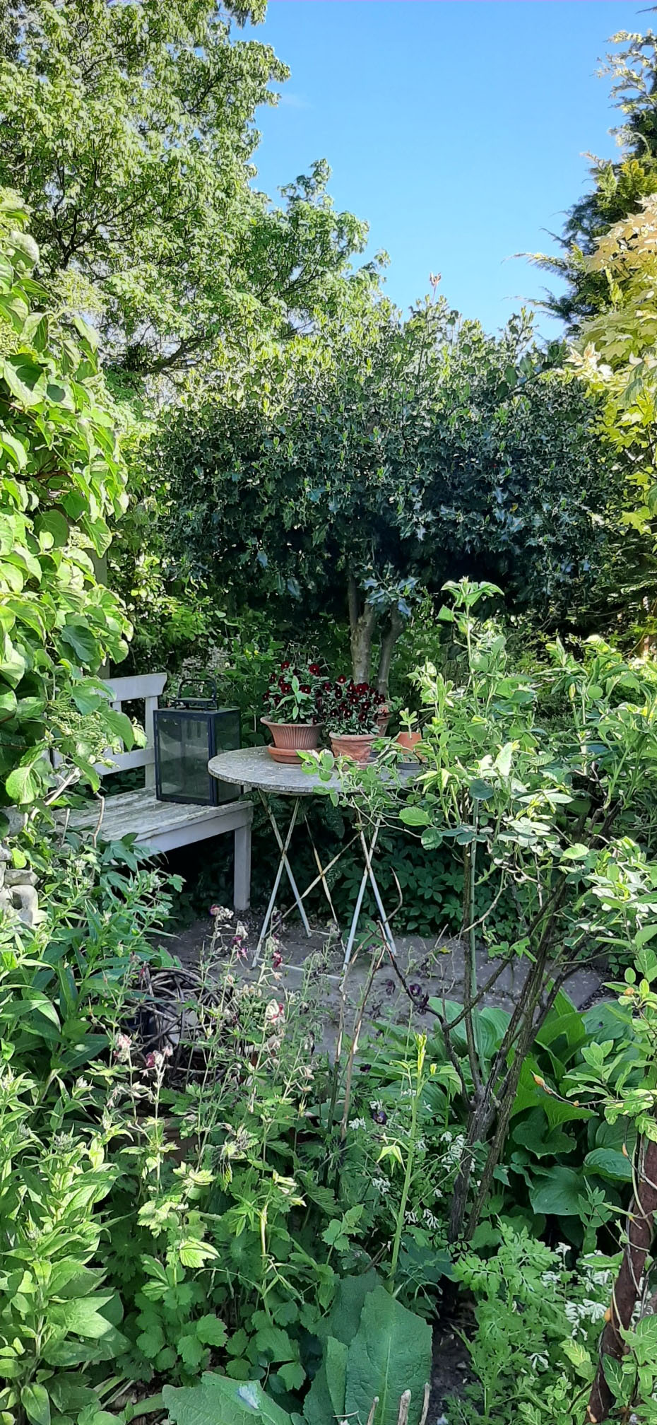 Haven er på 950 m2 og er 25 år gammel. Haven består af mange forskellige rum med hver deres tema. Roserne er dronningen i haven og stauderne spiller for det meste op imod dem. Der er en del Hostaer og Storkenæb.