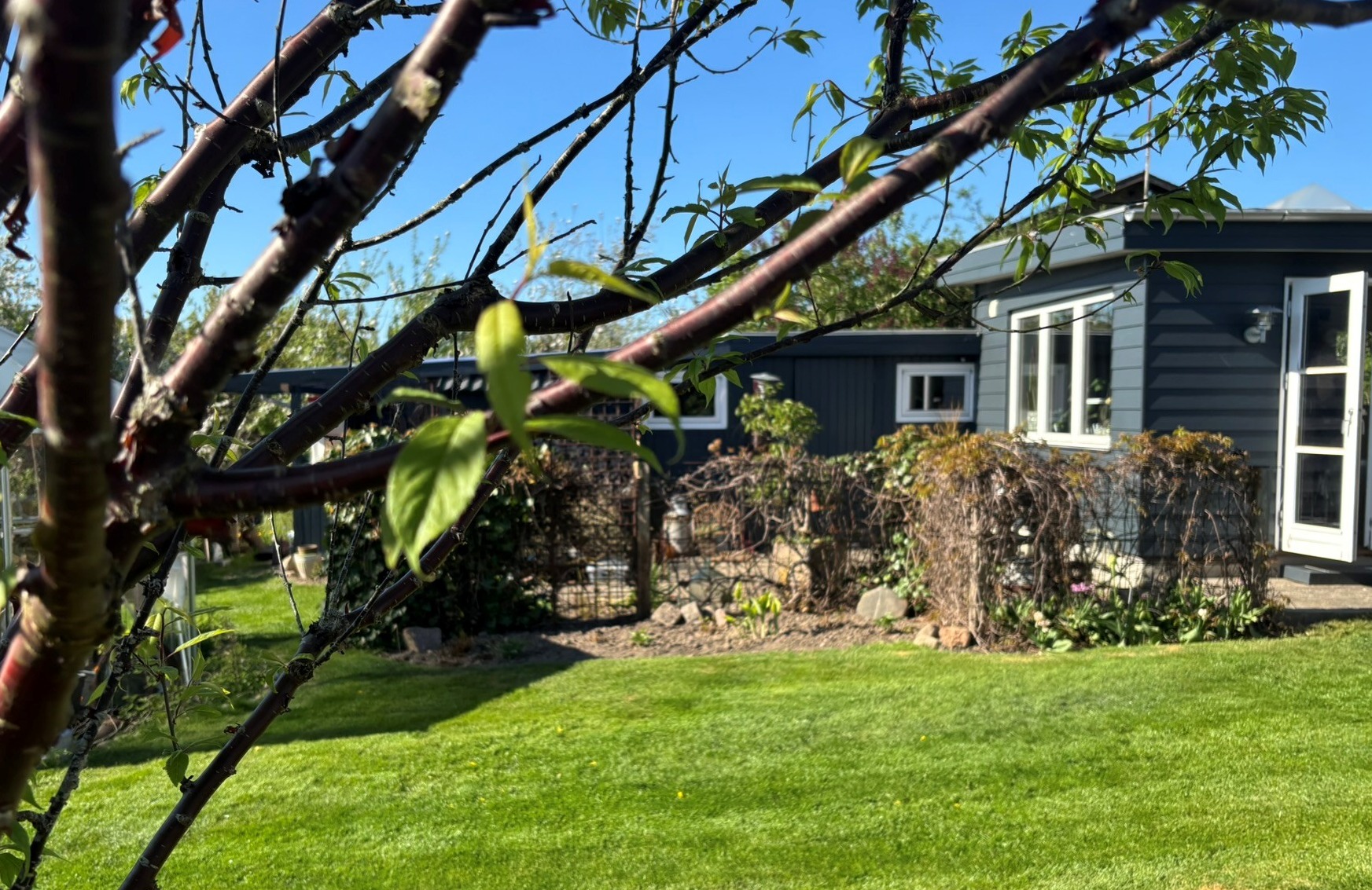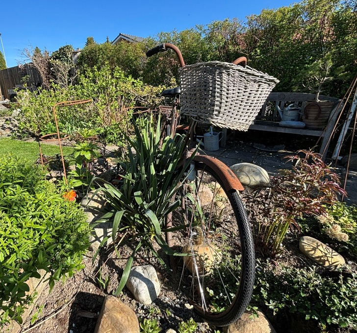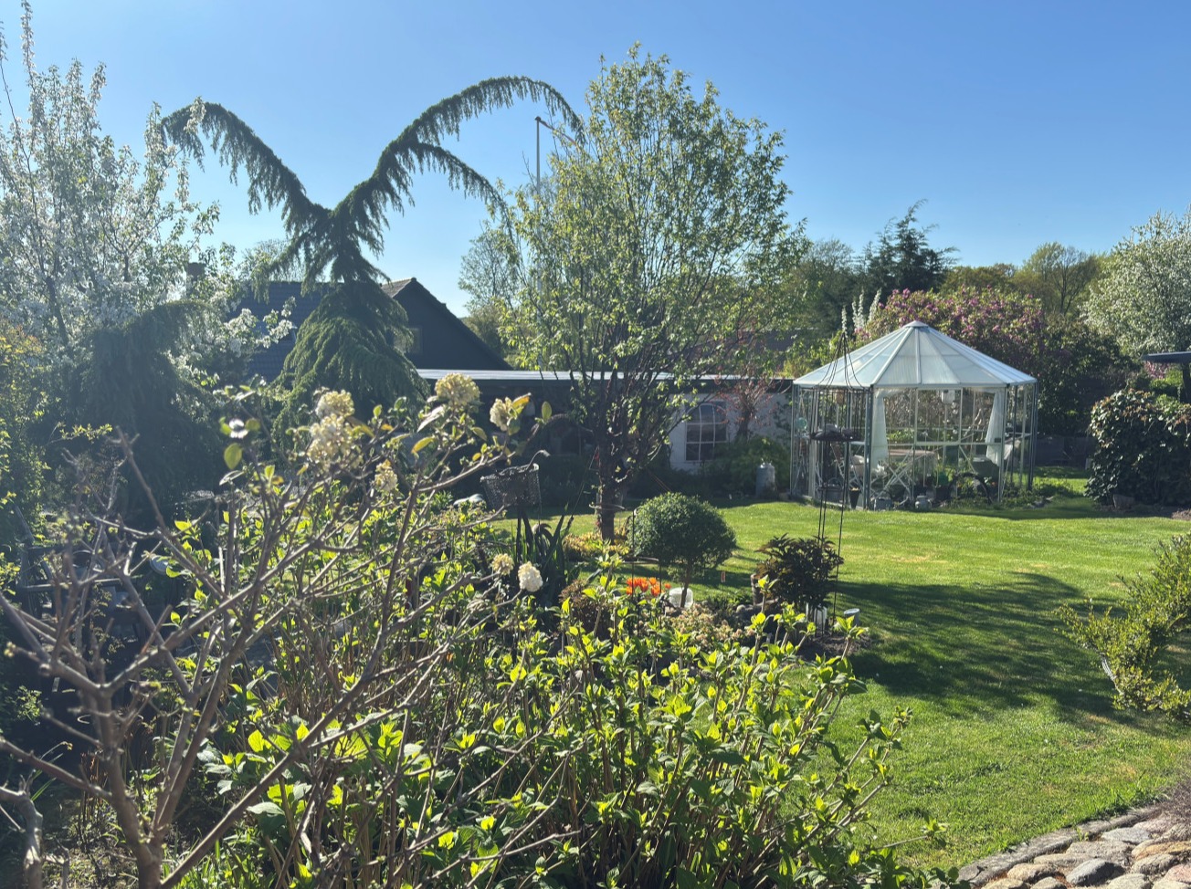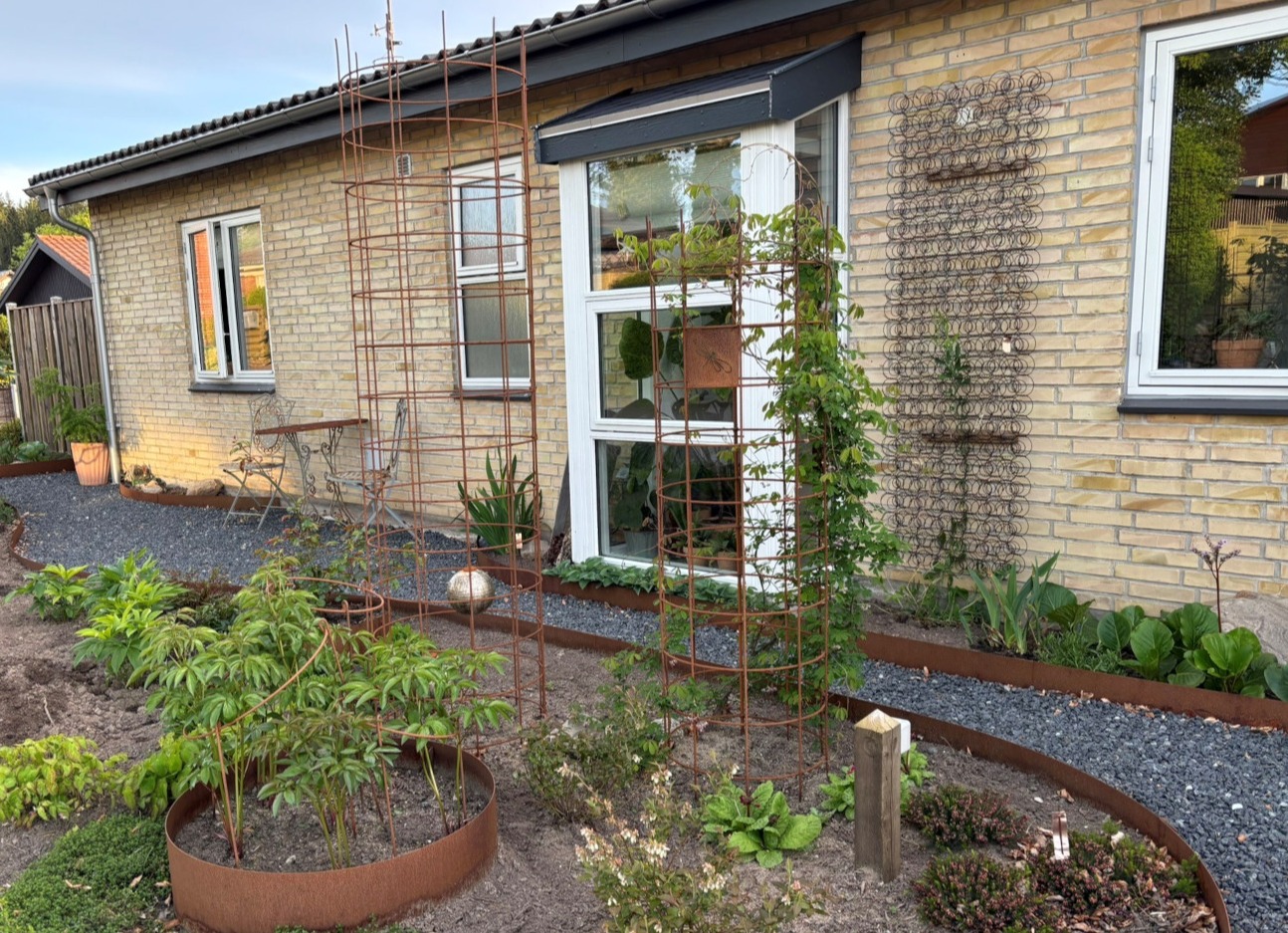 60èr parcelhus have på 900 2m placeret i sydbyen af Silkeborg, overtog det 2010 og har været i lige gang siden. Nye ideer opstår hele tiden, sidste nye er forhaven hvor stauder, bærbuske og grøntsager i lilla nuancer forenes. I haven vil du møde drivhuse - forskellige hyggekroge - højbede med grøntsager og græsplæne med omkringliggende staudebede. I haven bliver afklip fra buske og træer brugt til kugler eller andet kunst til fordel for biodiversiteten. Der dyrkes både for at nyde synet i haven, men også for at udnytte havens planter til blomster dekorationer og julekranse.