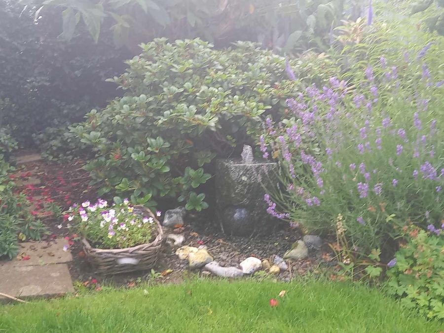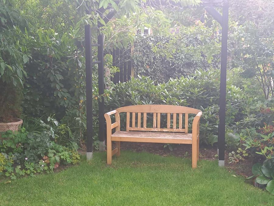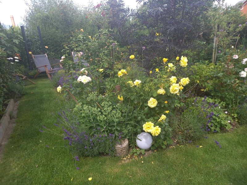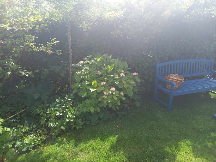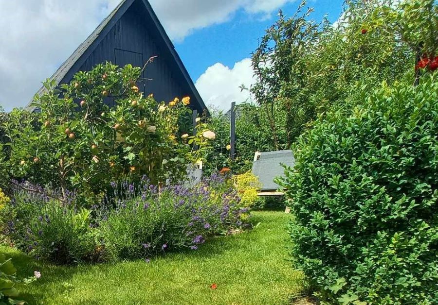 Her falder man til ro i et af de mange rum og kroge mellem de godt 10 træer og frugttræer, der sammen med stedsegrønne rhododendroner, buskbum- og laurbærhække danner rygraden i haven.