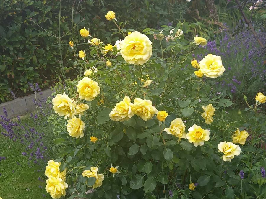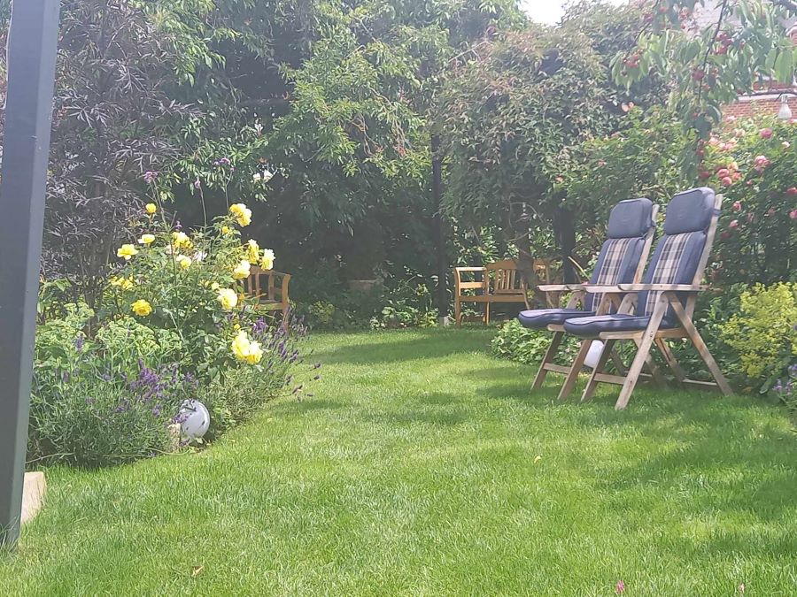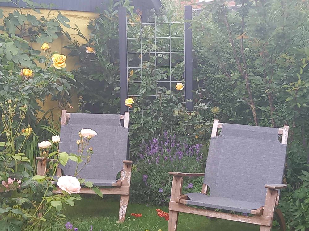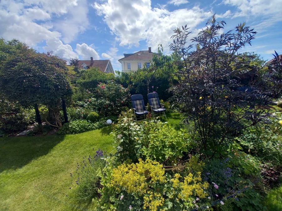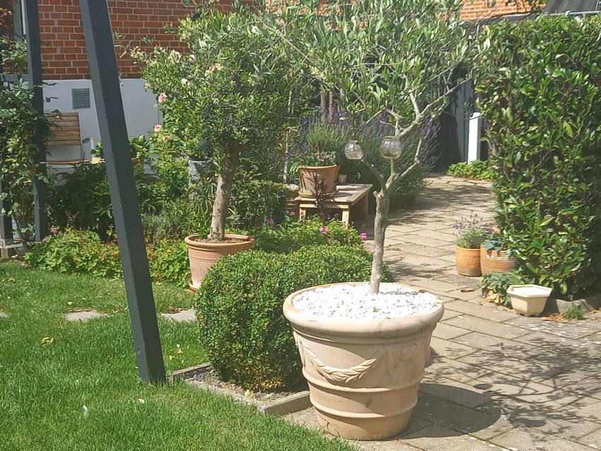 Den charmerende byhave rummer rundt om et skønt udhus flere terrasser, grønne buske og -vægge samt rose- og staudebede.