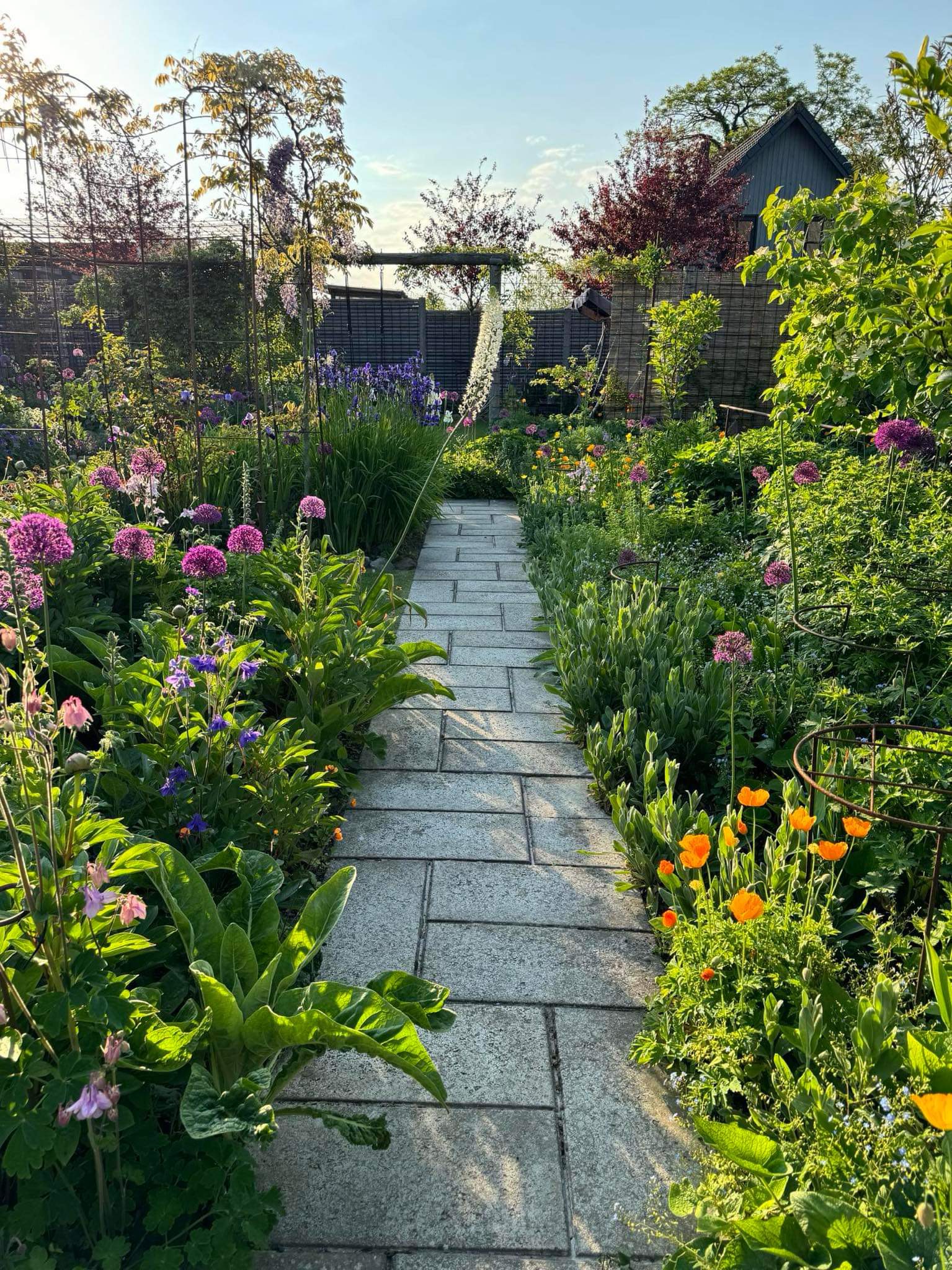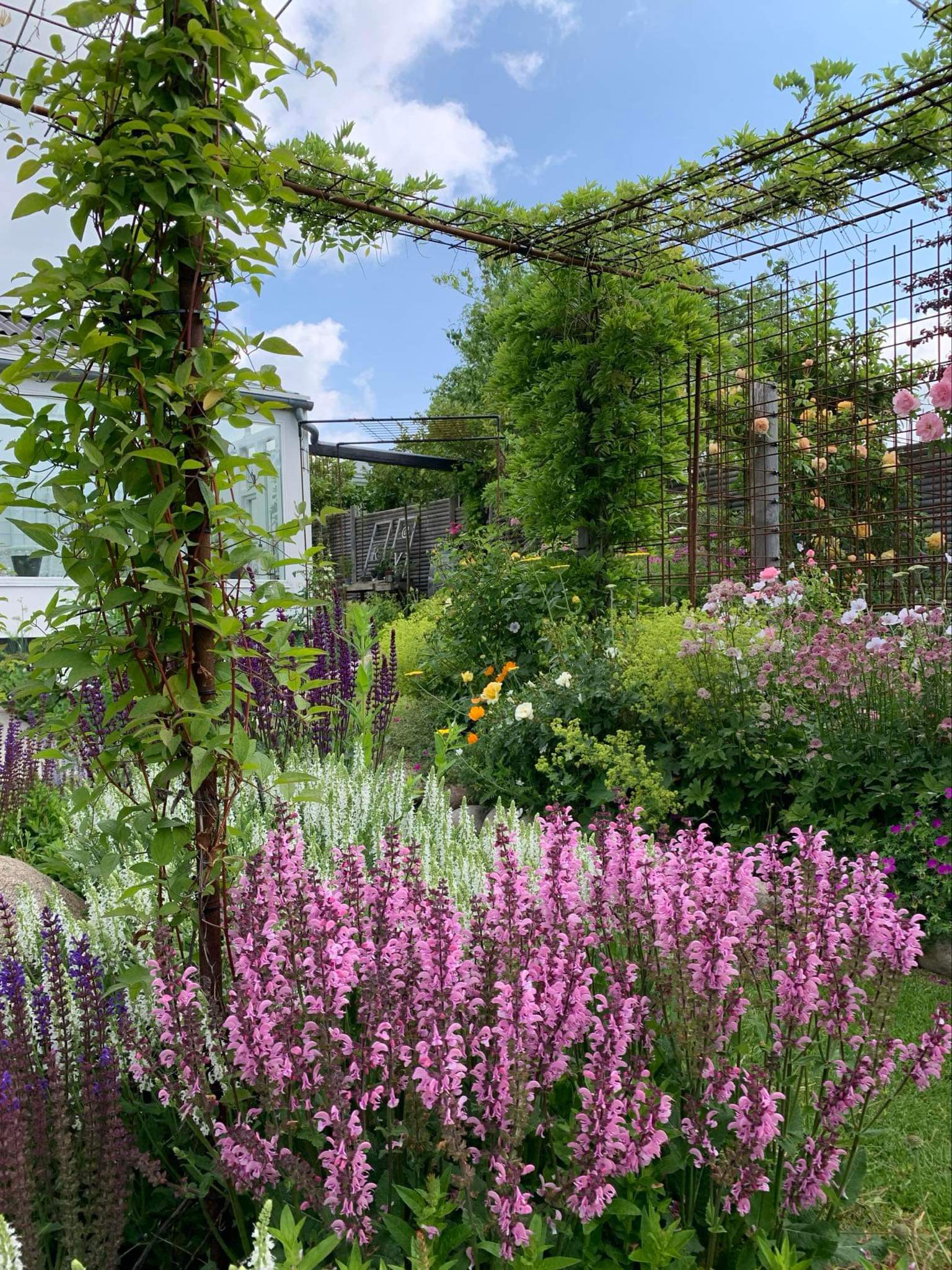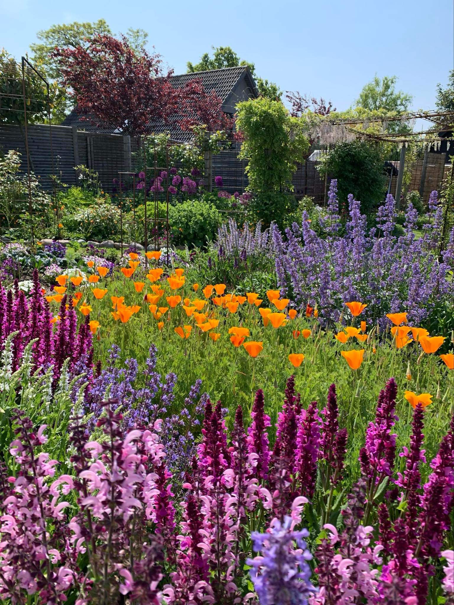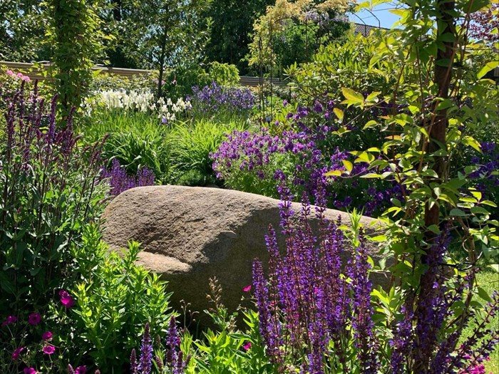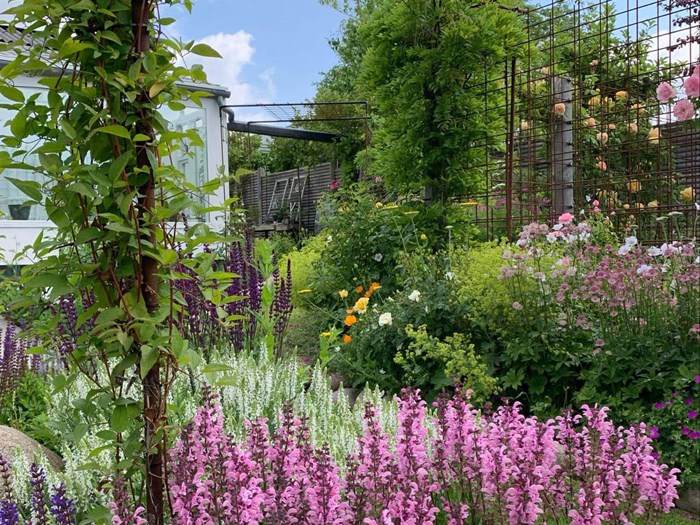 Blomstrende have med bla. stauder, roser, klematis, blåregn, kaprifolie, rododendrons og azaleaer. Mini køkkenhave.