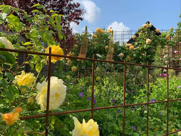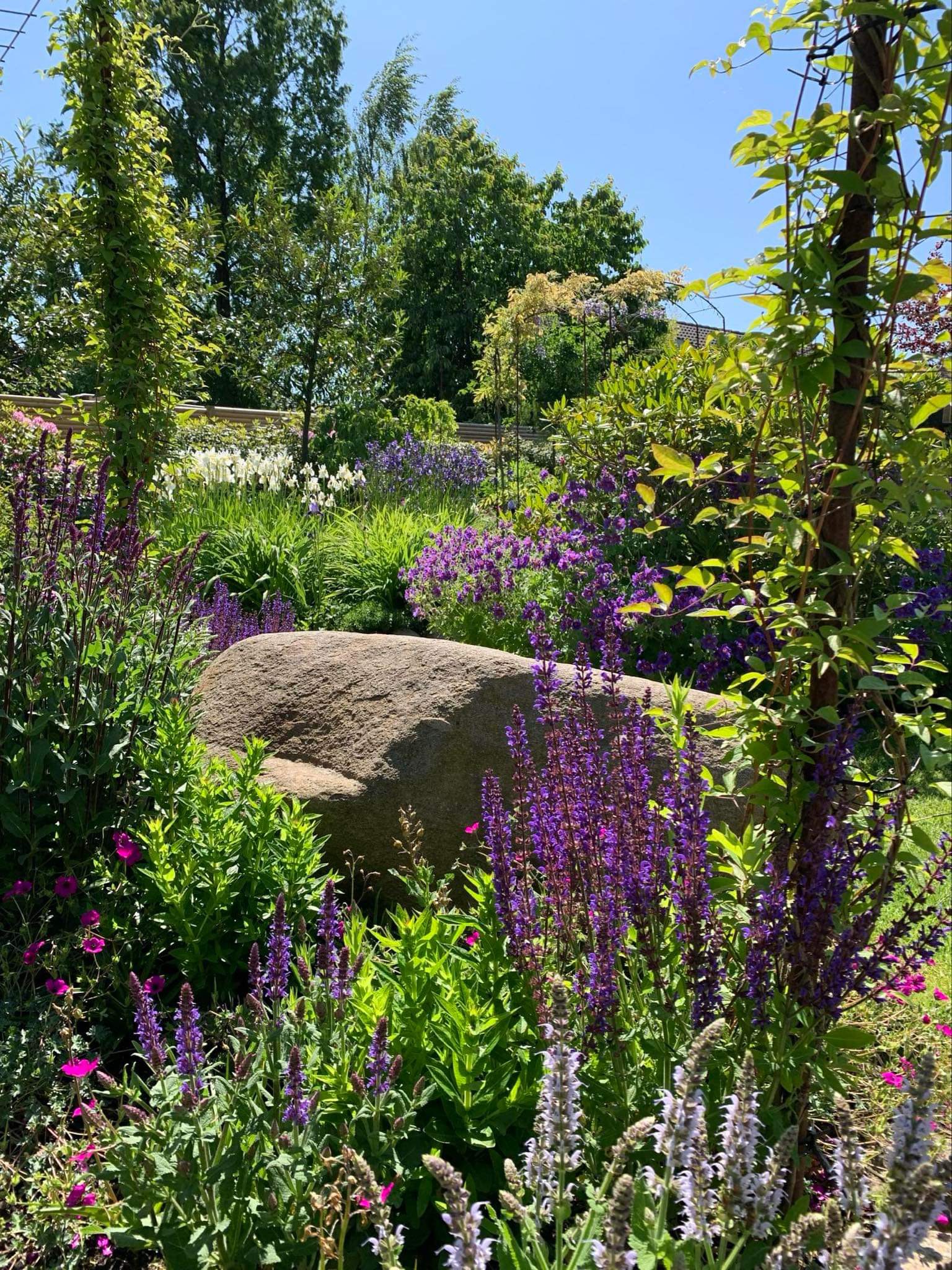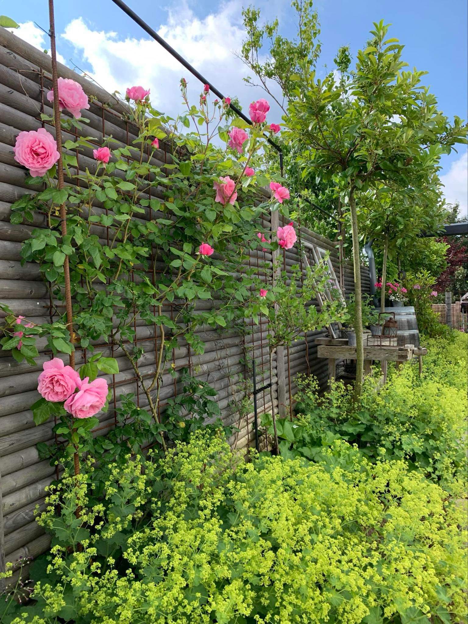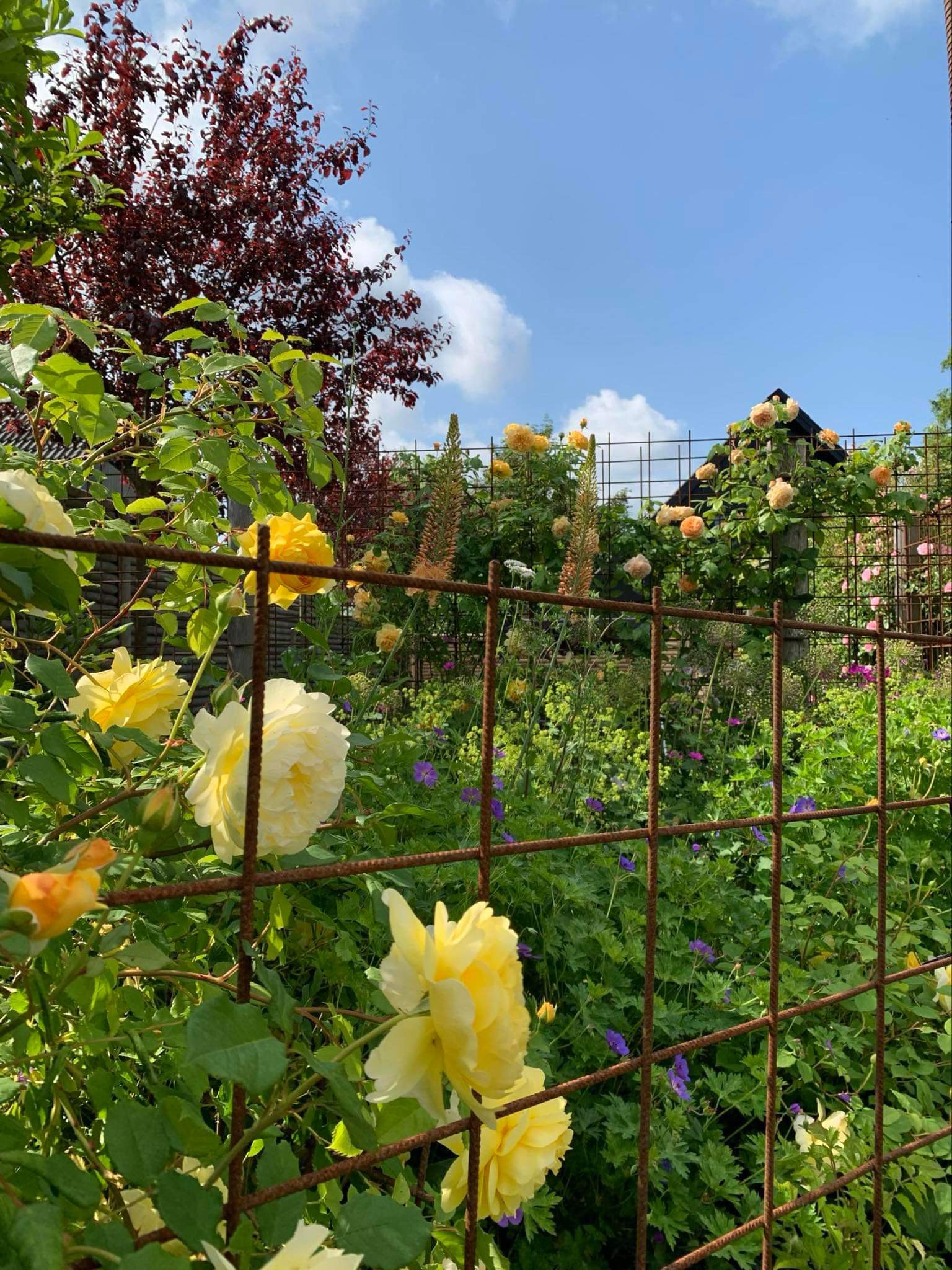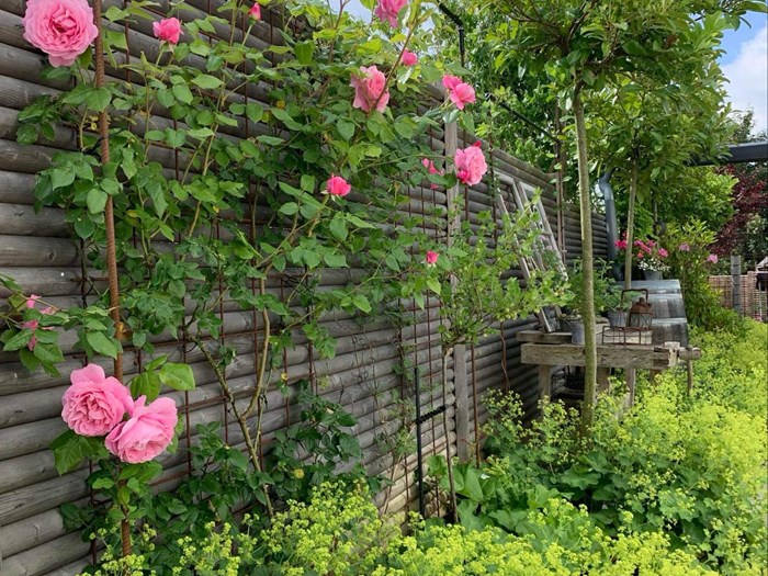 Blomstrende have med bla. stauder, roser, klematis, blåregn, kaprifolie, rododendrons og azaleaer. Mini køkkenhave.