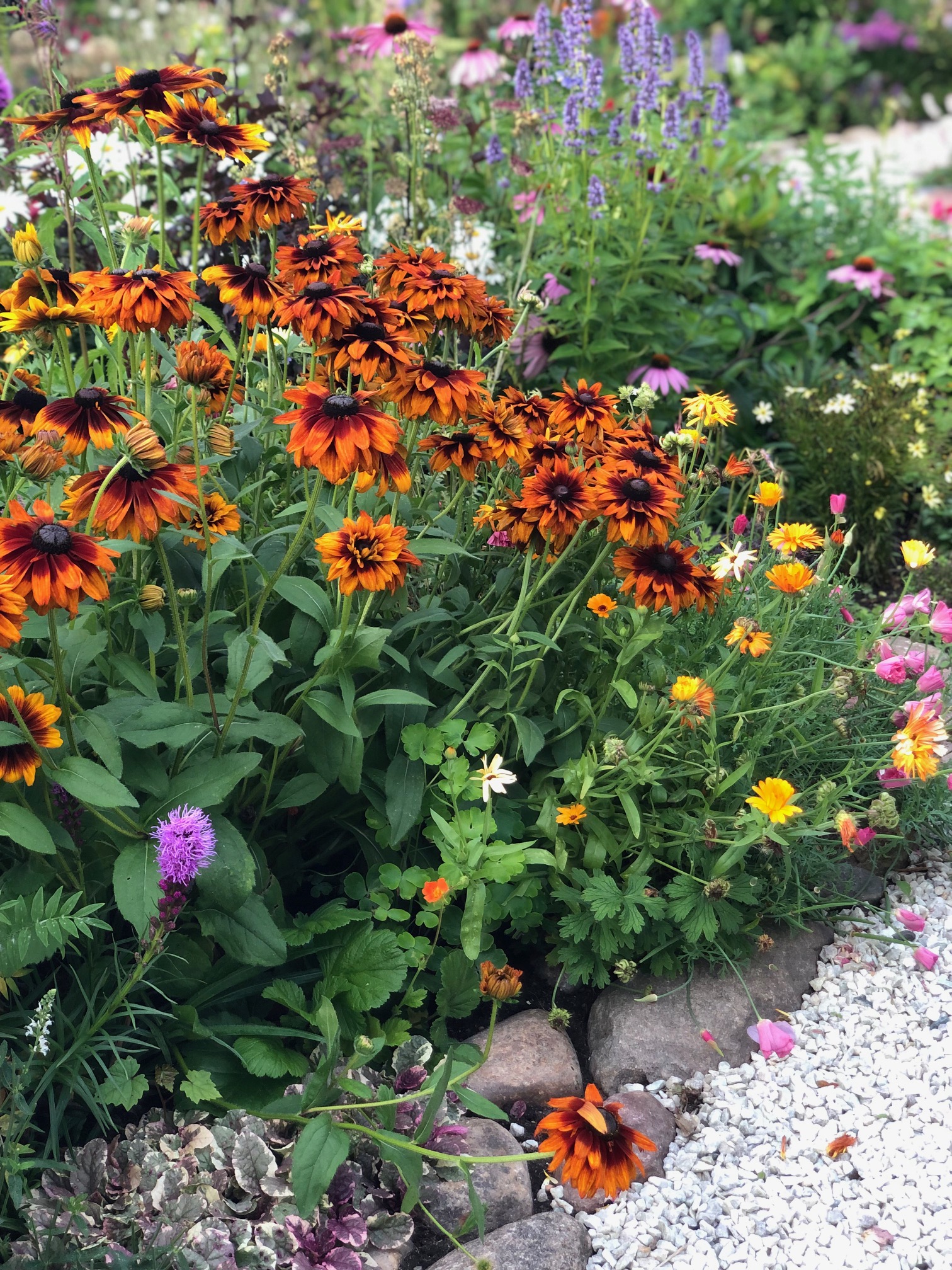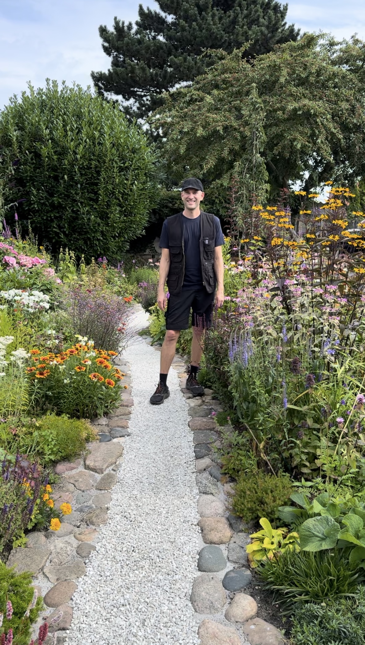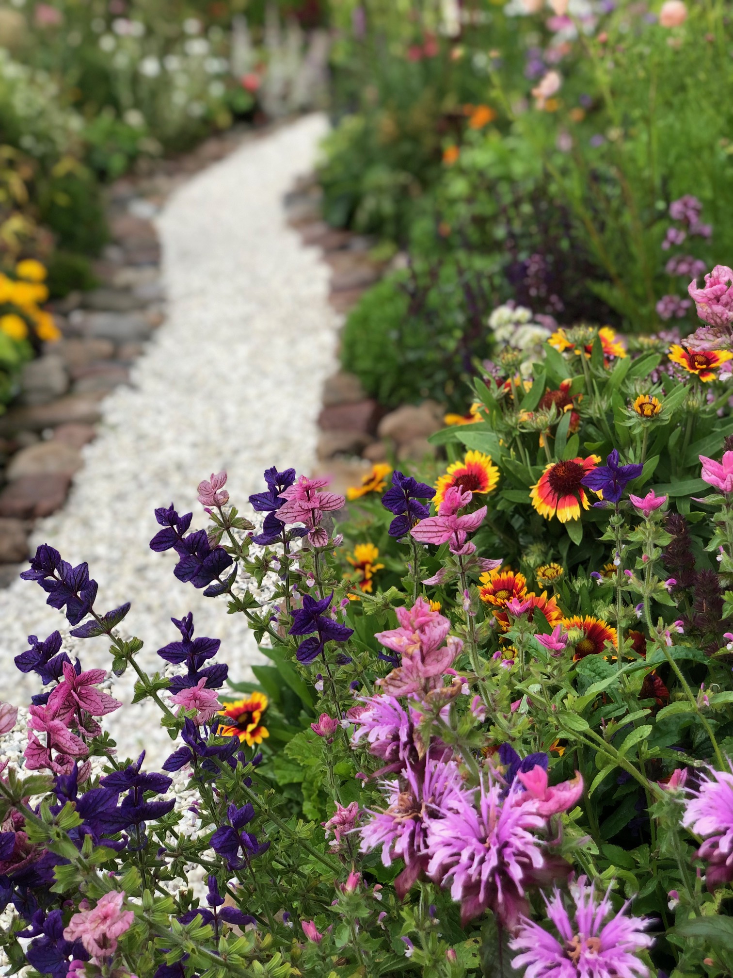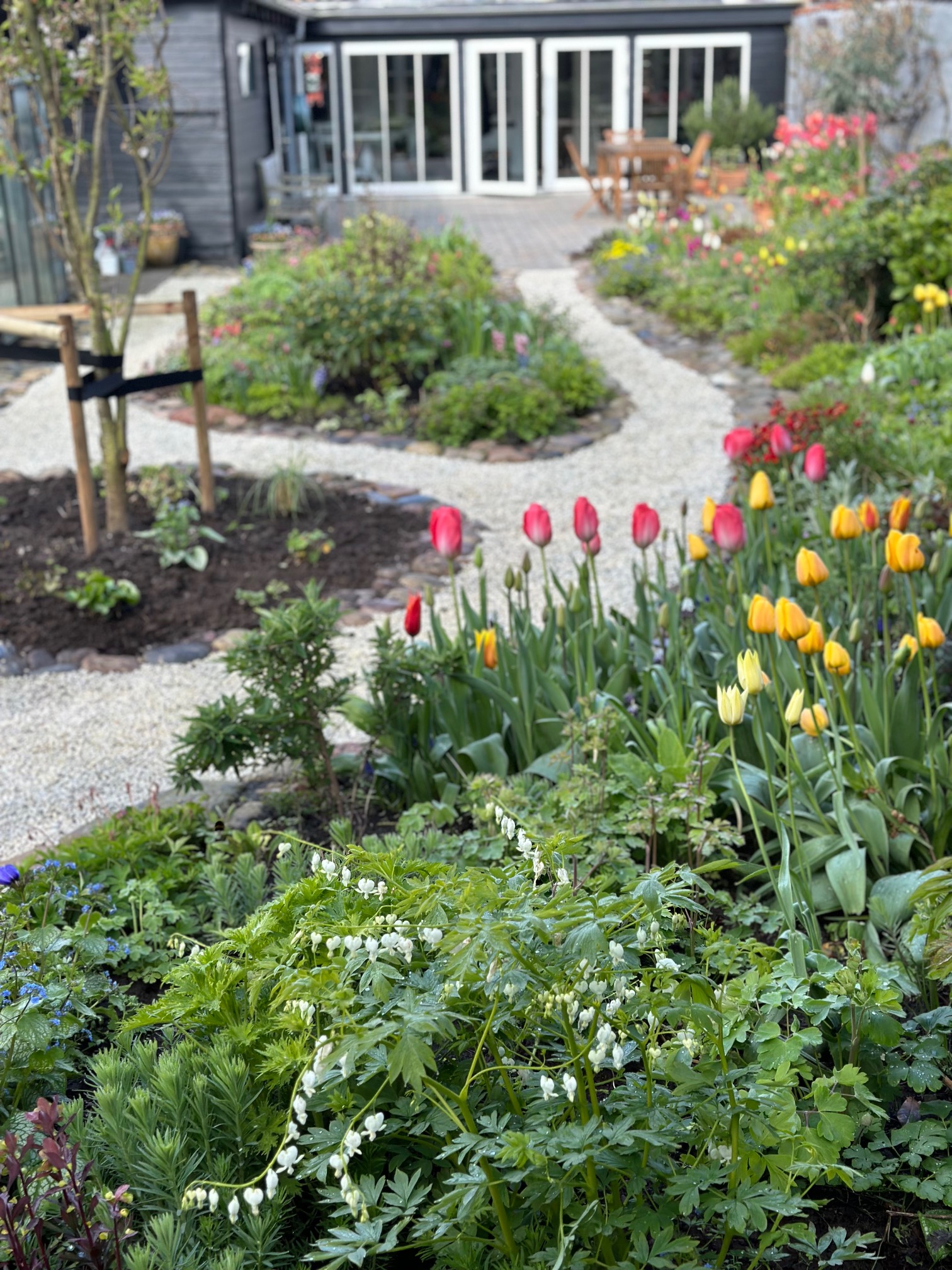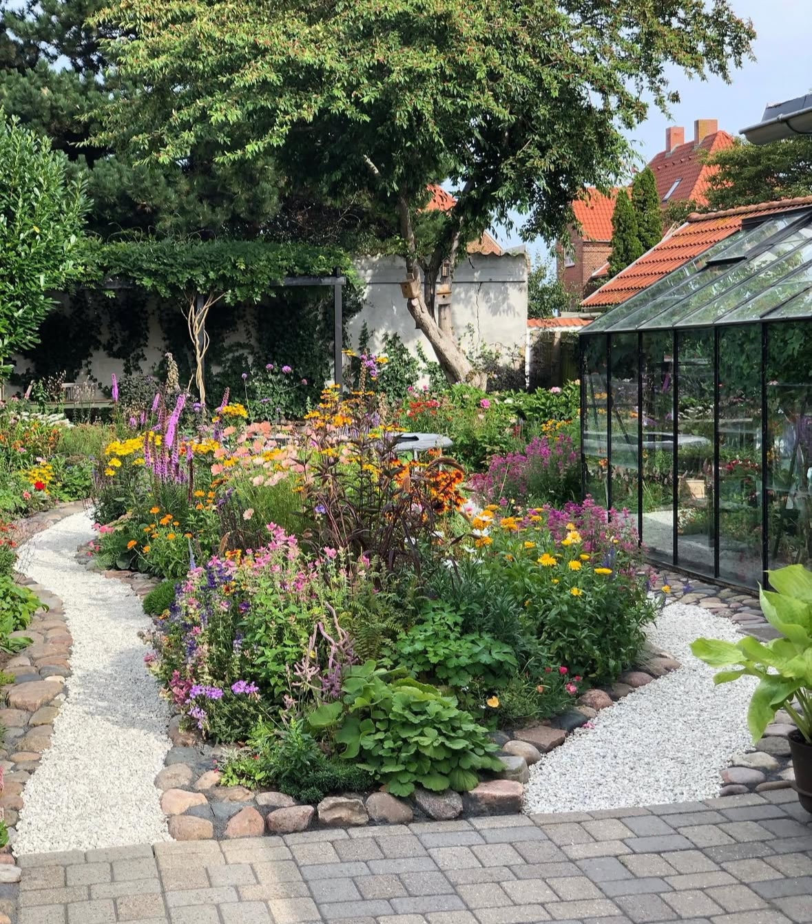 Der er store og små staudebede og snoede hvide stier så man kan gå på opdagelse i hele haven. Bedene er pakket med mange forskellige stauder som blomstrer på forskellige tidspunkter af året, fra det tidlige forår og helt indtil frosten kommer.