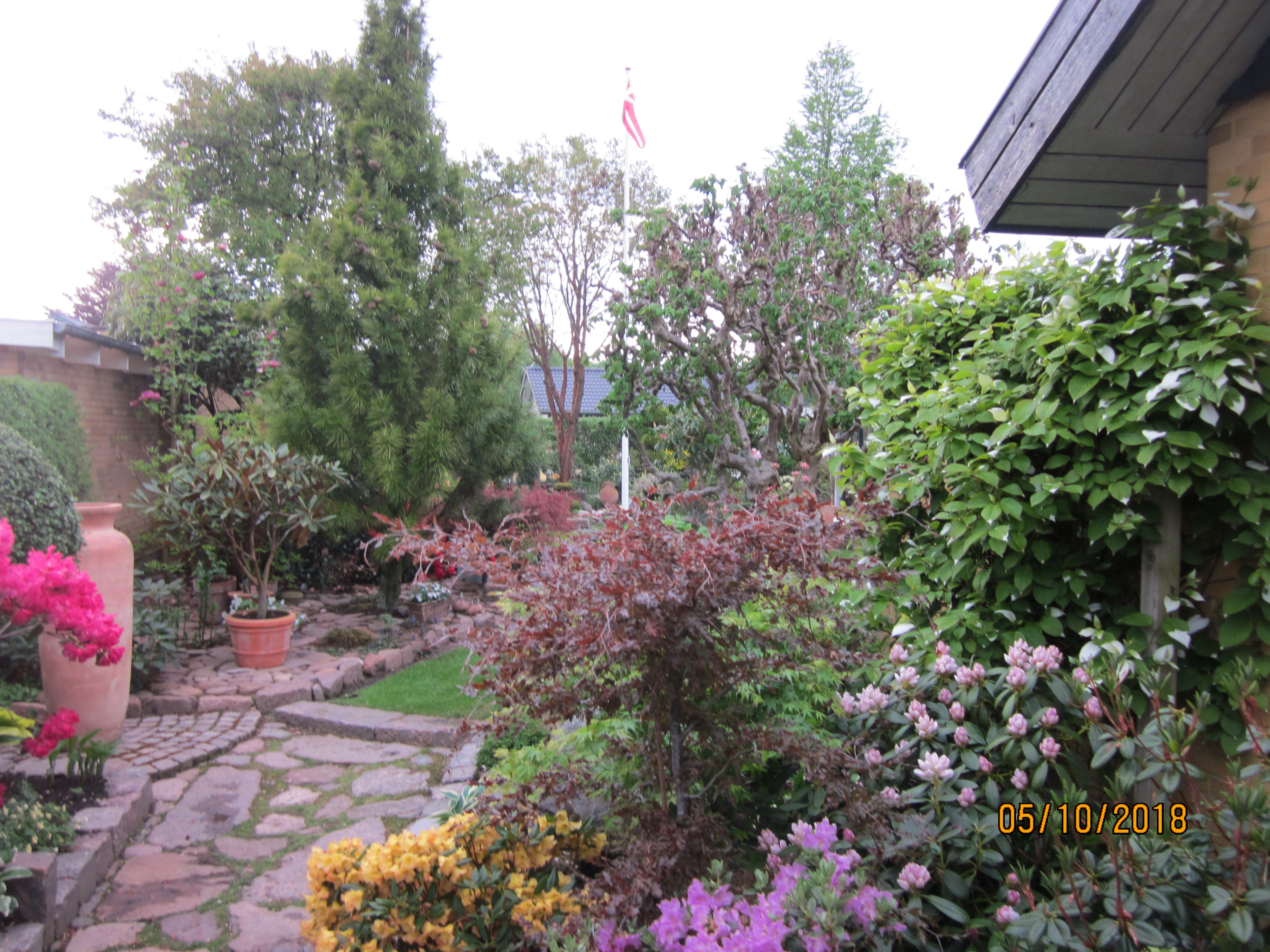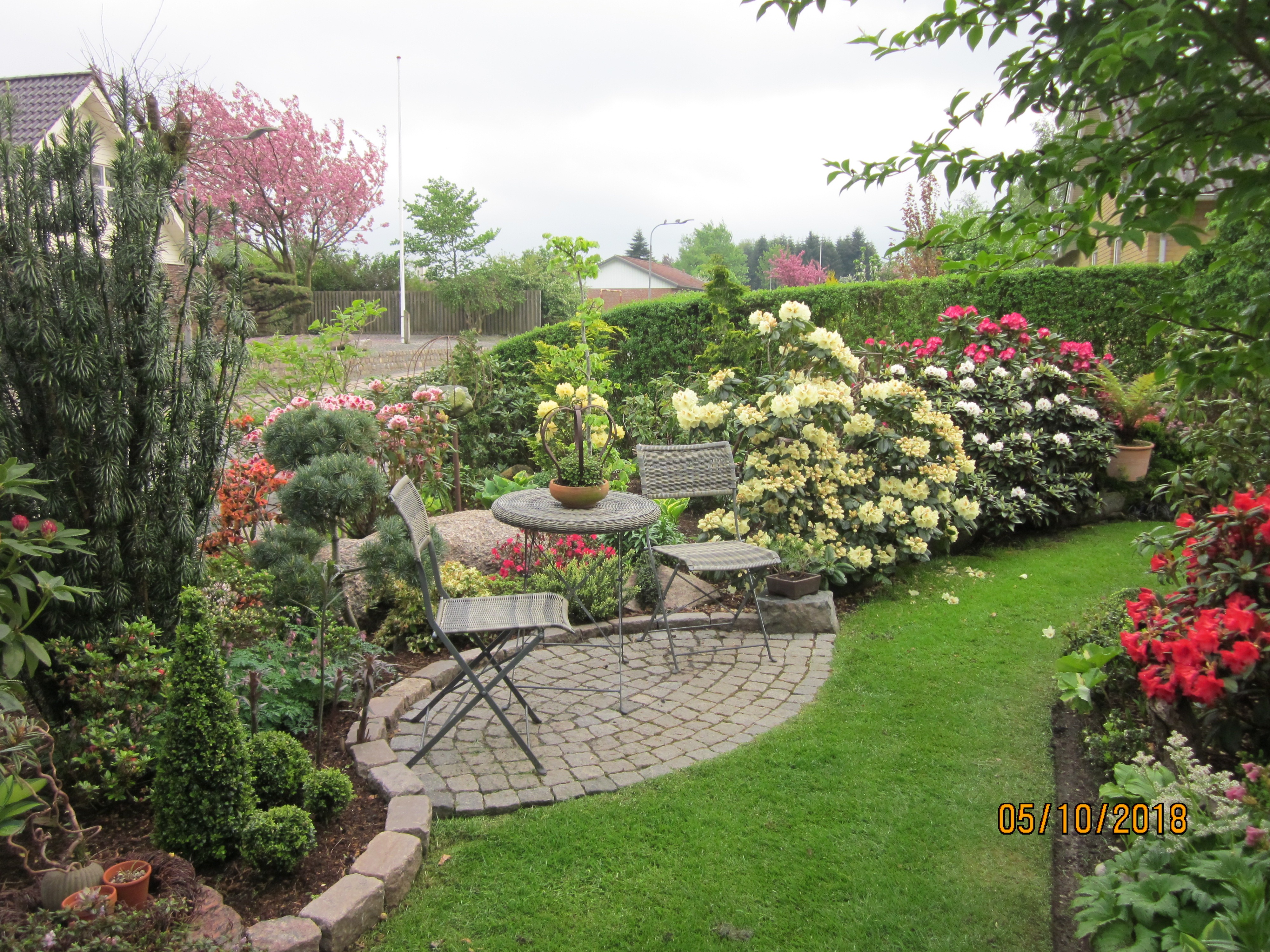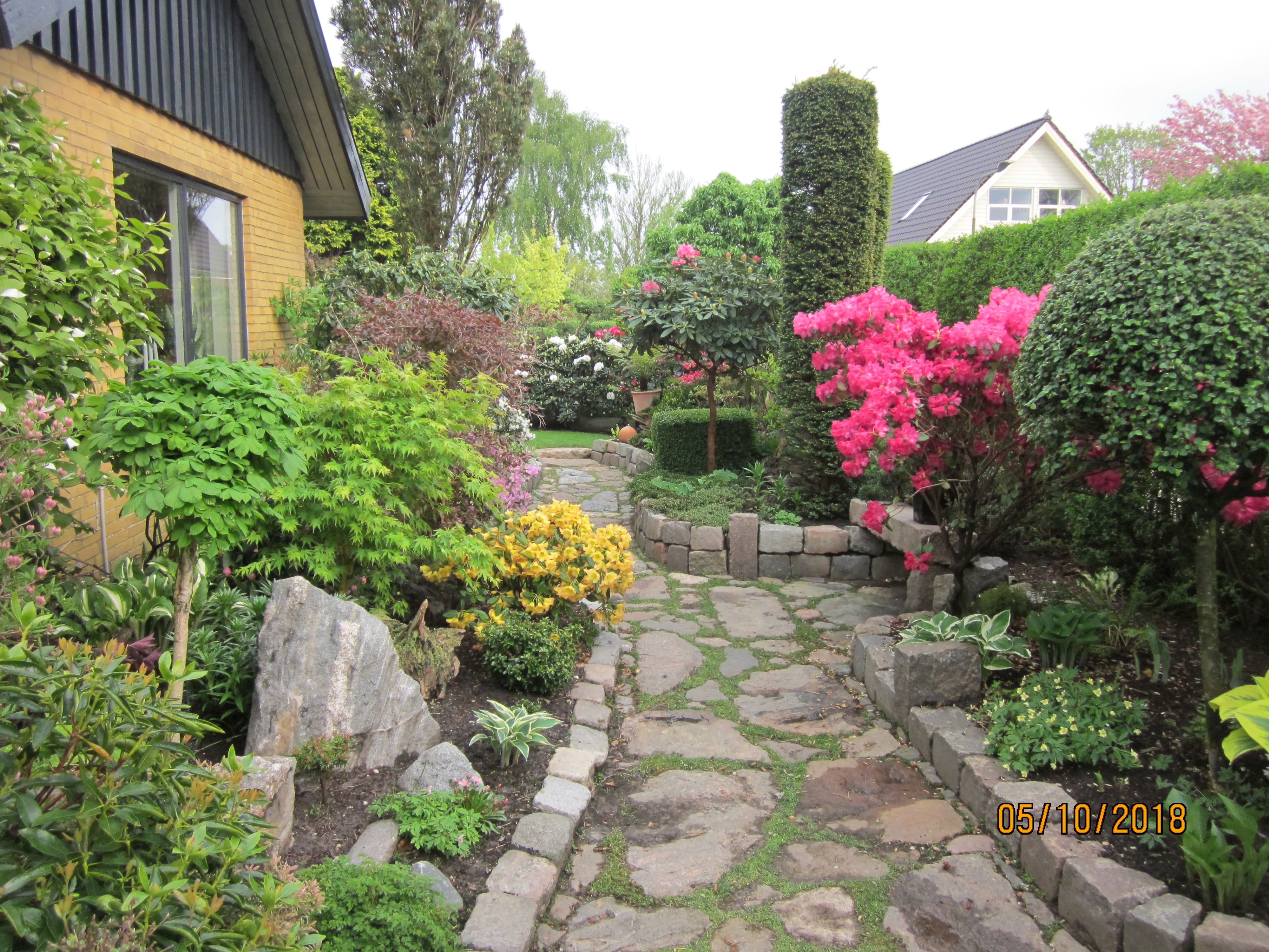 Haven er startet i 1972 i et nyt parcelhuskvarter, som en helt almindelig familie have med stor græsplæne , i starten af halvfemserne begyndte vi at forandre den til det den er i dag, det meste af græsset er skiftet ud med bede ,og der er brugt mange natursten i benene og på gangene, vi bruger mange surbundsplanter som Azalea og rhododendron, og en hel del Trillium og Orkideer er der også blevet plads til , samt et lille tuff bed, da haven ikke er så stor , holder vi træer og buske nede i størelse ved at formklippe dem, vi flytter jævnligt rundt på tingene i de forskellige bede. Vi nyder begge vores have, og bruger den flittigt , der er også lidt plantesalg.