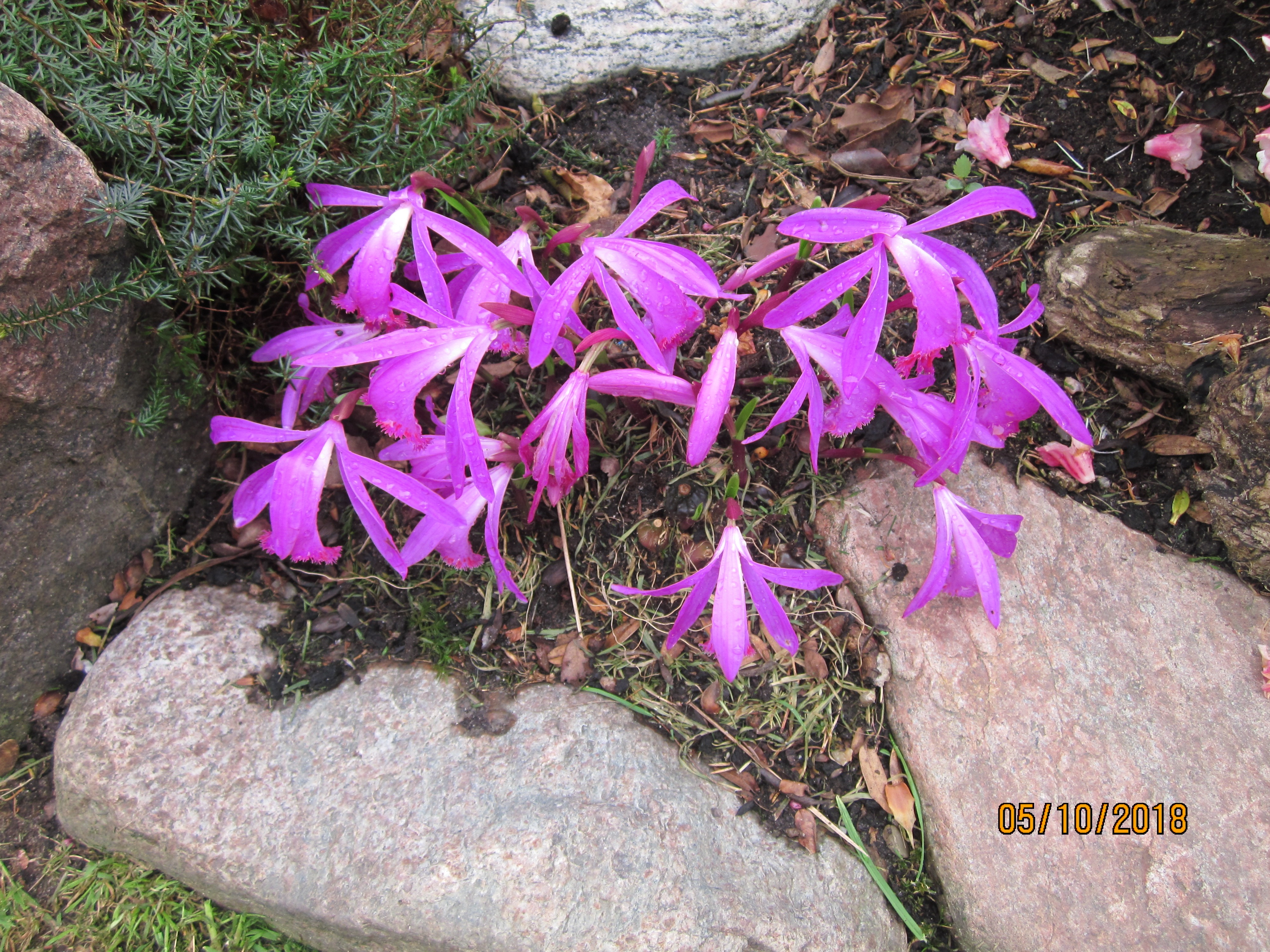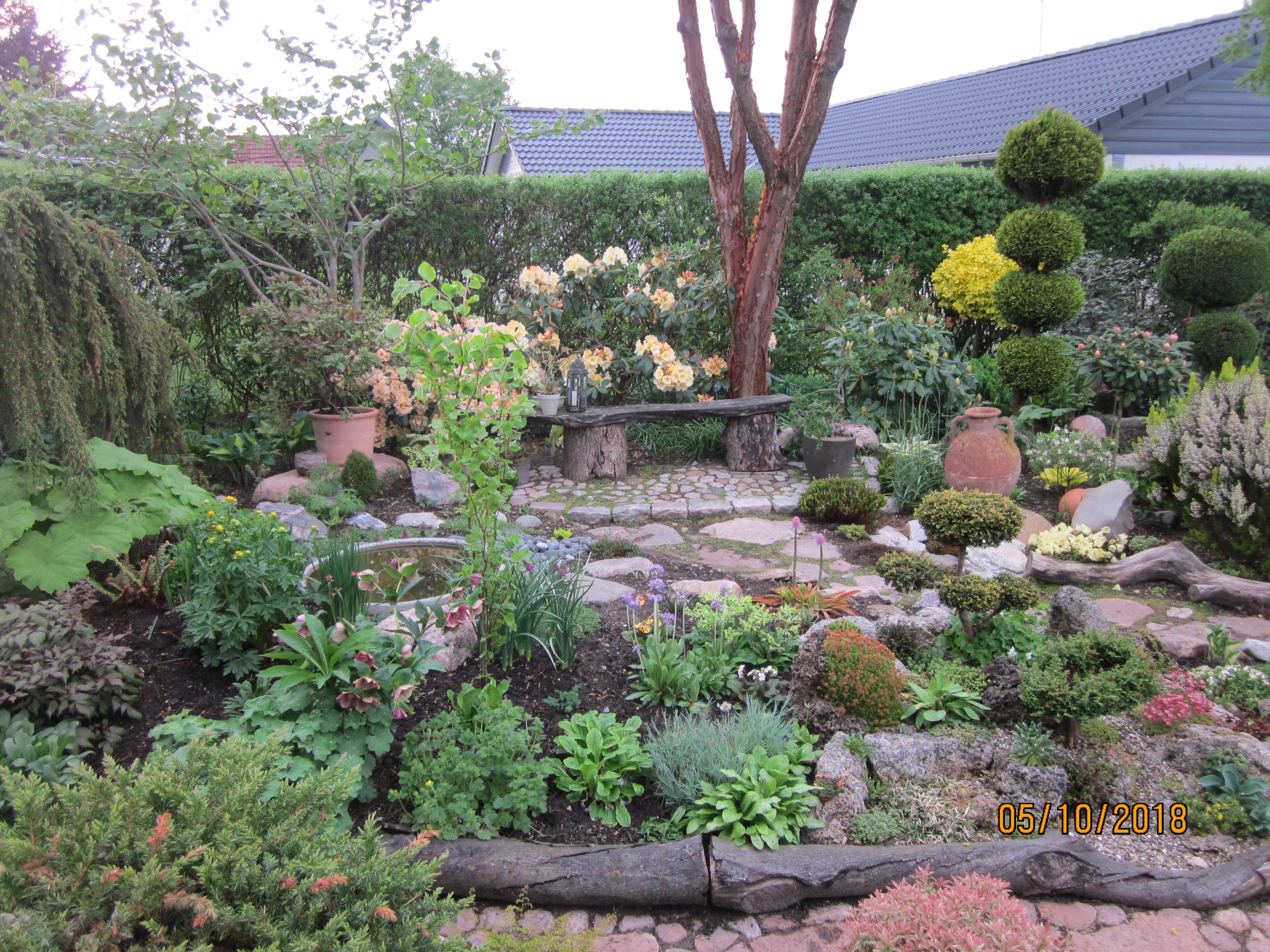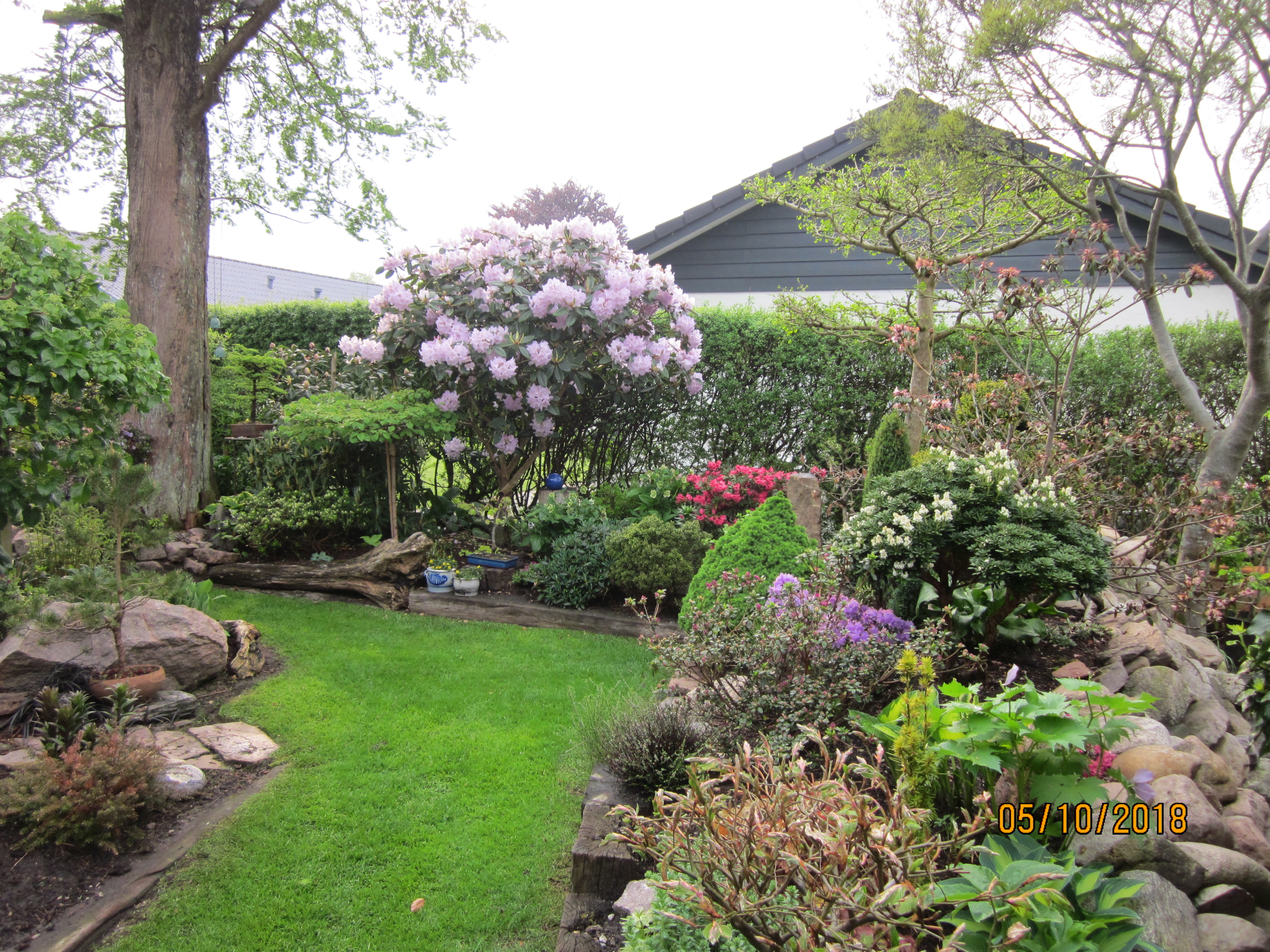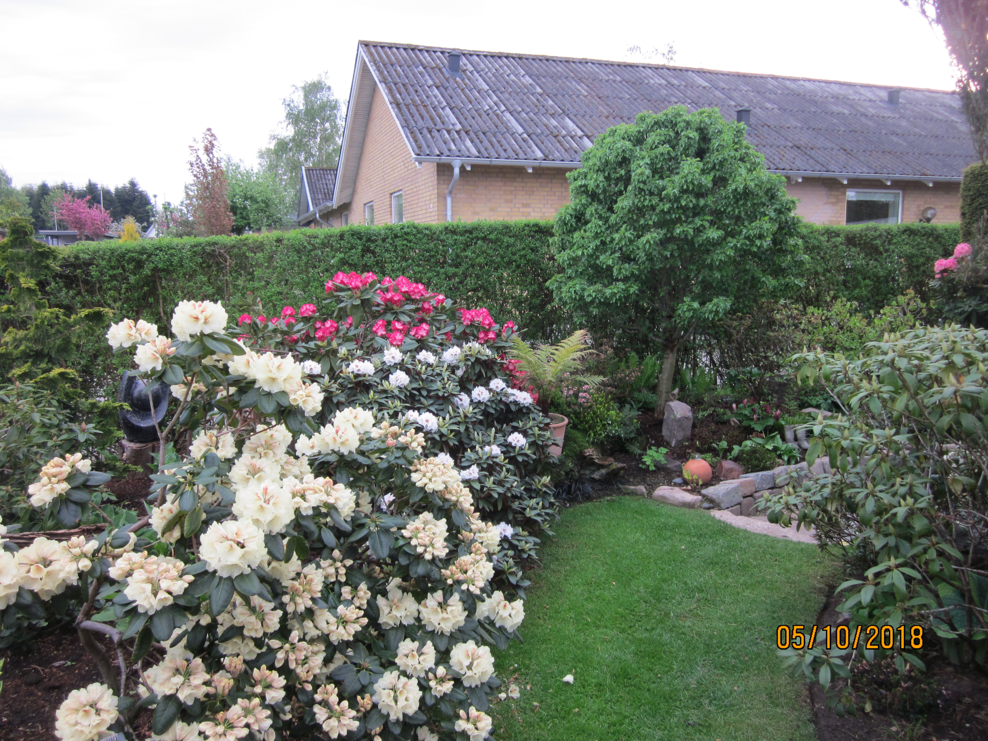 Haven er startet i 1972 i et nyt parcelhuskvarter, som en helt almindelig familie have med stor græsplæne , i starten af halvfemserne begyndte vi at forandre den til det den er i dag, det meste af græsset er skiftet ud med bede ,og der er brugt mange natursten i benene og på gangene, vi bruger mange surbundsplanter som Azalea og rhododendron, og en hel del Trillium og Orkideer er der også blevet plads til , samt et lille tuff bed, da haven ikke er så stor , holder vi træer og buske nede i størelse ved at formklippe dem, vi flytter jævnligt rundt på tingene i de forskellige bede. Vi nyder begge vores have, og bruger den flittigt , der er også lidt plantesalg.