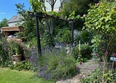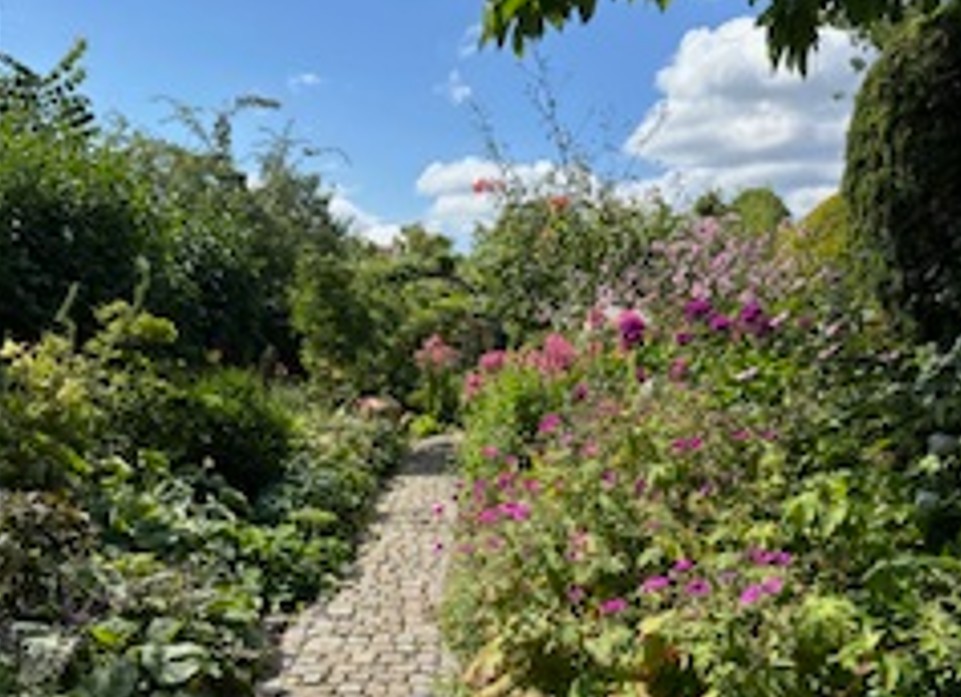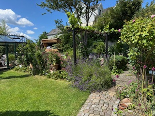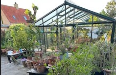 En have med drivhus , mange ikke vinterhårdføre planter såsom salvier, citrus og andet . Der er bistader i forhaven og drivhus med siddeplads og blomster i baghaven. Mange hyggekroge og spændende buske og træer.