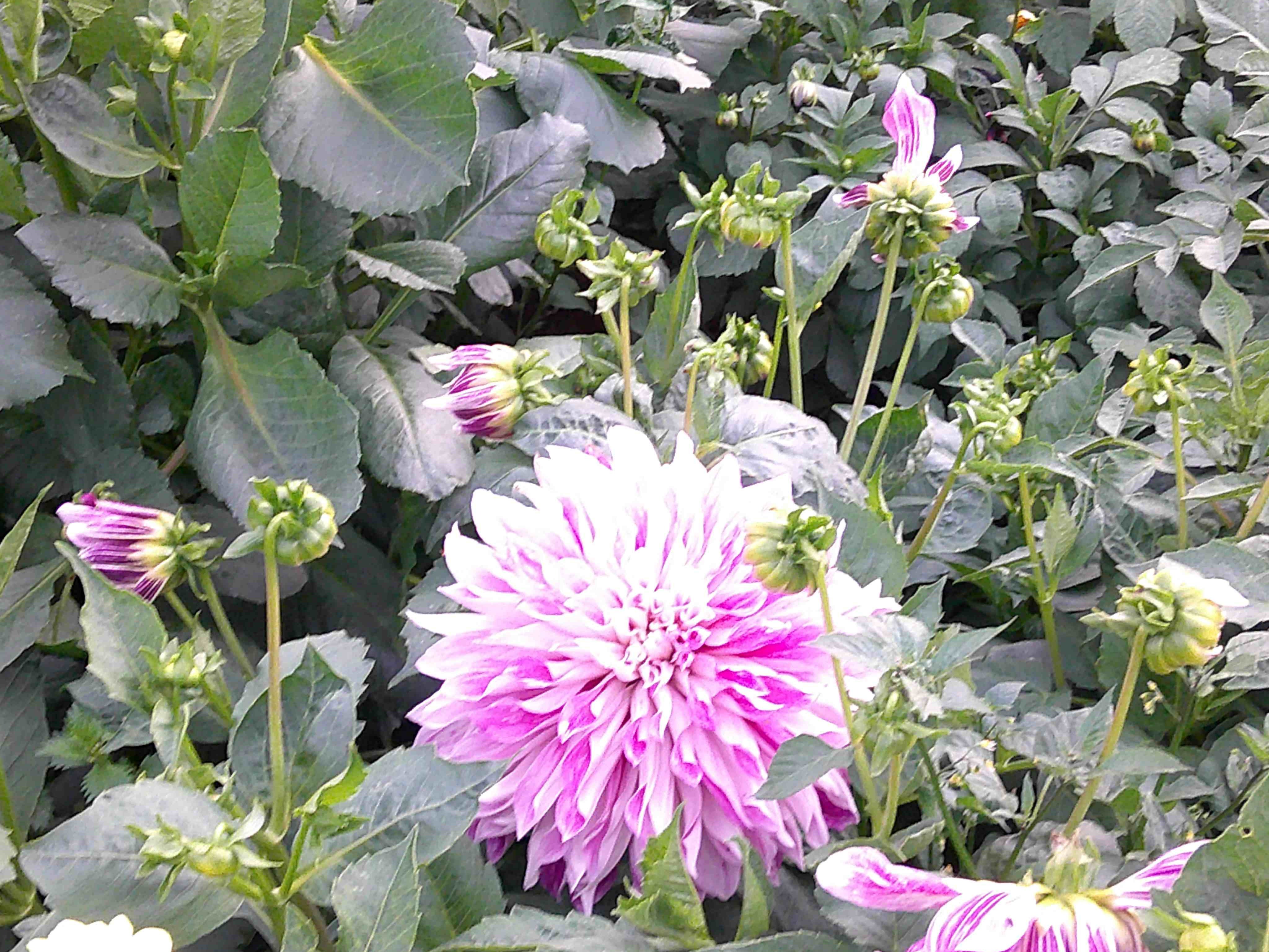 Langt over 500 geoginer i flere bed,,,, En nyskabelse i år er at bruge gamle bildæk som krukker til at plante i....