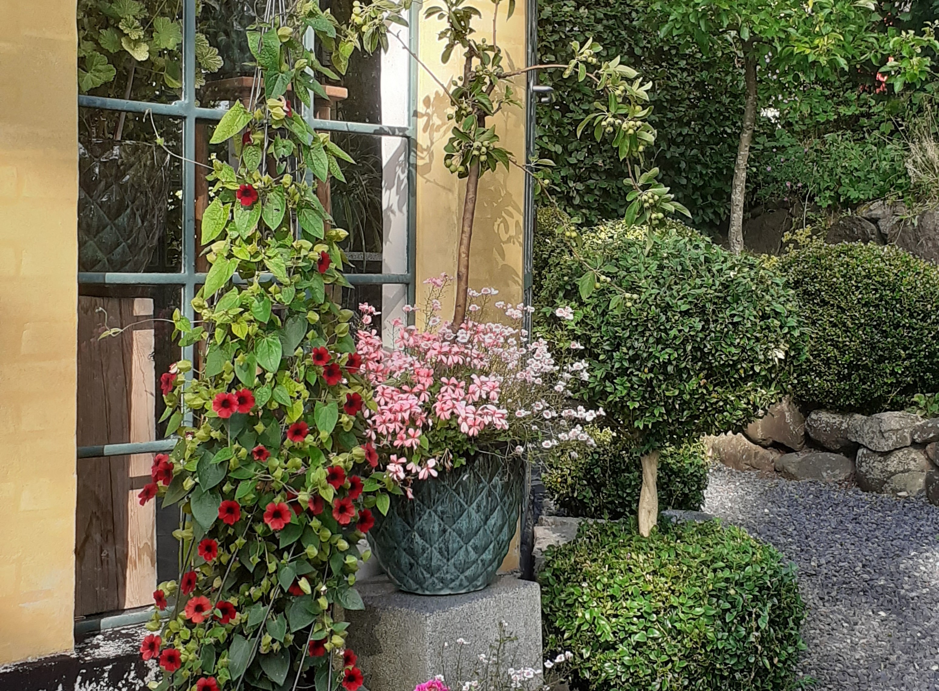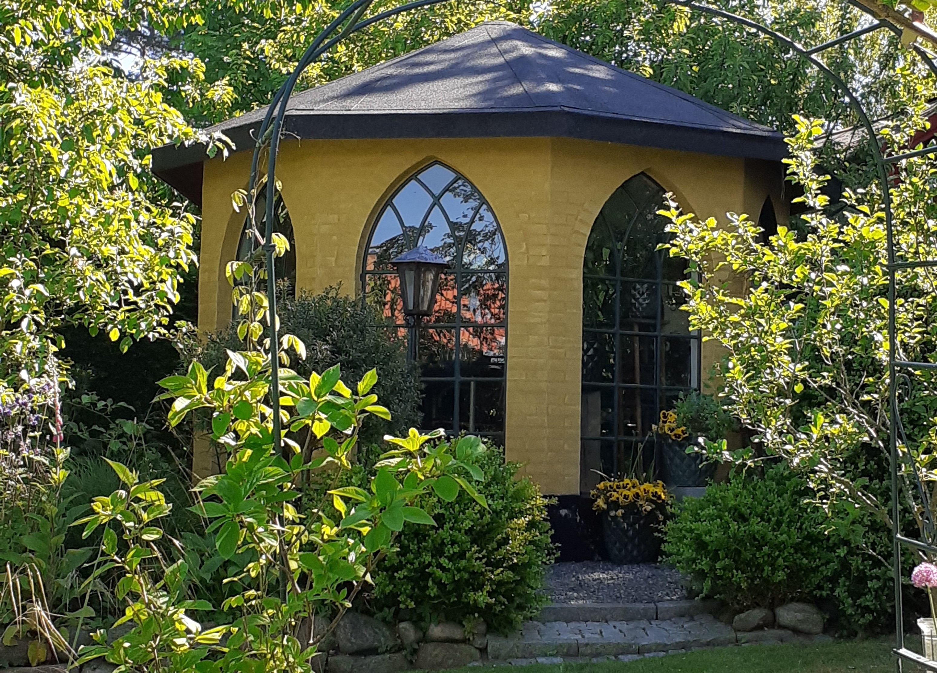 Frodig, finurlig, engelsk inspireret have, med lysthus, drivhus, "sommerhus" og masser af blomster