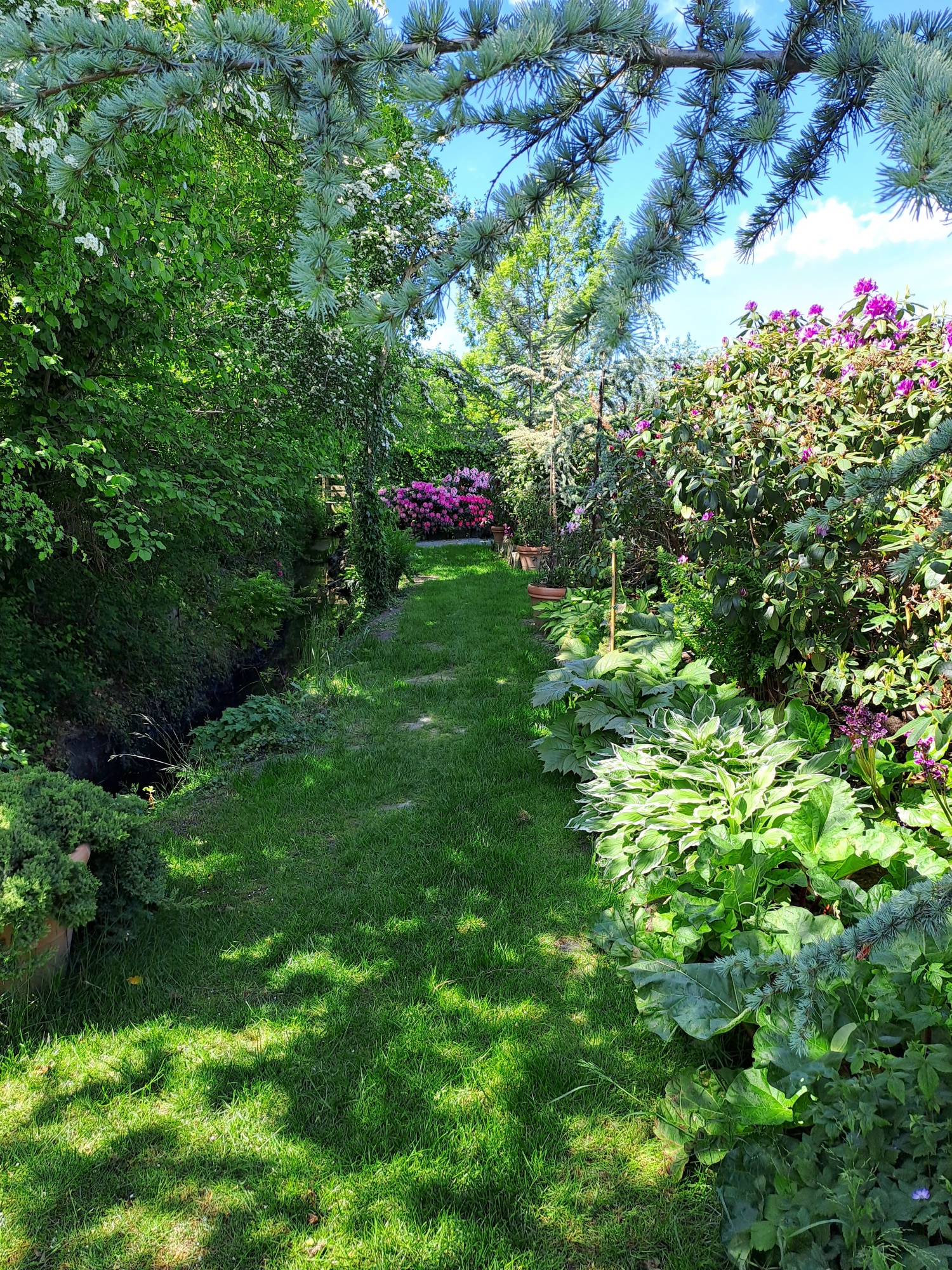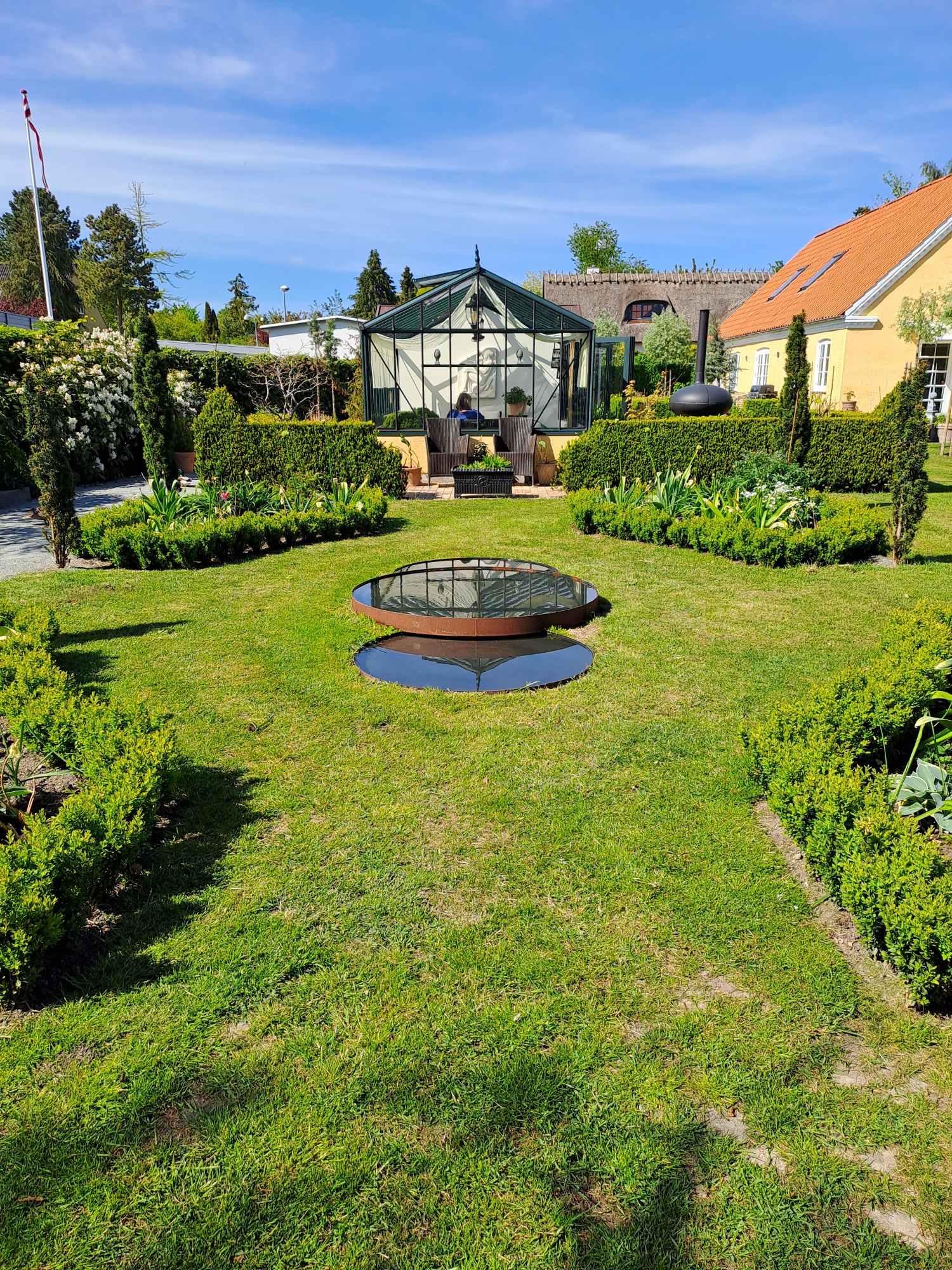 Haven på en 1700 m2 grund er tegnet af Greg og Stig fra Paradehuset og videreudviklet af os. De har hentet inspiration i slotshaver og haven byder derfor på en skarp geometri med mange lave hække i taks og buksbom. Vi har også anlagt en lille "barokhave" I haven er der højbede, krukker og bedafgrænsninger i egetræ og engelske potter og dekorationselementer i zink/galvaniseret stål (fra APG), samt en del i rustent jern. Der er også et lille orangeri bygget sammen med vores "garden shed" i egetræ med kobbertag. Belægninger er med granit, pigsten, klinker og stenmel. I haven findes en del buksbom, ca 100 rhododendron, Allium, mange agaphantus, lidt roser og stauder, cedertræer og pilebladet pære, og potugisisk kirsebærlaurbær og en del forskellige stedsegrønne planter. Bagerst i haven løber en lille bæk.. Vi har en del forskellige krukker (150+), som flyttes rundt sommer og vinter. Der sker hele tiden små ændringer i haven. For nem have. Det er vores filosofi at haven skal kræve mindre pasning, end det ser ud til. Vi sælger ud af overskudsplanter så udbuddet varierer: Hosta, trædebregner , Agaphantus, .Vi kan ikke garantere at alt er der, da der bliver solgt en del. Se evt vores annoncer på dba. Vi glæder os til at åbne have igen. De sidste vi sagde farvel til i 2022 var en familie fra Sønderjylland, der på vej hjem fra en Københavnstur overvejede om de skulle se på have i Tivoli eller besøge vores have. De fortalte at de var glade for at de valgte at besøge vores have - og det var vi også. Vi glæder os til at byde dig velkommen også.
