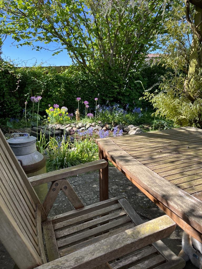 Parcelhushave på 1000 kvm, i vinteren 2021/22 fjernede vi en del græs og anlagde grusstier og bede. Flere sidepladser i haven, en lille sø, køkkenhaven er anlagt med højbede, der er 2 drivhuse, hvoraf det ene er sænket, kompostplads og høns.