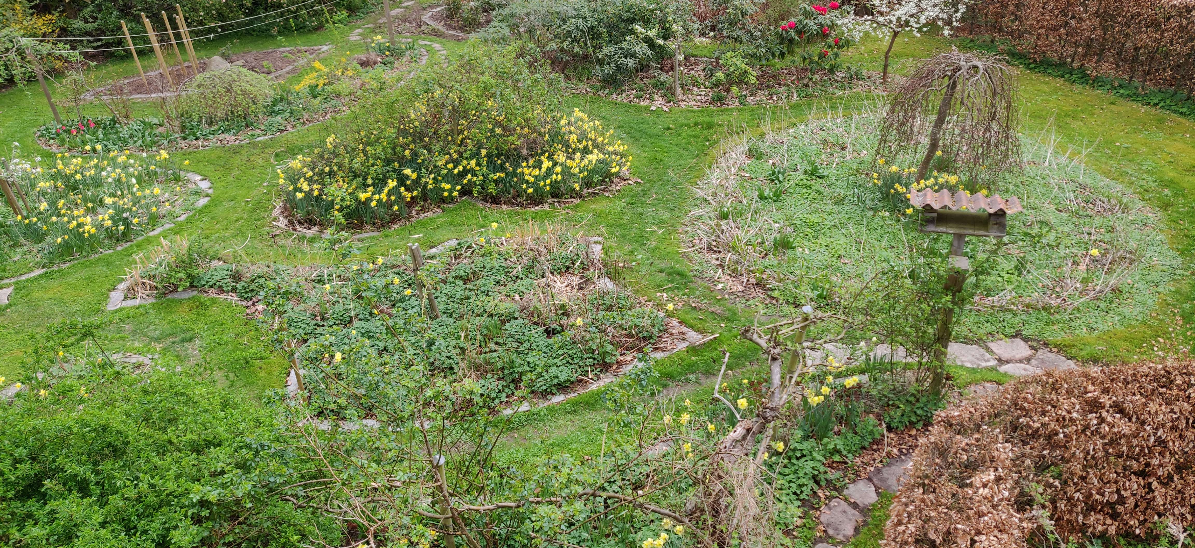 2200 kvadratmeter villahave med store bede kantet med brede granitkantsten.