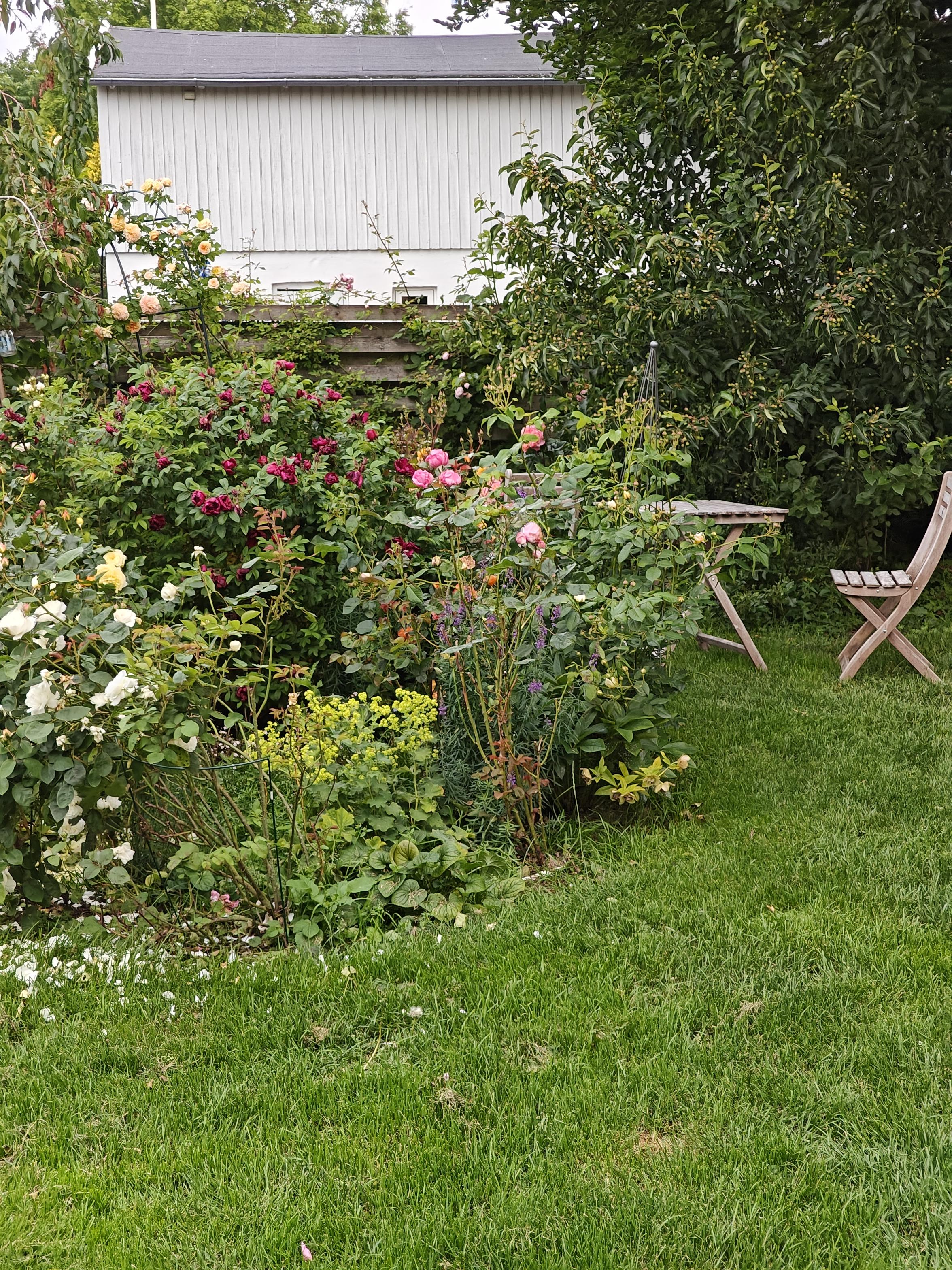 Byhave som har taget form de sidste fem år. Mere end 120 forskellige roser. Engelskinspireret cottagehave