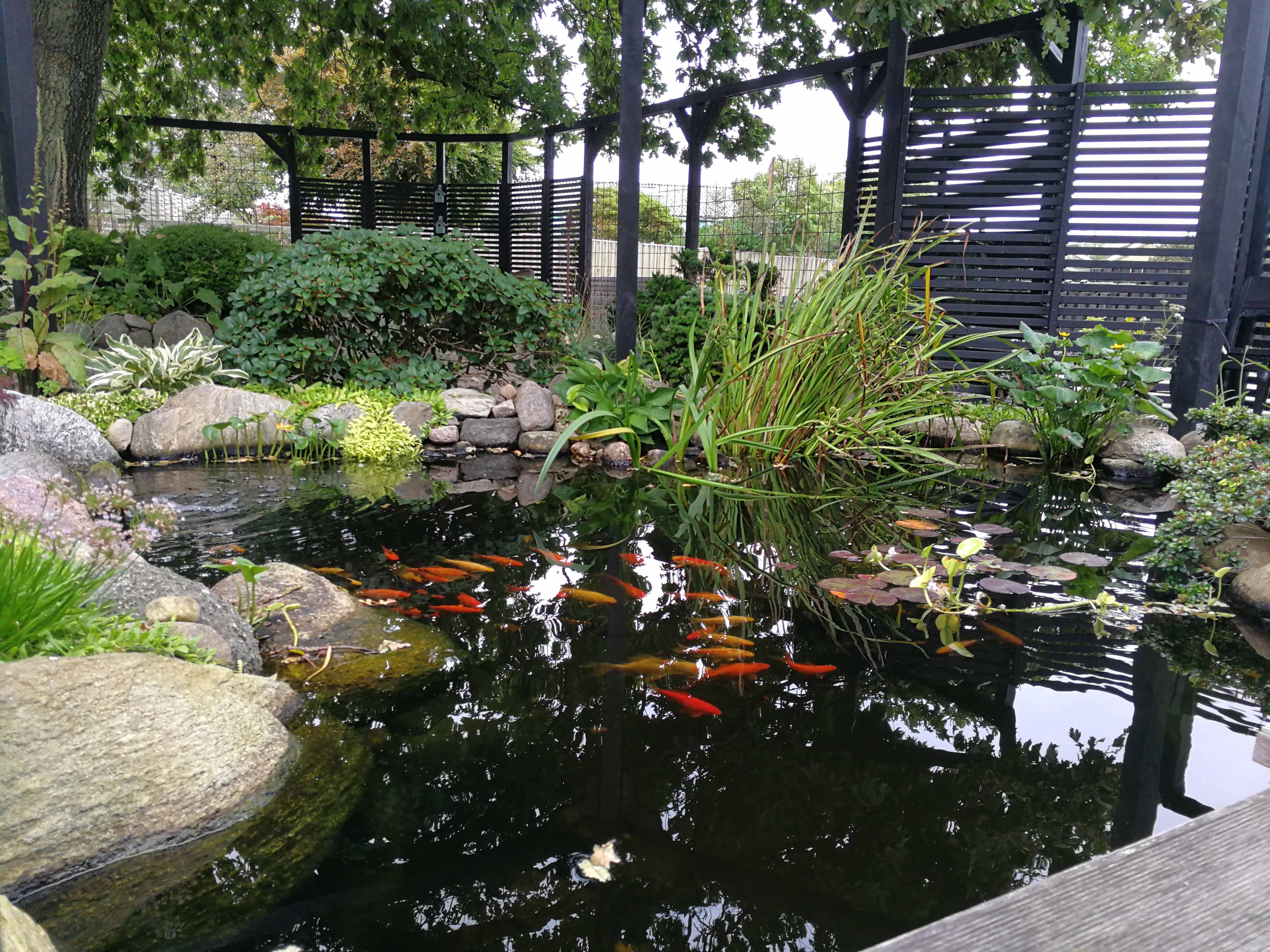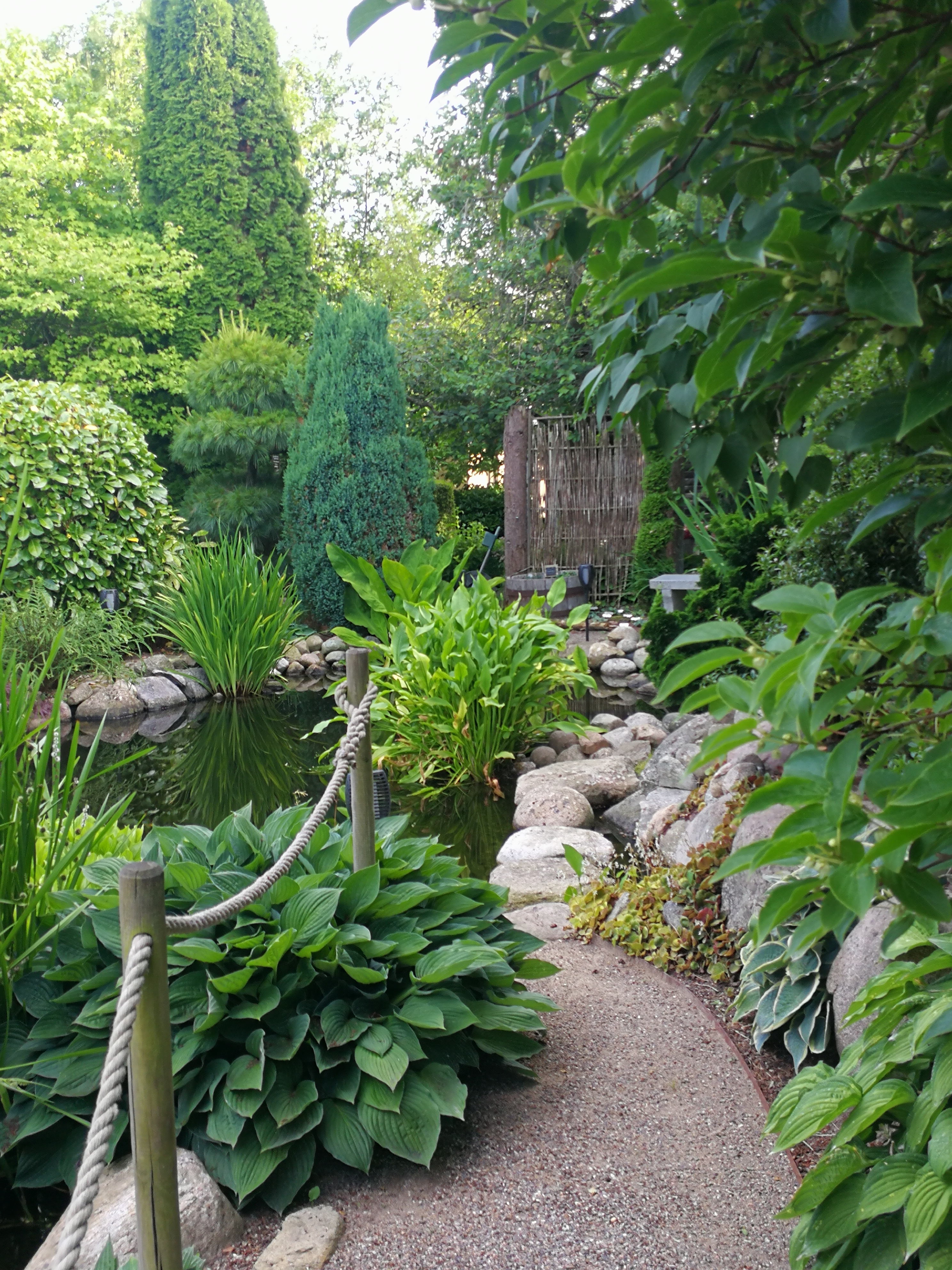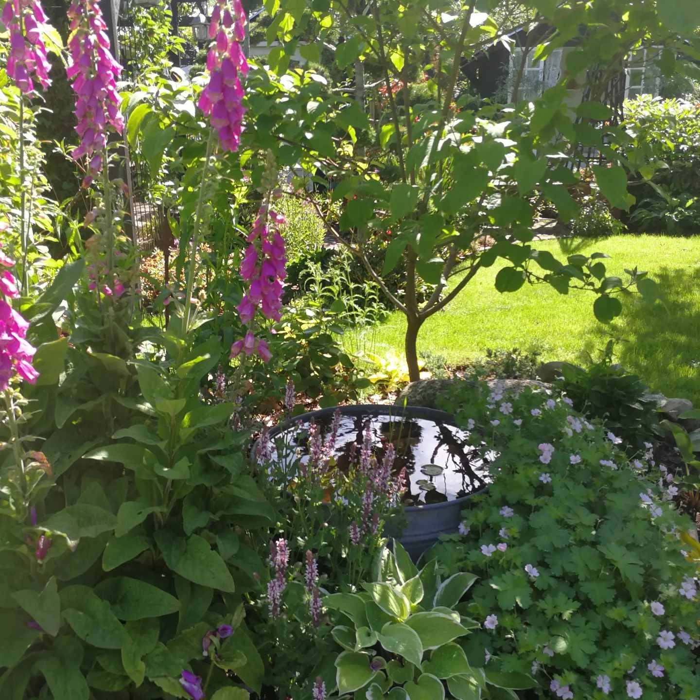 Havens mange planter består hovedsageligt af stedsegrønt og hosta.