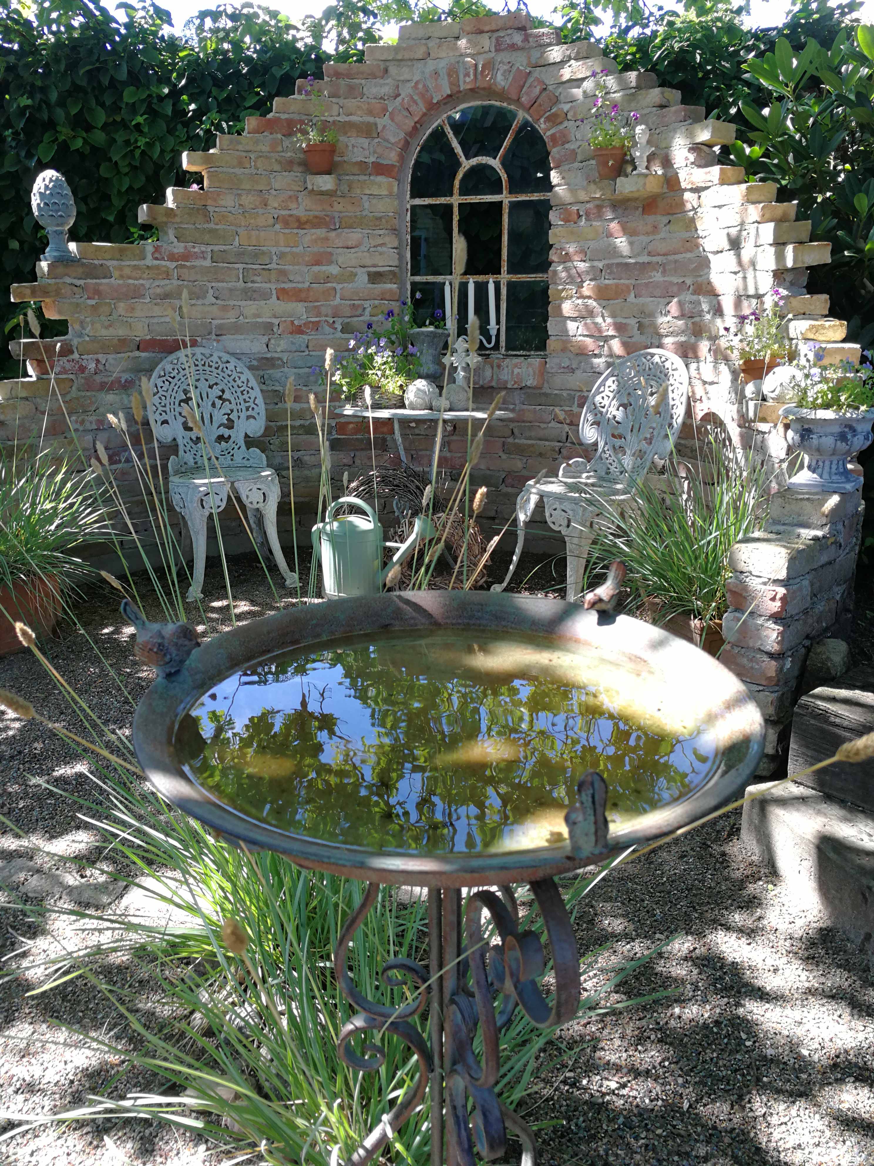 Ved havens sydvendte terrasse ligger den 30 m3 store sø, der udover byder haven på en mindre sø, samt flere små vandhuller og vandfade. Over alt i haven er der siddepladser, hvorfra haven kan nydes, og alle steder er der små finurlige indslag.