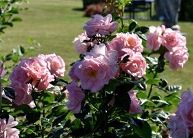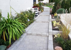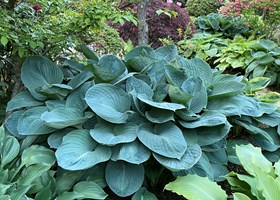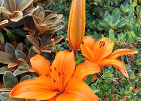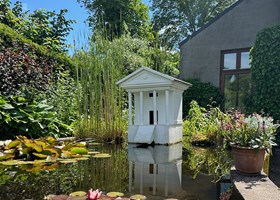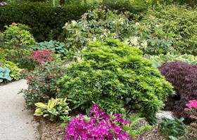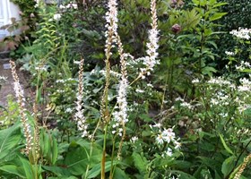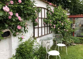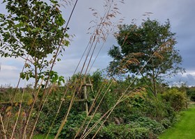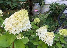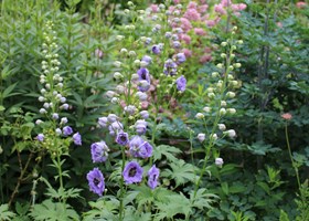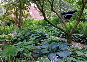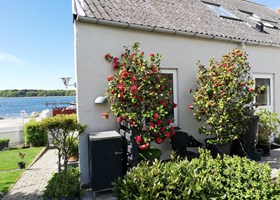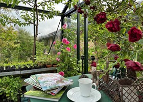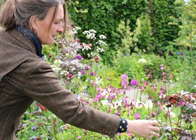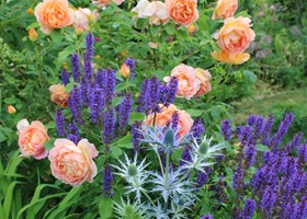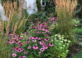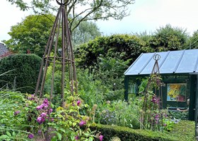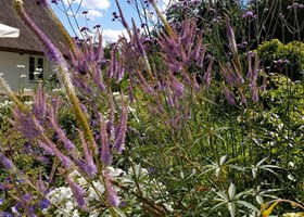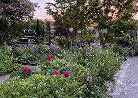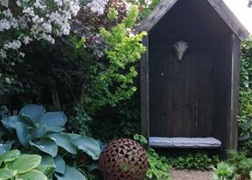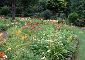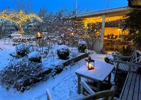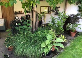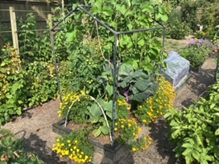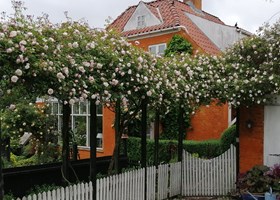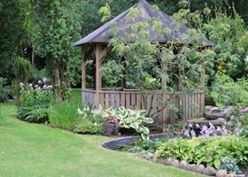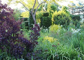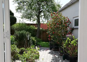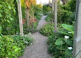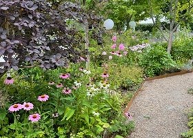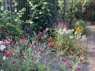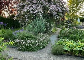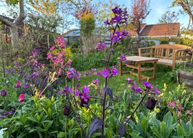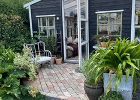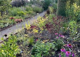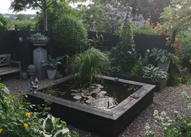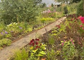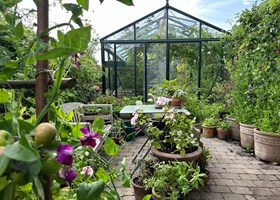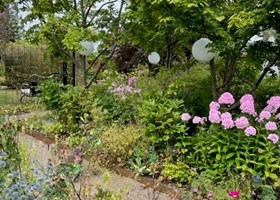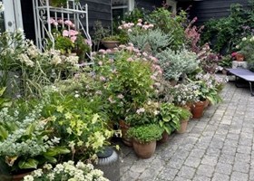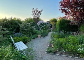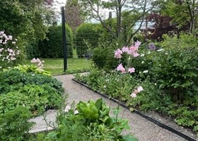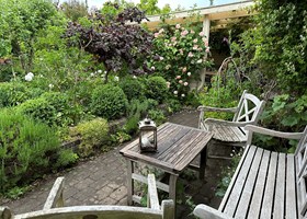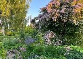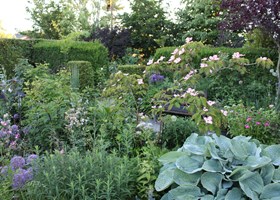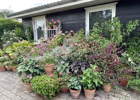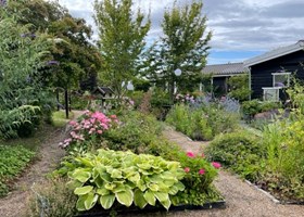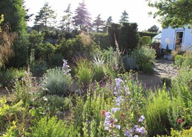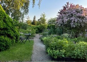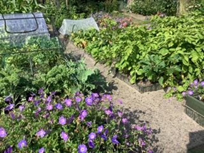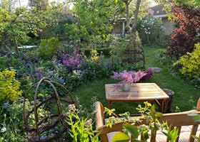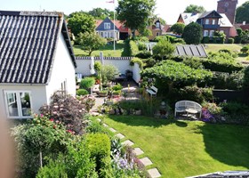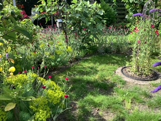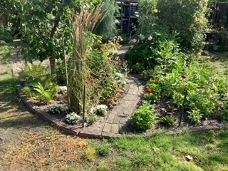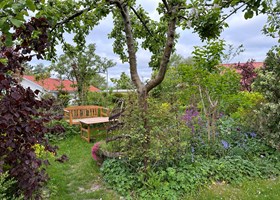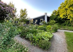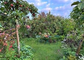 Parcelhushave med mange blomstrende bede. Frugttræer, frugtbuske og køkkenhave gør haven næsten selvforsynende.