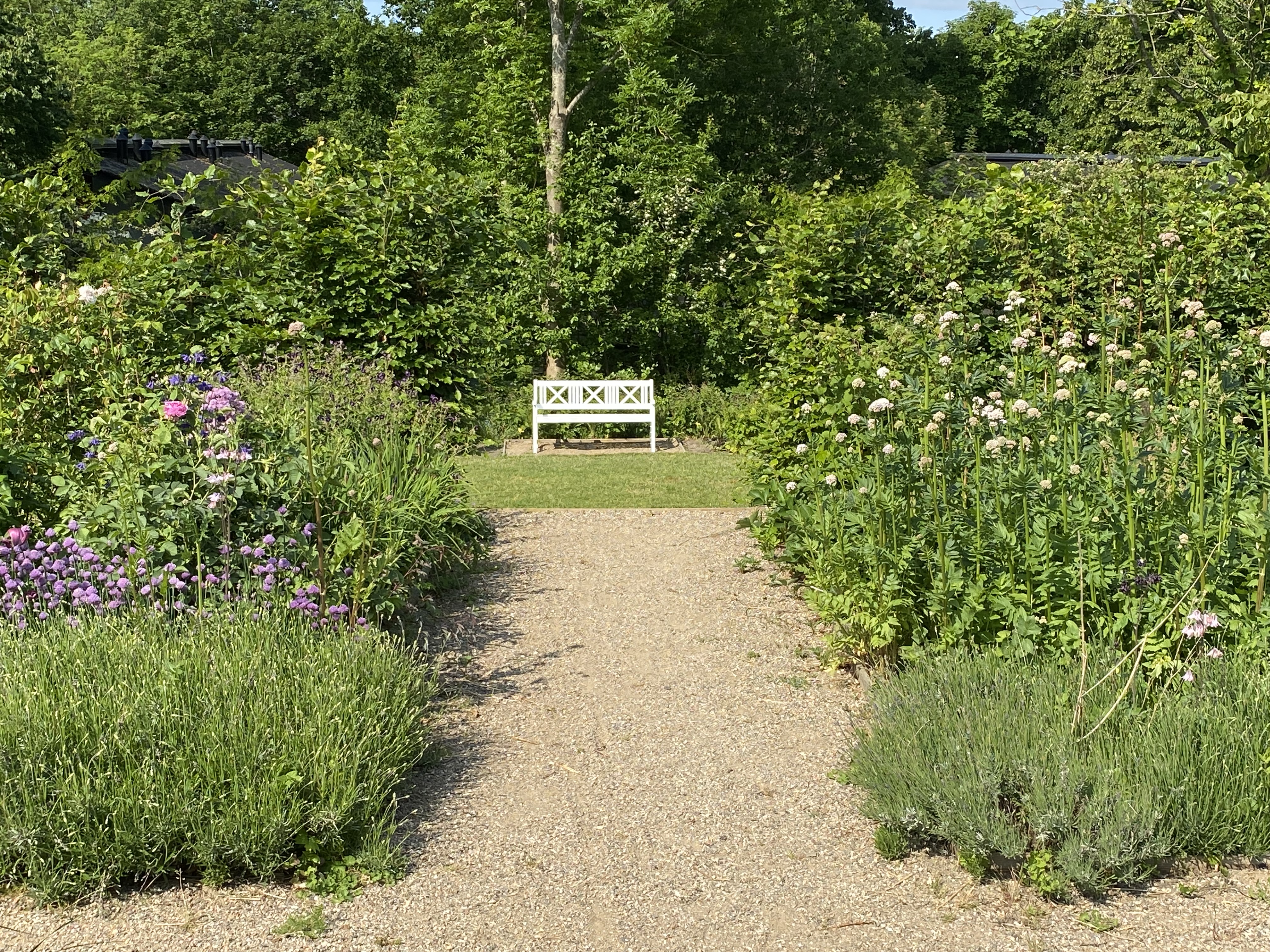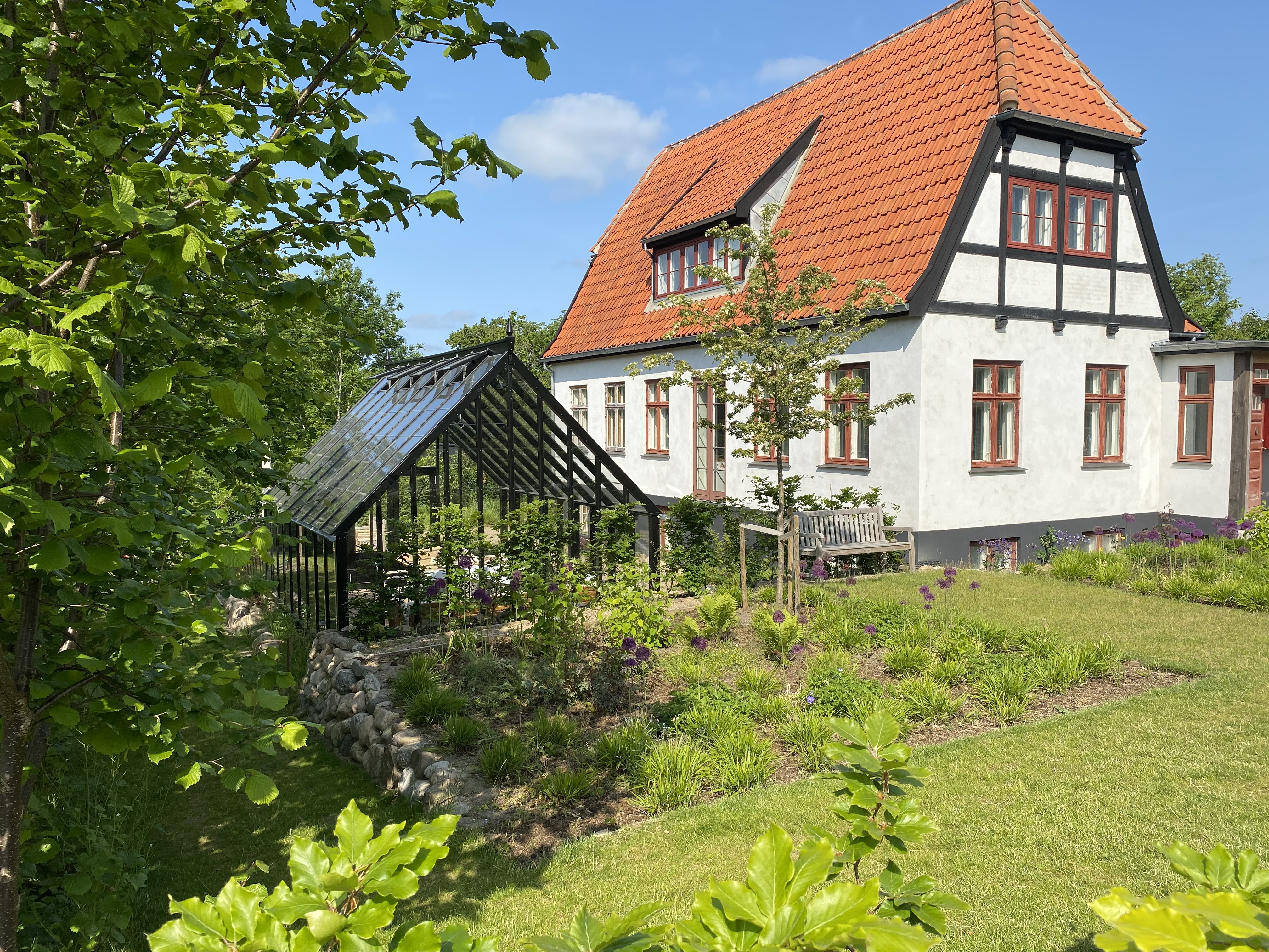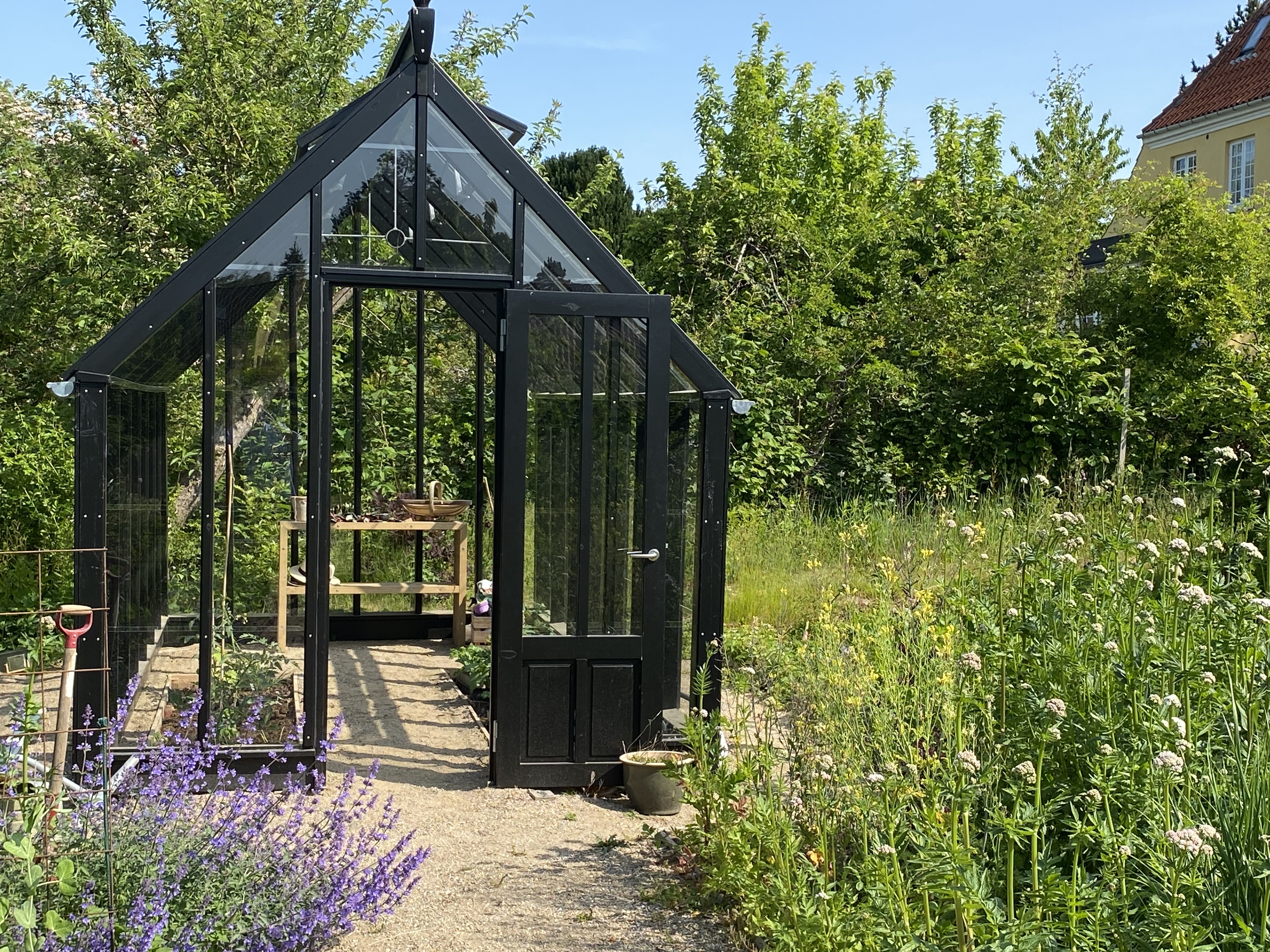 Terrasseret have på knap 1600 kvm med hække, der inddeler haven i forskellige rum med nyttehave, staudebede, æblehave og to drivhuse