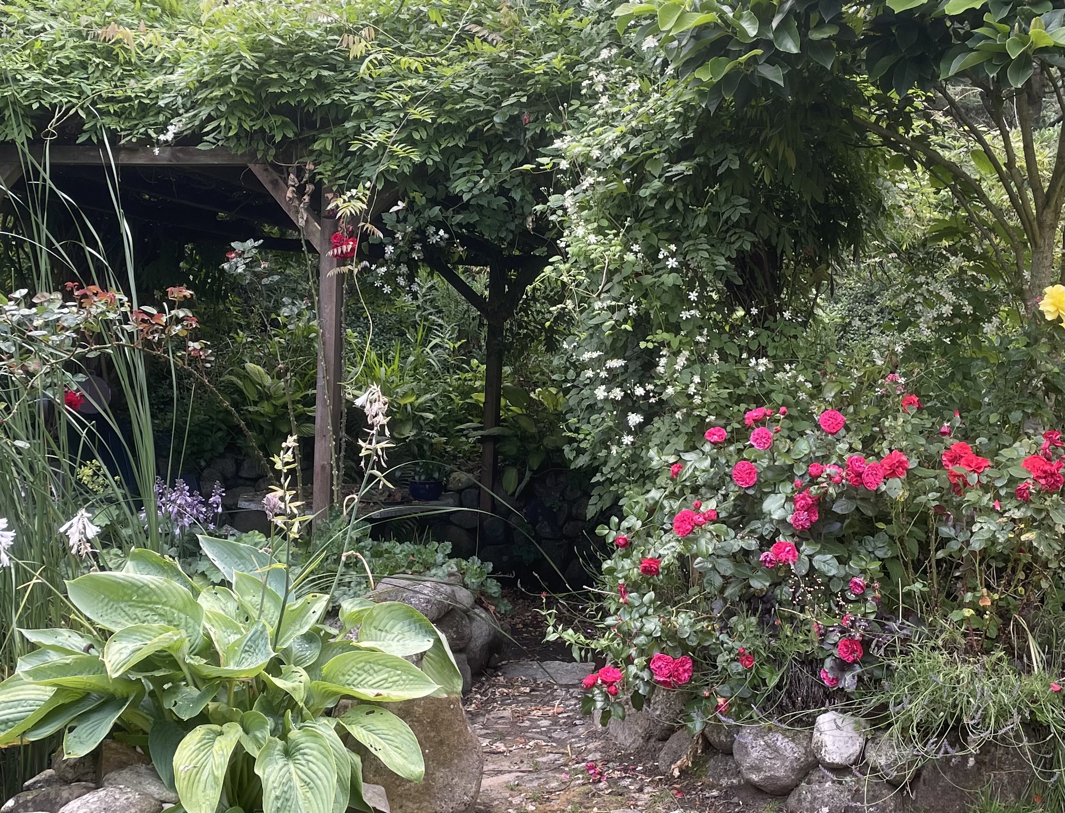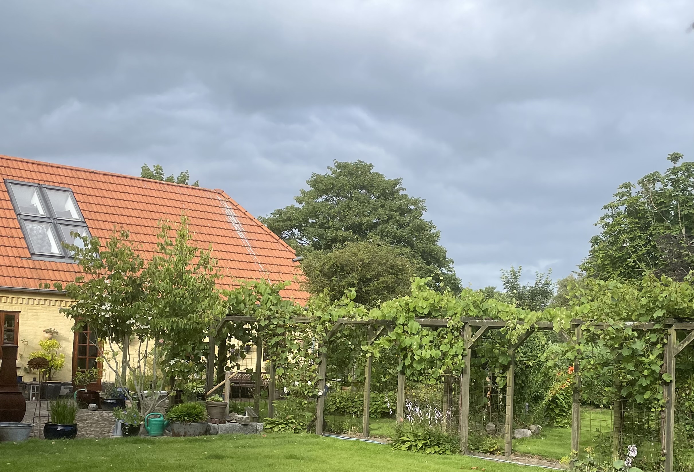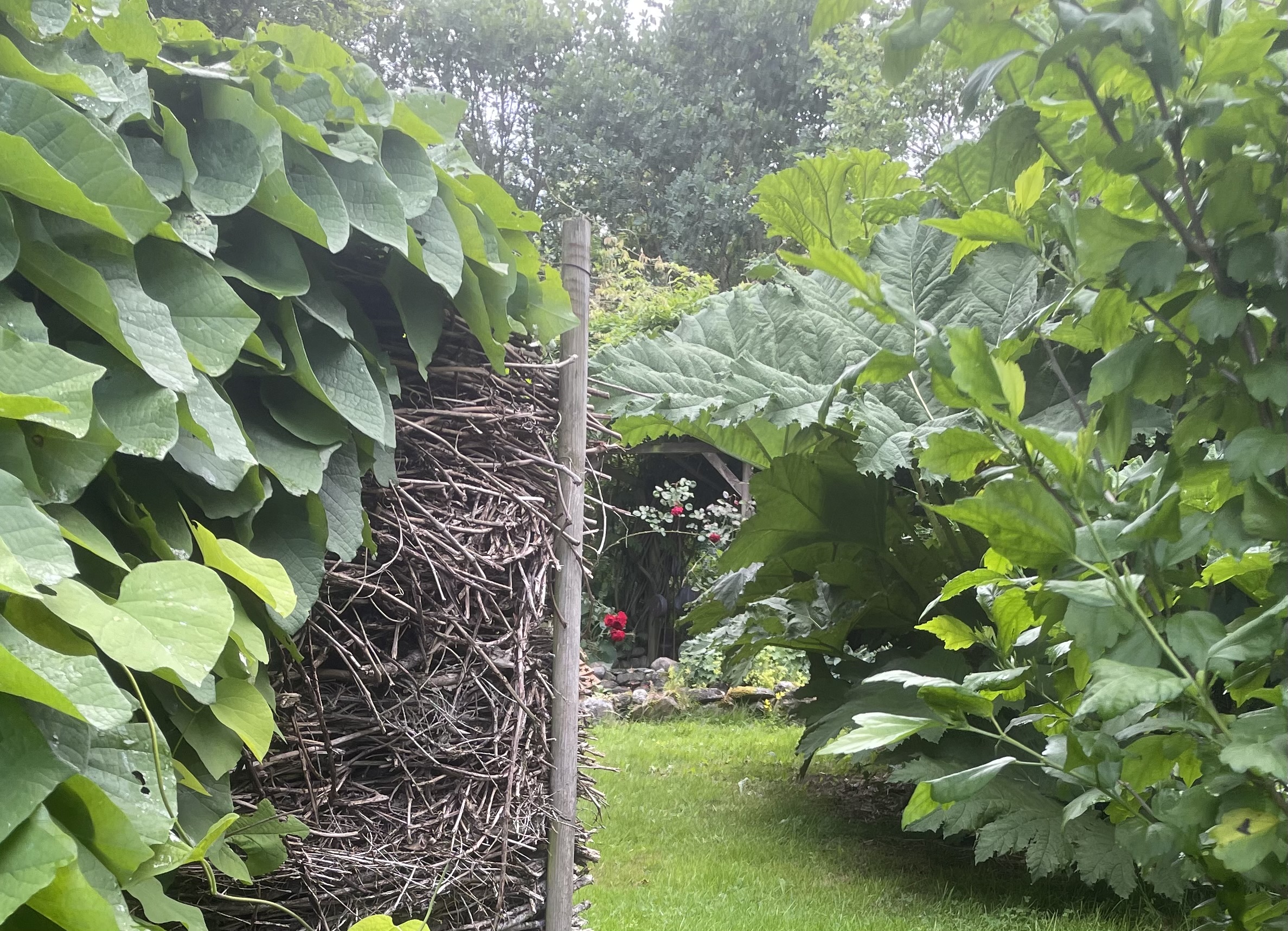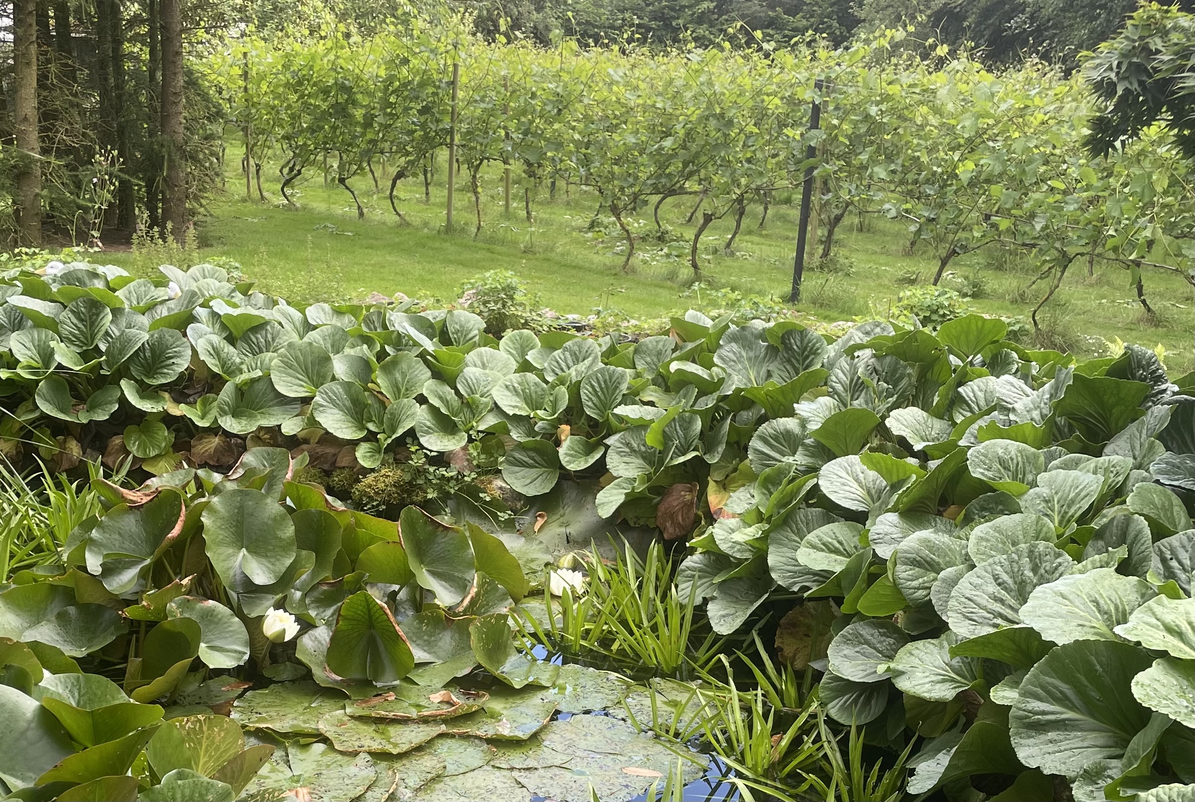 Have med bær, vinplanter, roser, små søer, vandløb, vandplask, med siddesteder i nærheden til at nyde vandet. Der er hostaer, græs, stenstier, pergola, høns og drivhuse, med plads til både ukrudt og insekter.