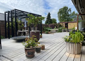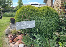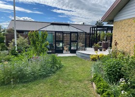 I haven er der staudebede med mange blomster, drivhus, køkkenhave, krukker, højbede med skærehave, bistader og frugt.