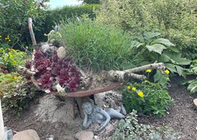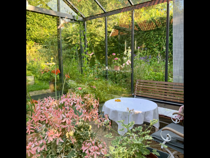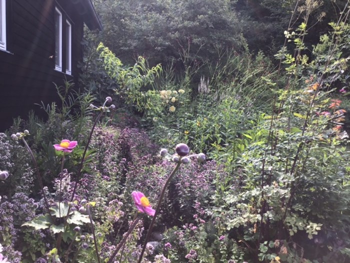 Staudebedene får lov til at udvikle sig ret frit. I drivhuset gror mange slags tomater, her er også rosenslynger og cobea samt en del botaniske pelargonier. I krukker står en lille samling solbærsalvier. Køkkenhaven er en blanding af grøntsager og blomster.