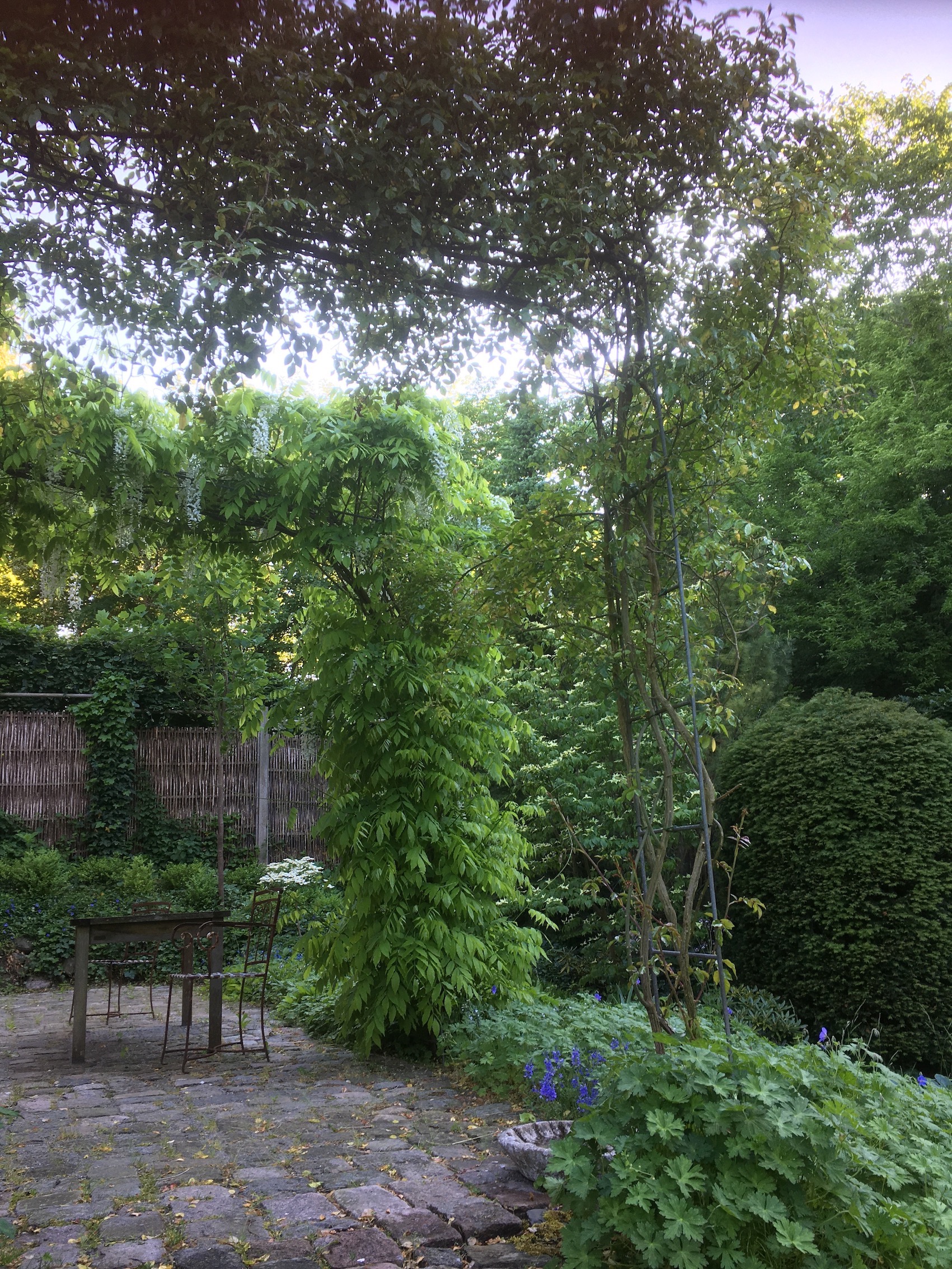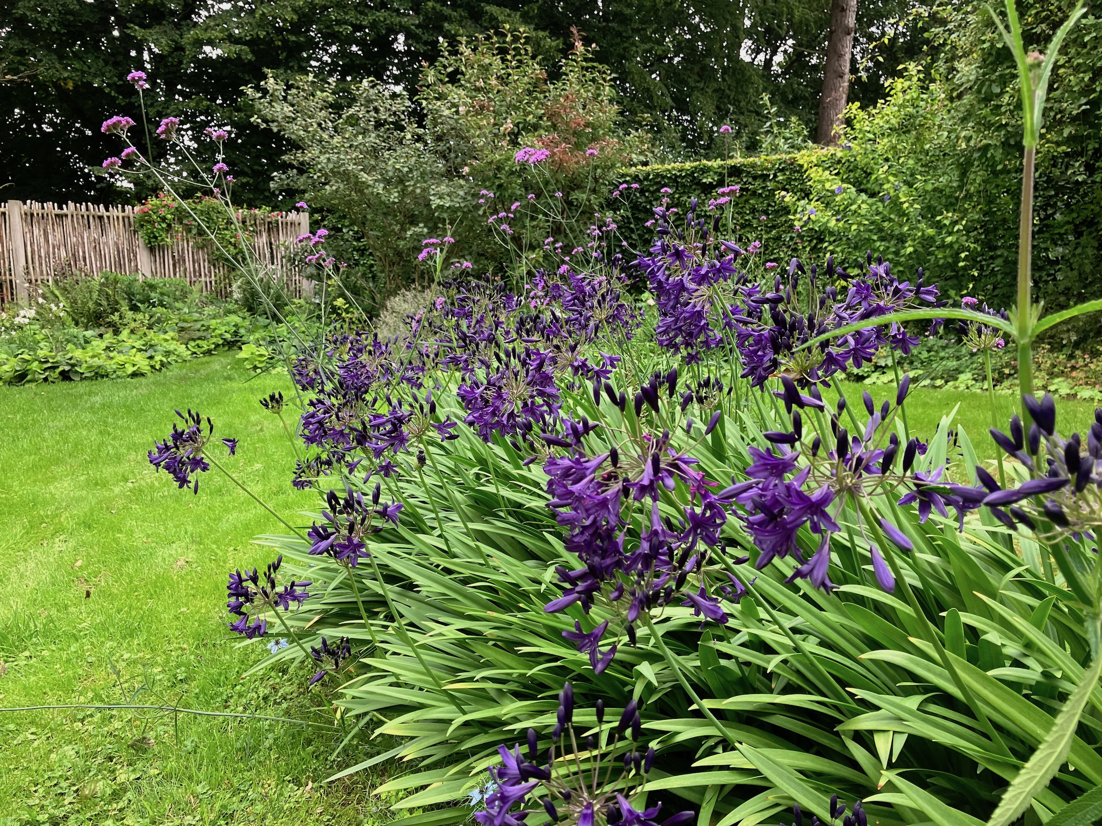 Haven er meget skrånende med mange trapper, så ikke egnet for gangbesværede. Det betyder også, at jeg har nogle besværlige skrænter, der ligger i skygge, selv efeu har nogle steder givet op? Mine agapanthus står i jorden, overvintrer ude, tildækket. Det er lykkedes i mange år (de ældste er ca 20 år). Når jeg tror, at nu er jeg færdig med at plante, dukker der altid nye fristelser op, der kan forbedre staudebedene. Træpæoner kan jeg ikke stå for, der står 6 forskellige mellem stauderne. Af andre favoritter er der hvide høstanemoner og floks til sensommer/tidlig efterår, jeg har altid hvide blomster i haven.