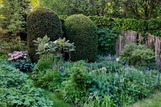 Staudebede: hvidt, rosa, blåt.Kontrast bla mørk hyld og sølvlys. Clematis, roser-espalier. Agapanthus ca 20( 4 slags).