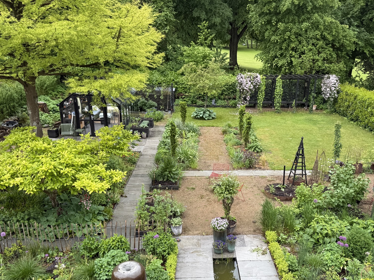 Parcelhushave med mange haverum: gårdhave, drivhus, køkkenhave, vand, staudebede, skærehavebede og lille køkkenhave.