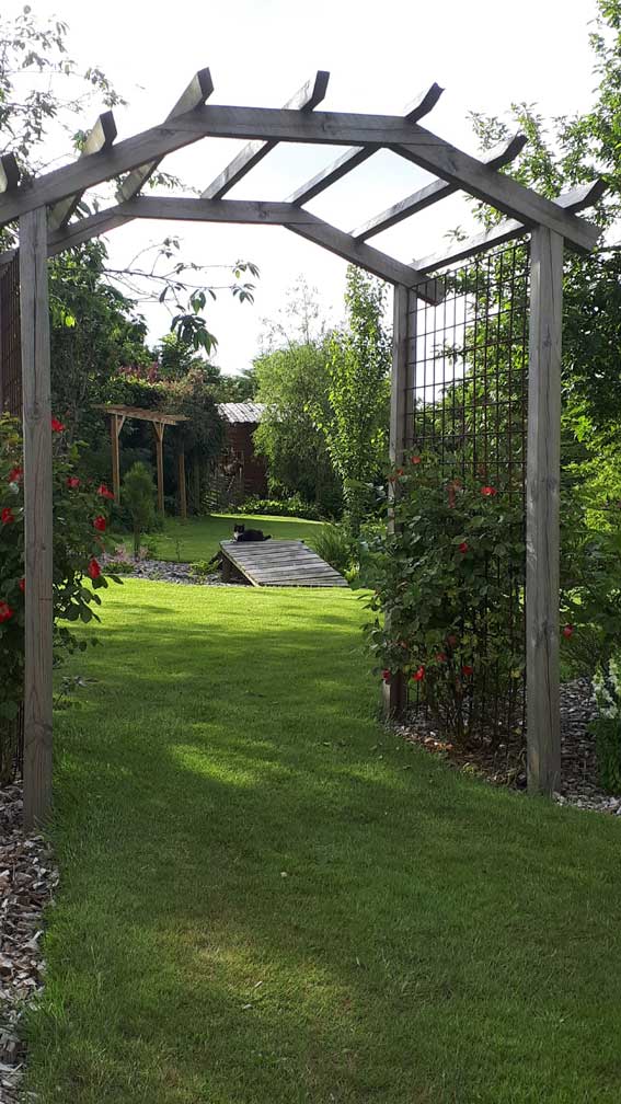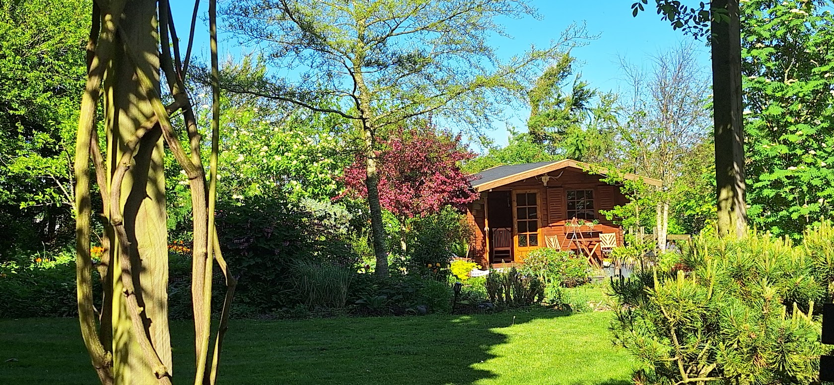 Ca. 3000 m2 stor have inddelt i mange rum så man ikke kan overskue haven fra et sted.