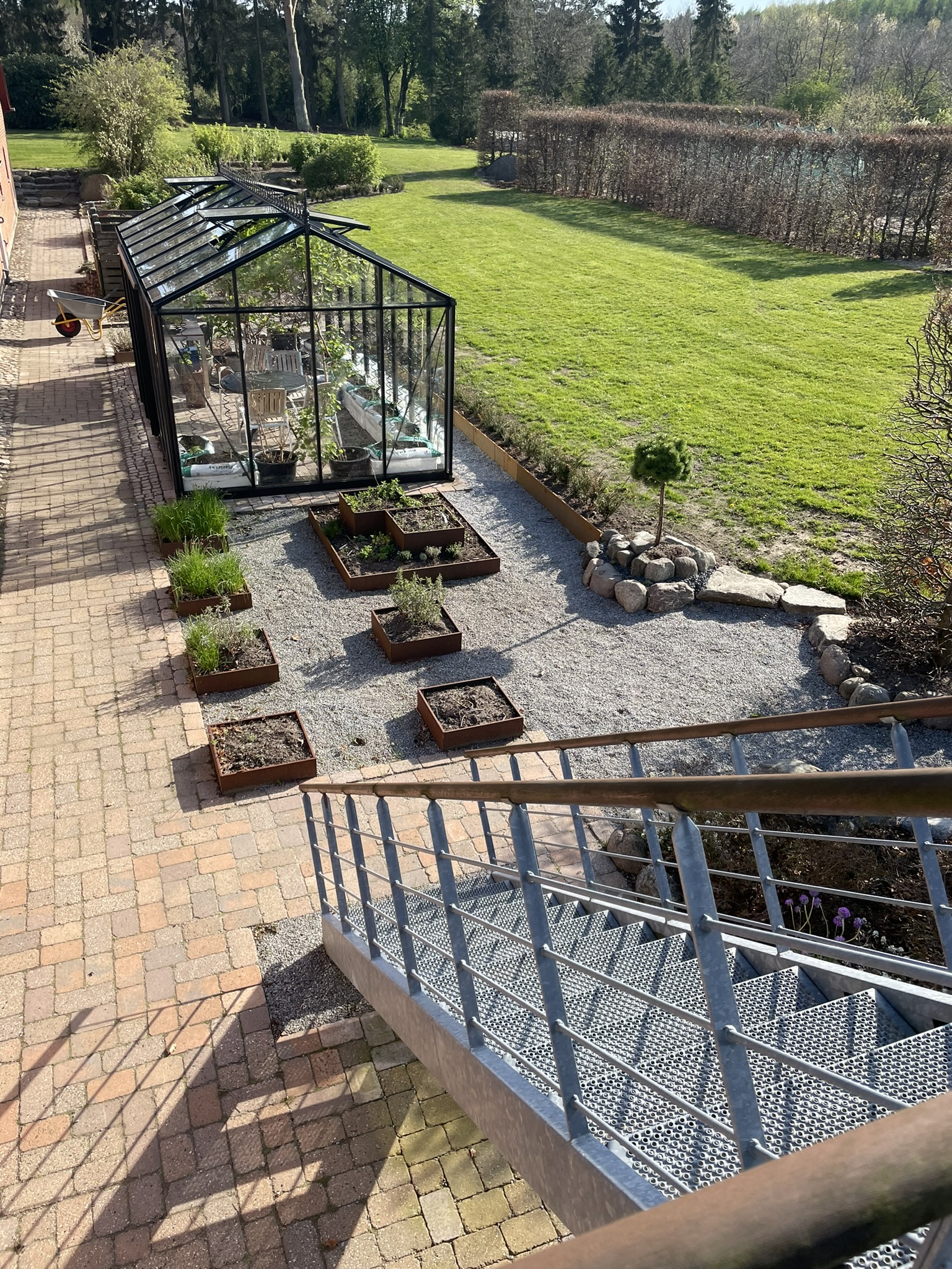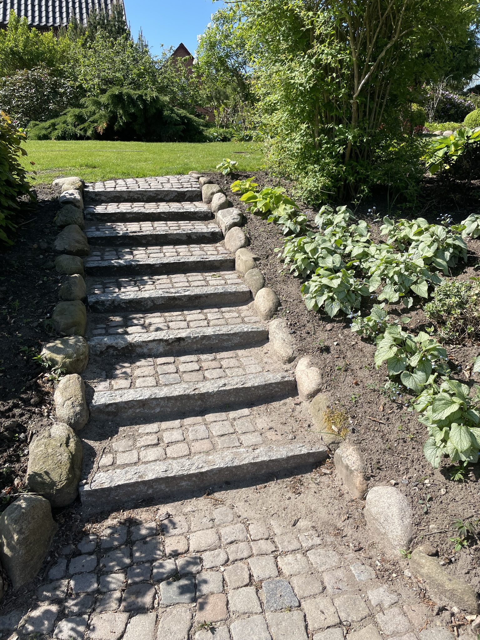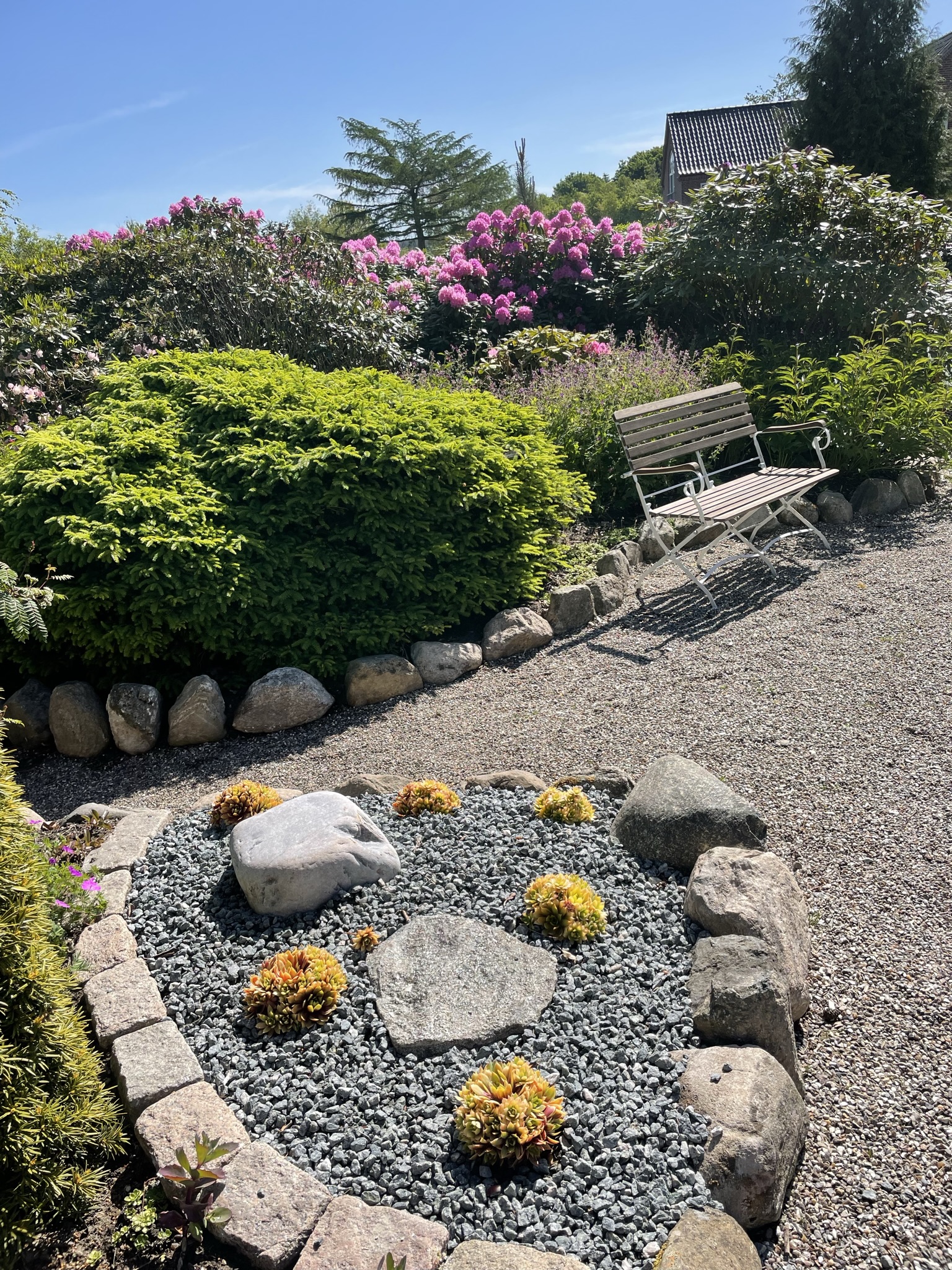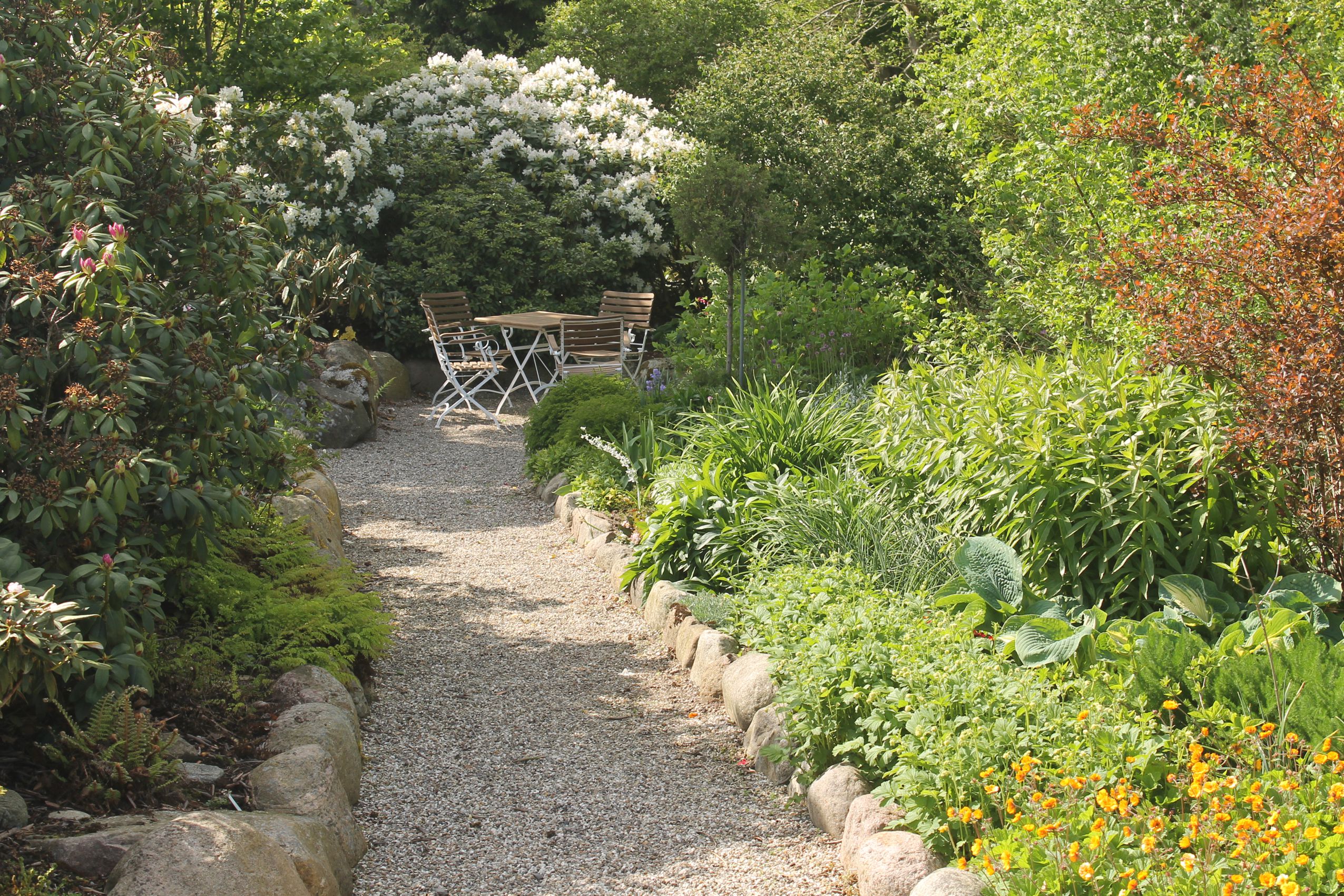 I 2008 startede vi for alvor på at udvikle vores have. Den er skabt hen af vejen, men samtidigt har vi forsøgt at bevare de store linjer. Ca 1200 Rhododendron og mange forskellige følgeplanter til surbund som f.eks. Trillium - arisaema -hosta og orchideer dominerer store dele af haven. Der er også blevet plads til stauder og mange spændende træer (vi er specielt glade for vores efterhånden pænt store Mammuttræ). Nyttehaven består af en køkkenhave i højbede - et drivhus - bærbuske og ikke mindst en frugthave med 40-50 sorter. Lige ved terrassen har vi anlagt et Japansk Inspireret haveafsnit med et lille tehus. Haven ligger i kuperet terræn mellem 2 gamle smeltevandsdale der fører ned til Villestrup Å. Vi har derfor langt stor vægt på samspillet mellem have og natur, således at man efter engelsk forbillede kan gå i haven og kigge ud på naturen.