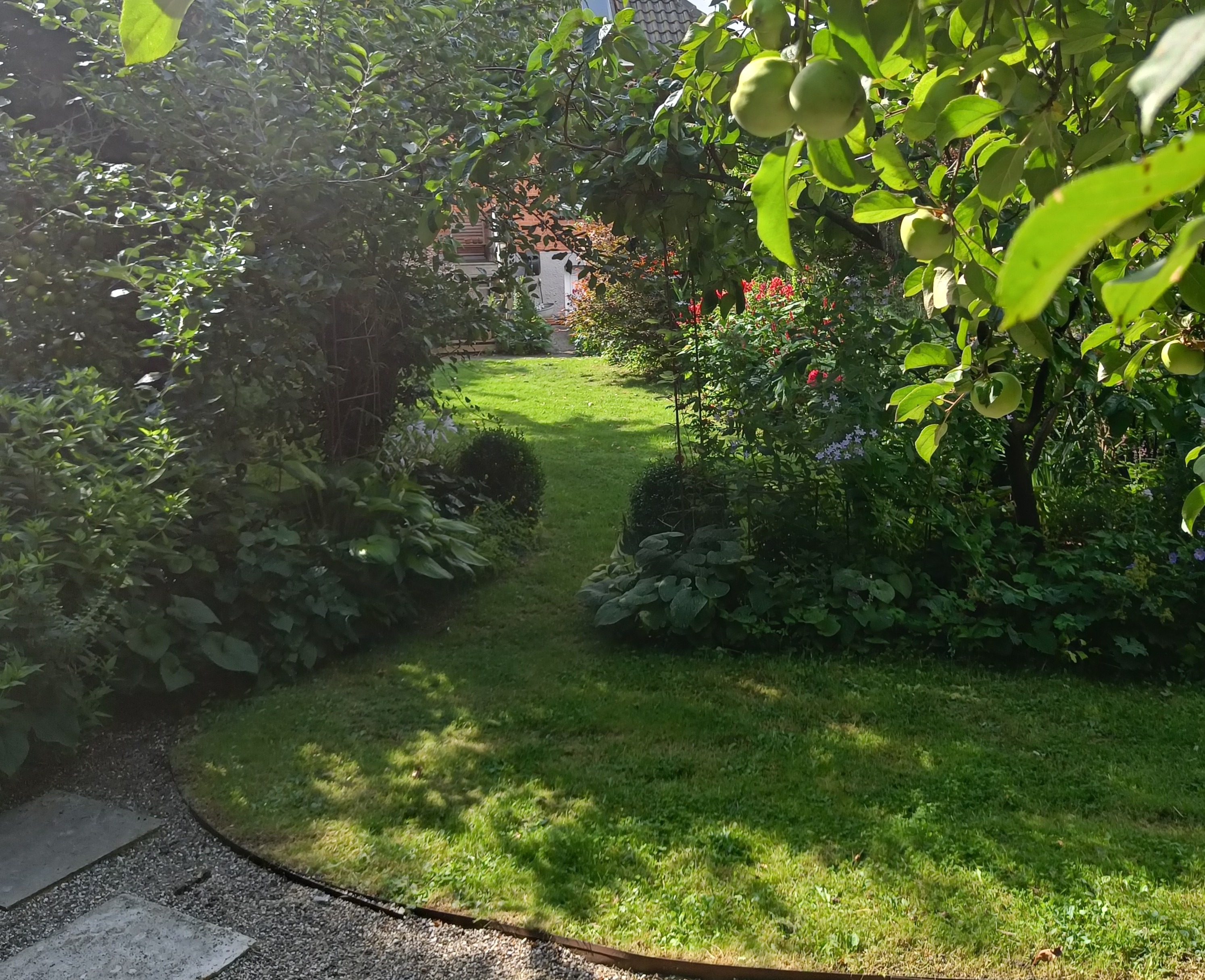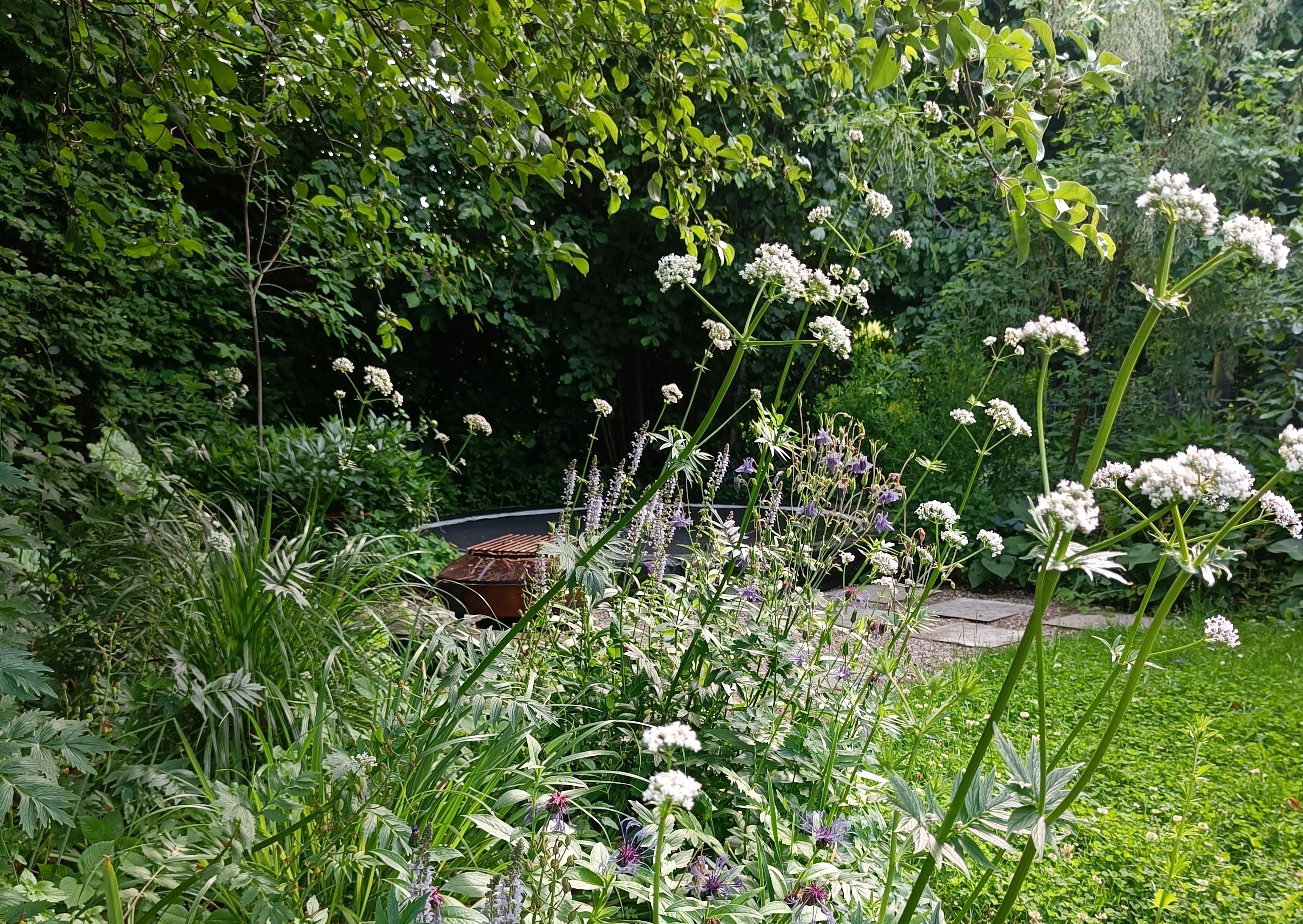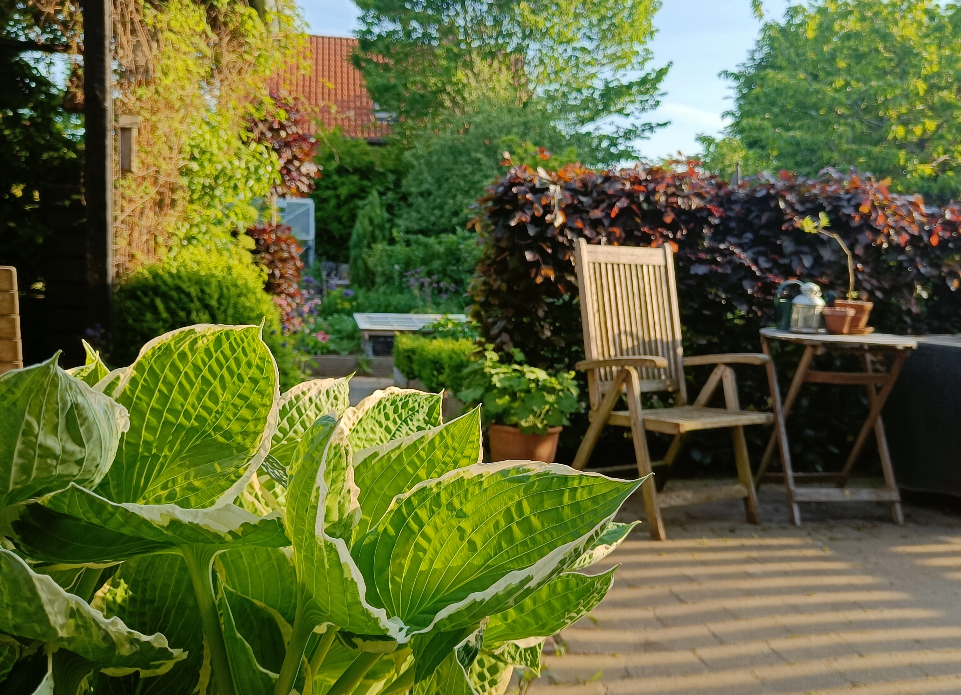 En ældre villahave er re-designet for ti år siden med fokus på frodighed, sanselighed, høns, børn, hygge, dufte og farver. Haven findes på Instagram på kontoen HjemmeHos_MariaKristina