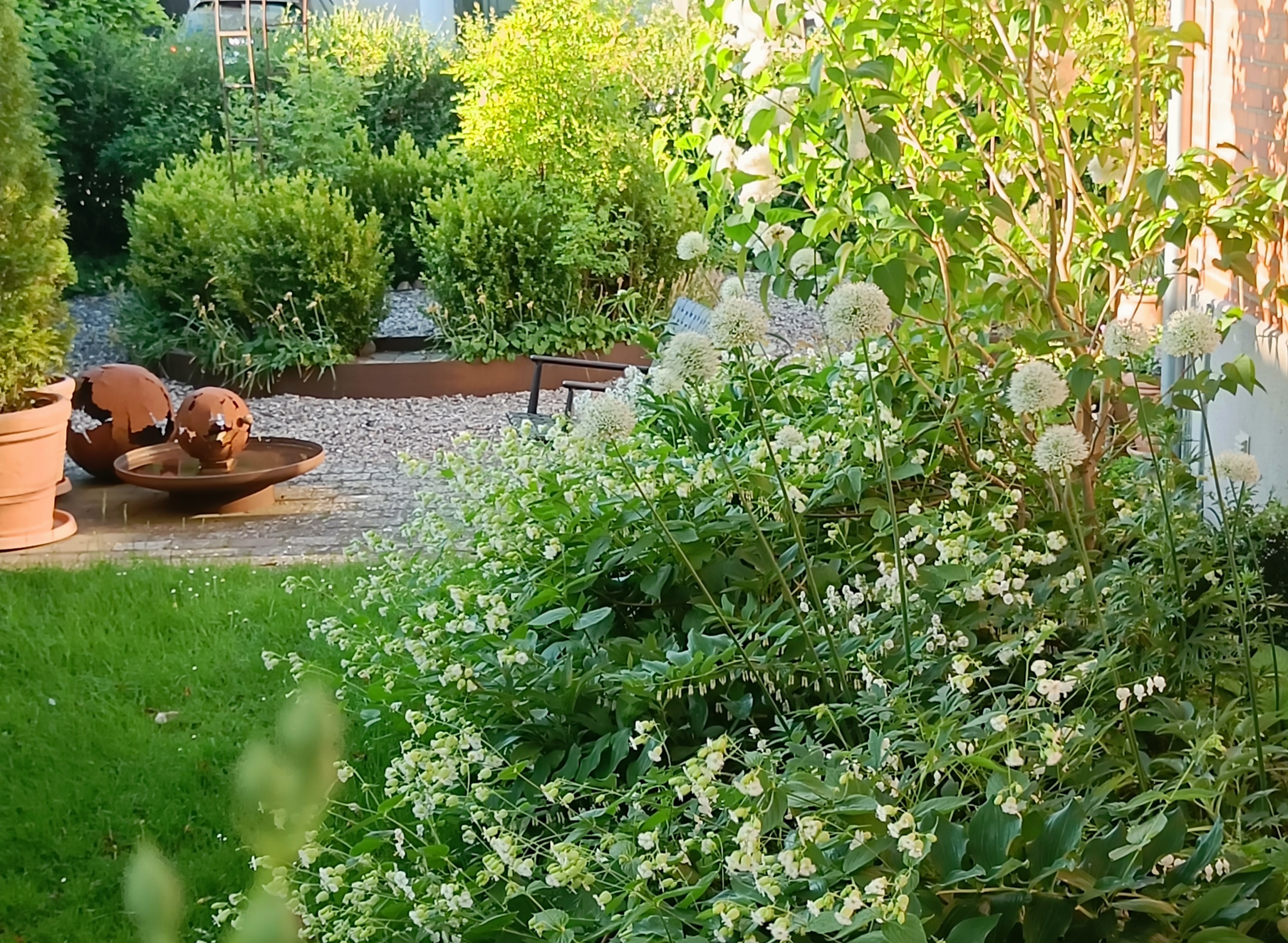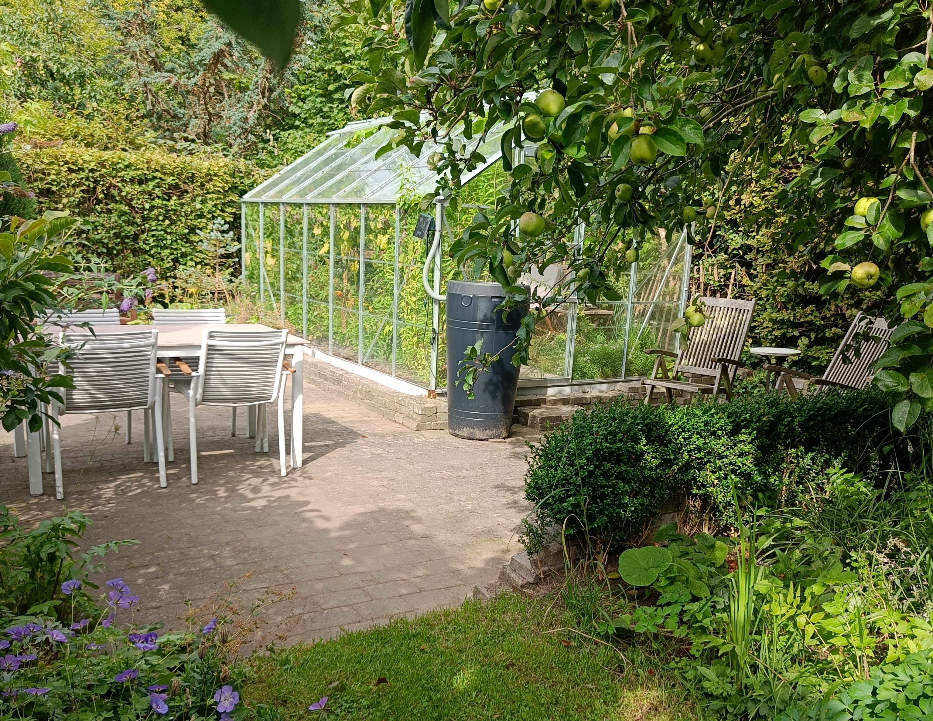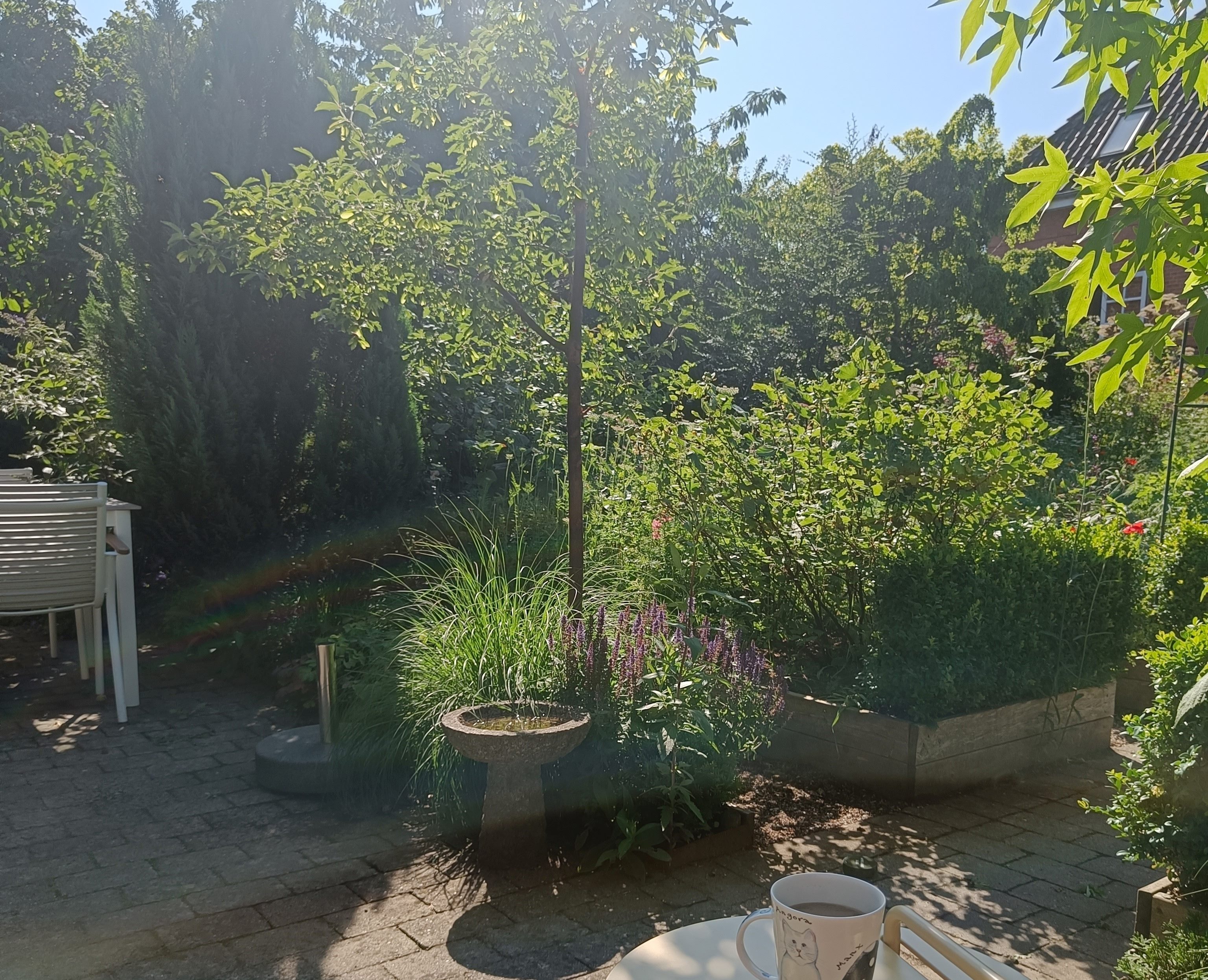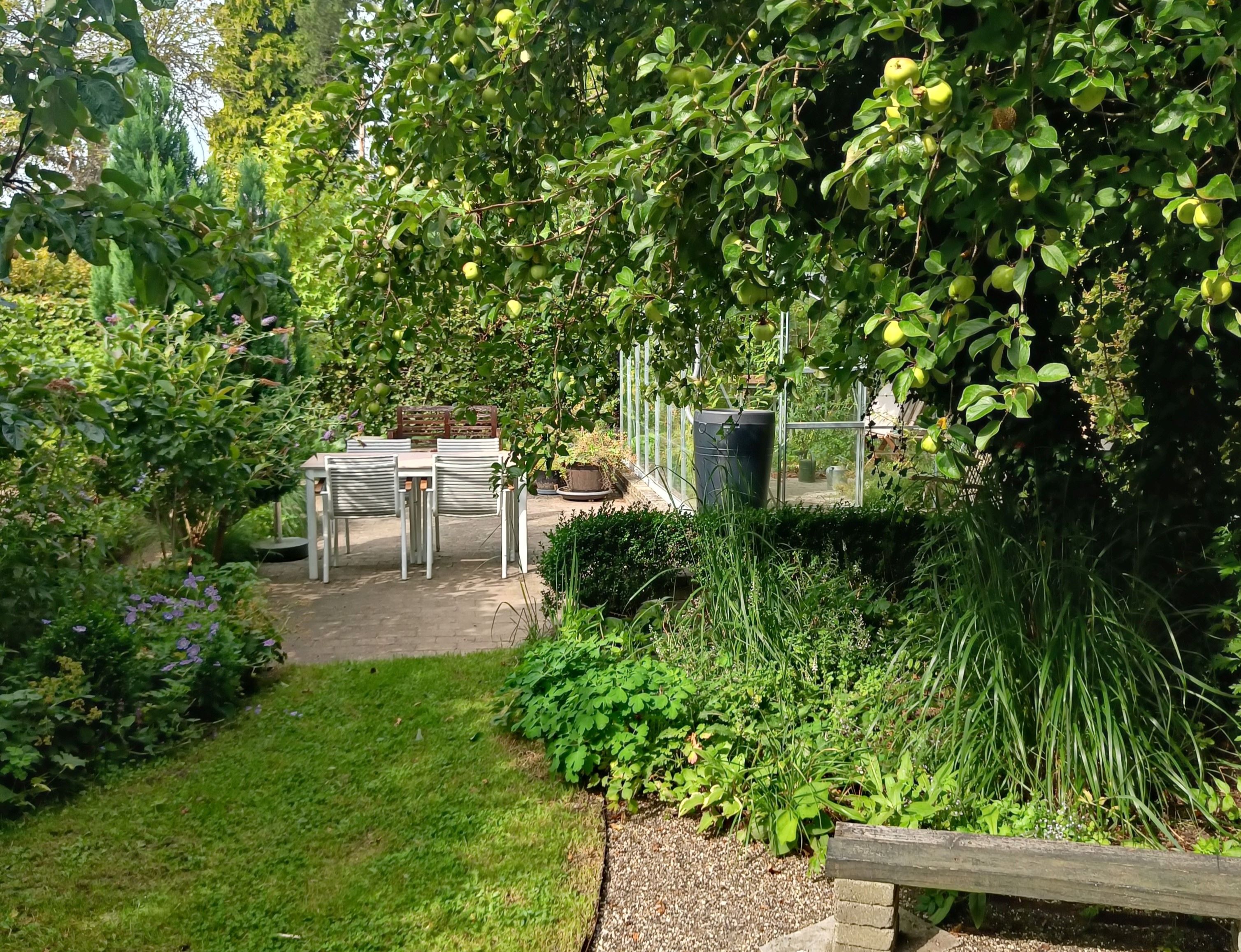 En ældre villahave er re-designet for ti år siden med fokus på frodighed, sanselighed, høns, børn, hygge, dufte og farver. Haven findes på Instagram på kontoen HjemmeHos_MariaKristina