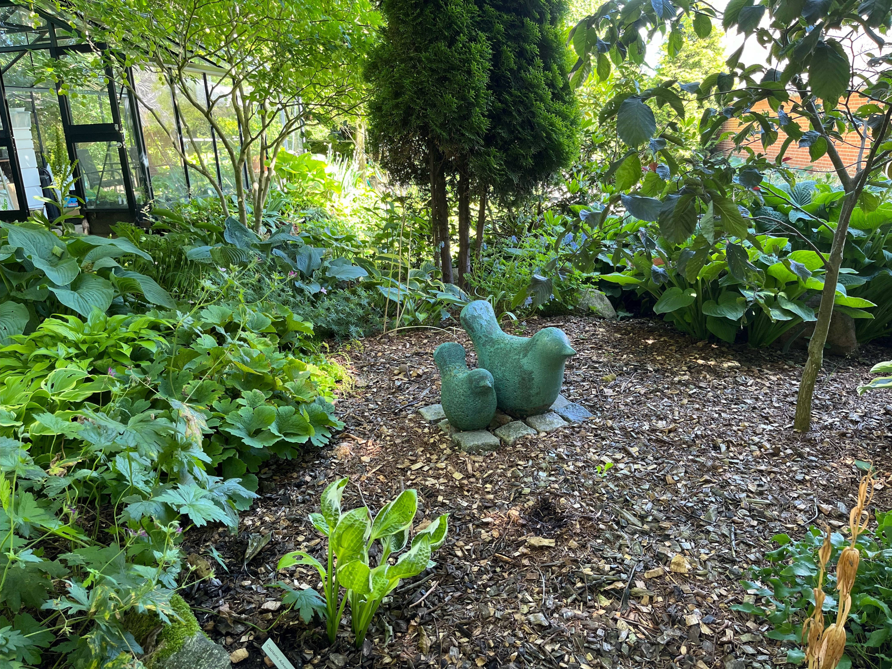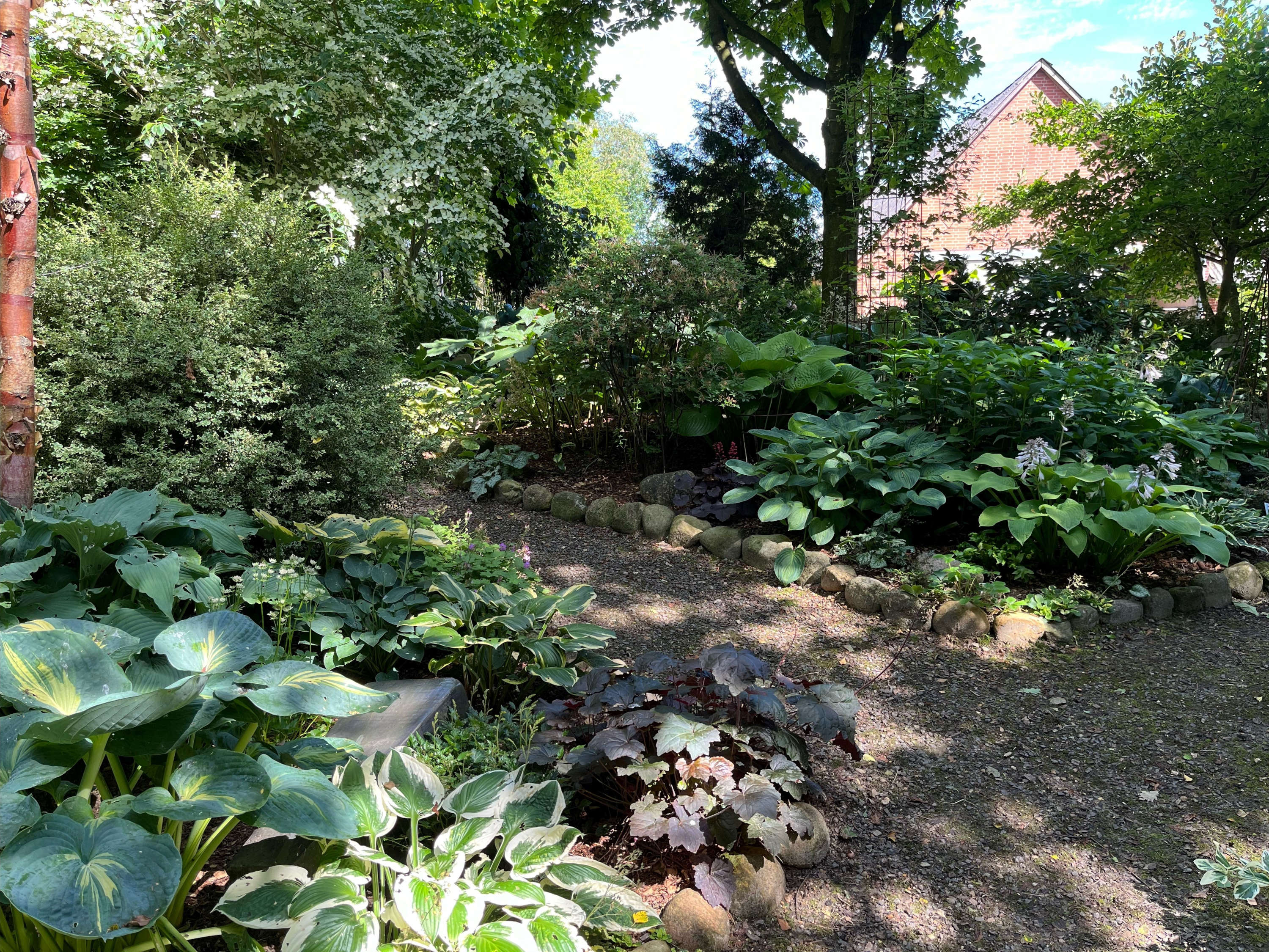 En stor landbohave med hovedvægt på især hosta, bregner og buske.