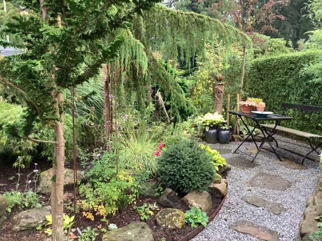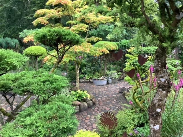 Haven ligger med skoven som baggrund. Haven er opbygget af sten, mange forskellige planter samt formklippede buske m.m.