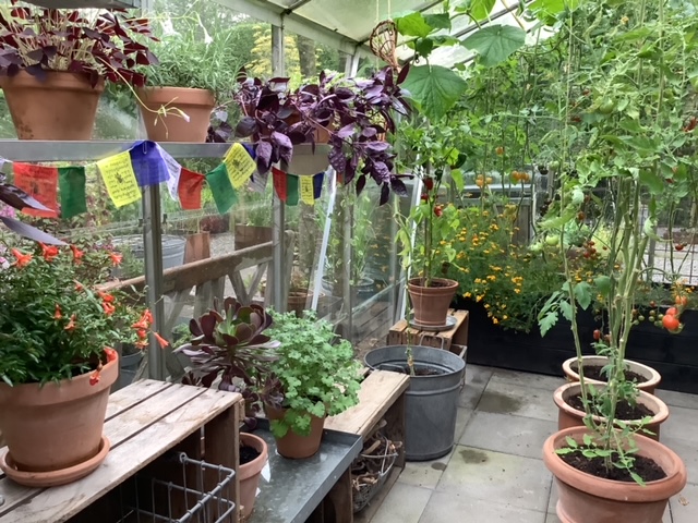 I drivhuset dyrkes der forskellige slags tomater og lidt krydderurter.
