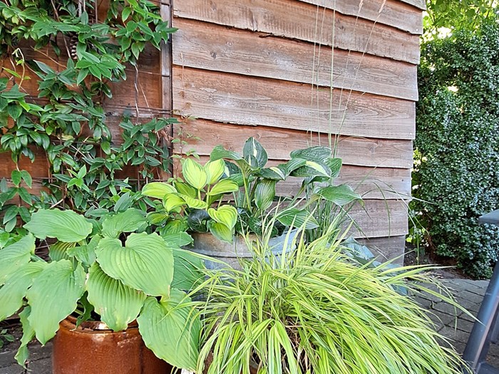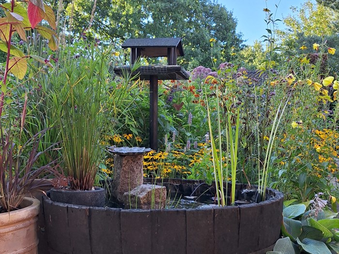 Smuk regnvandsbed med blåkant og hosta.