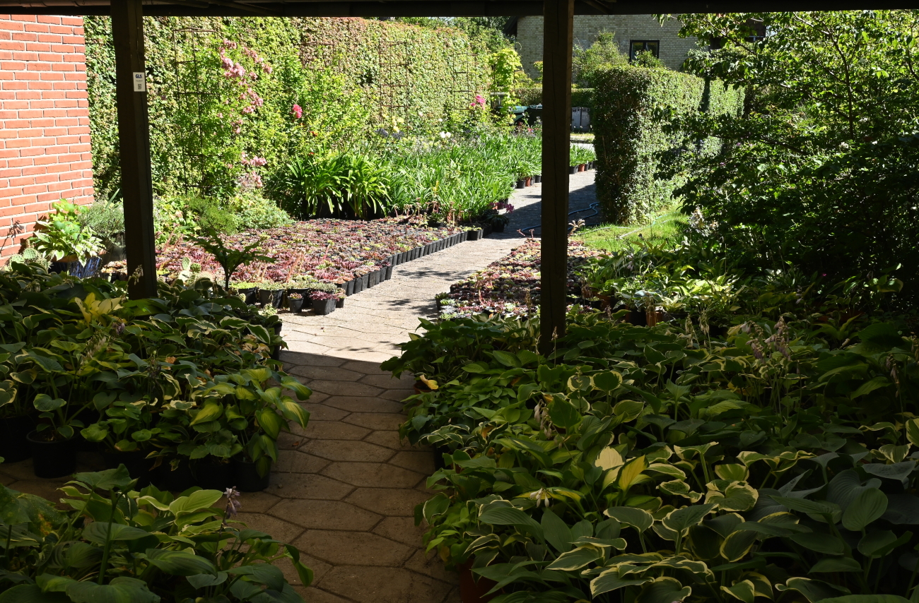 Ingen græsplæne men mange stauder i så tæt beplantning, der gør haven næsten vedligeholdesesfri fra juni til oktober. Omkring 150 Hostaer i potter (for at holde sneglene nogenlunde på afstand). En del Agapanthus i potter, samt en stor samling (omkring 3000 navnesorter) af Sempervivum (husløg), som delvist erstatter en flade med græs. Af træagtige planter er der især koreakorneller samt et par magnolier og et æbletræ fyldt med mistelten.