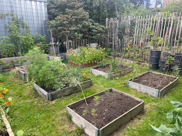 Farverig have i udvikling. Mange haverum. Lille Køkkenhave. Høns og fisk. Mange forskellige blomster, planter og træer.