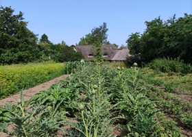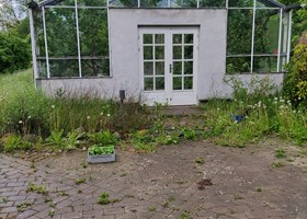 Ny anlagt have i 2022. Surbundsbed, skovbed, staudebede, drivhus + køkkenhave med højbede. Foran huset et stort stenbed