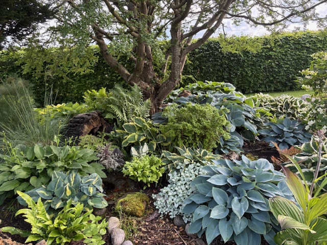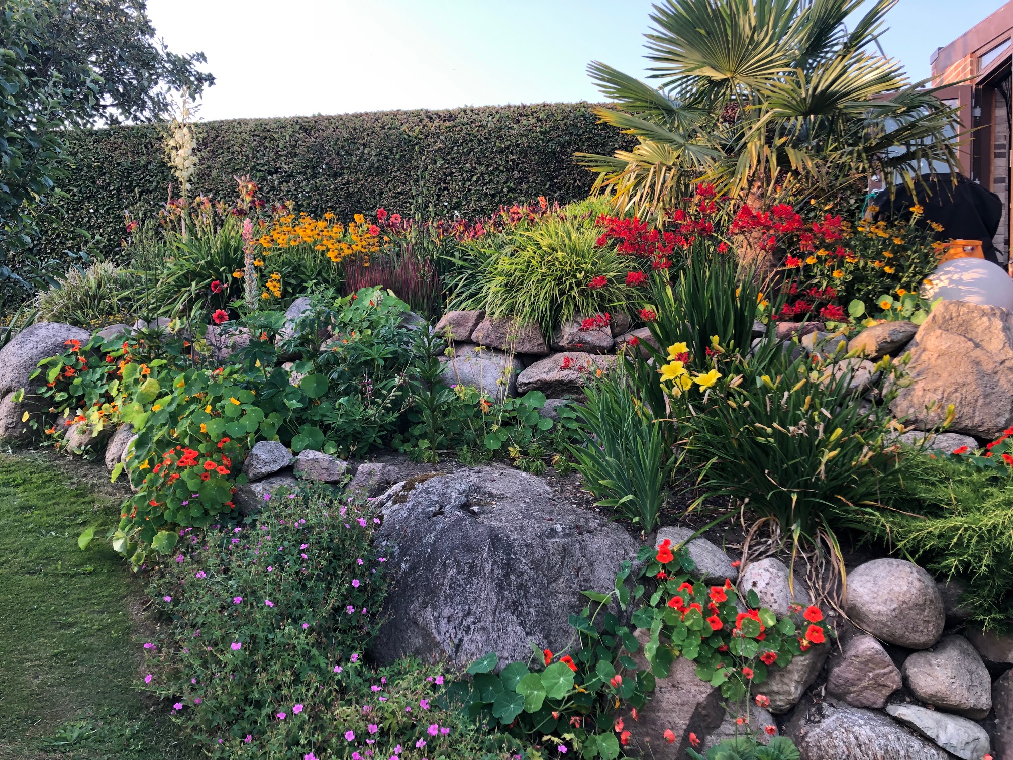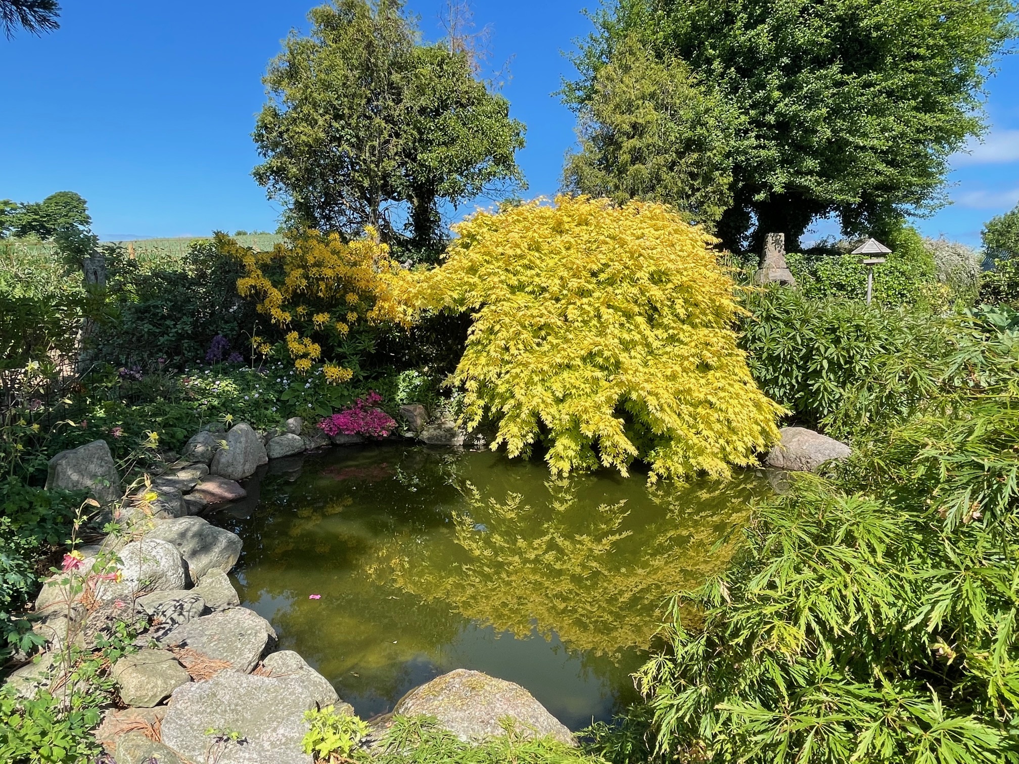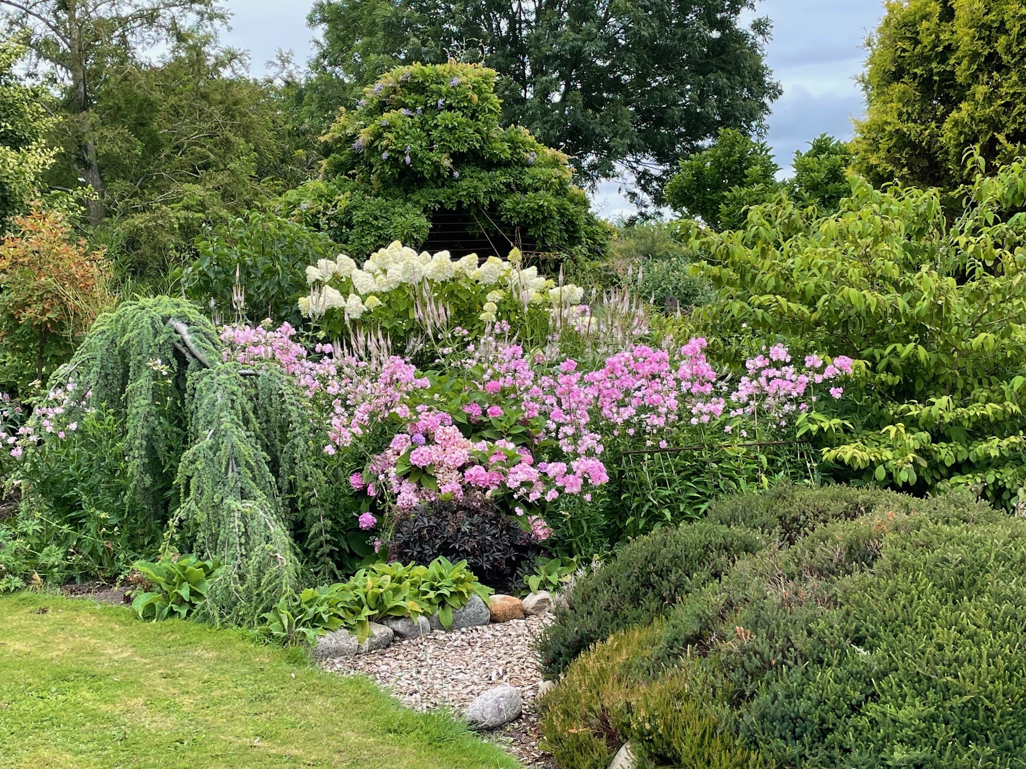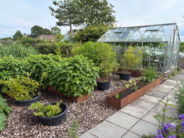 Alsidig og stor landbohave med prydhave, frugttræer, bærbuske, køkkenhave, drivhus, havedam, bier og høns samt vinmark