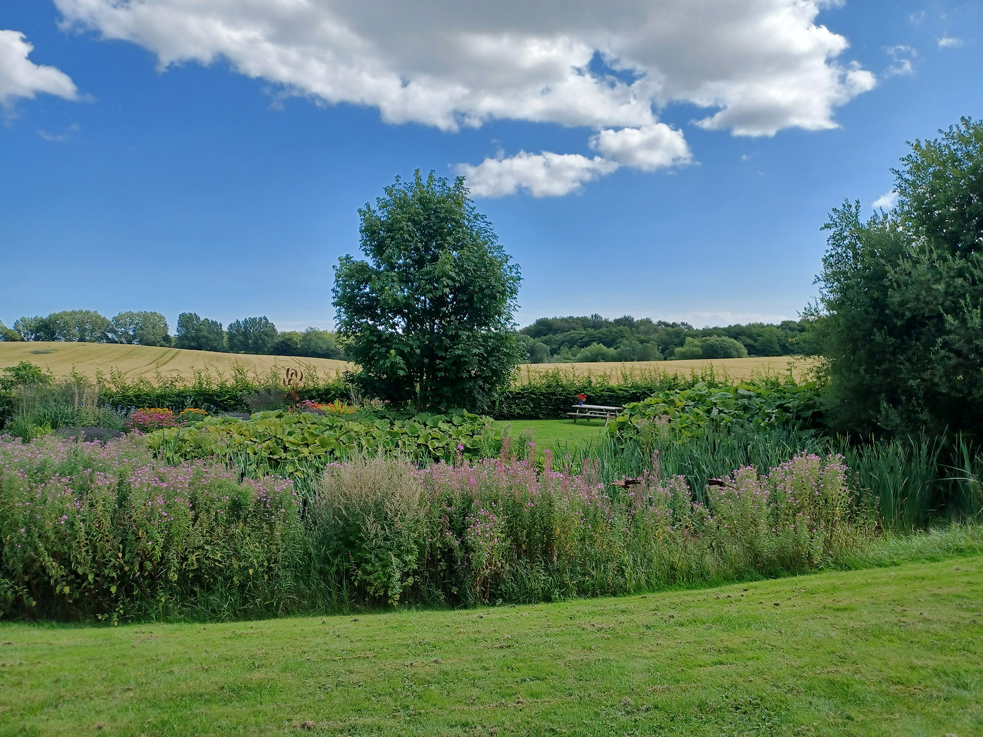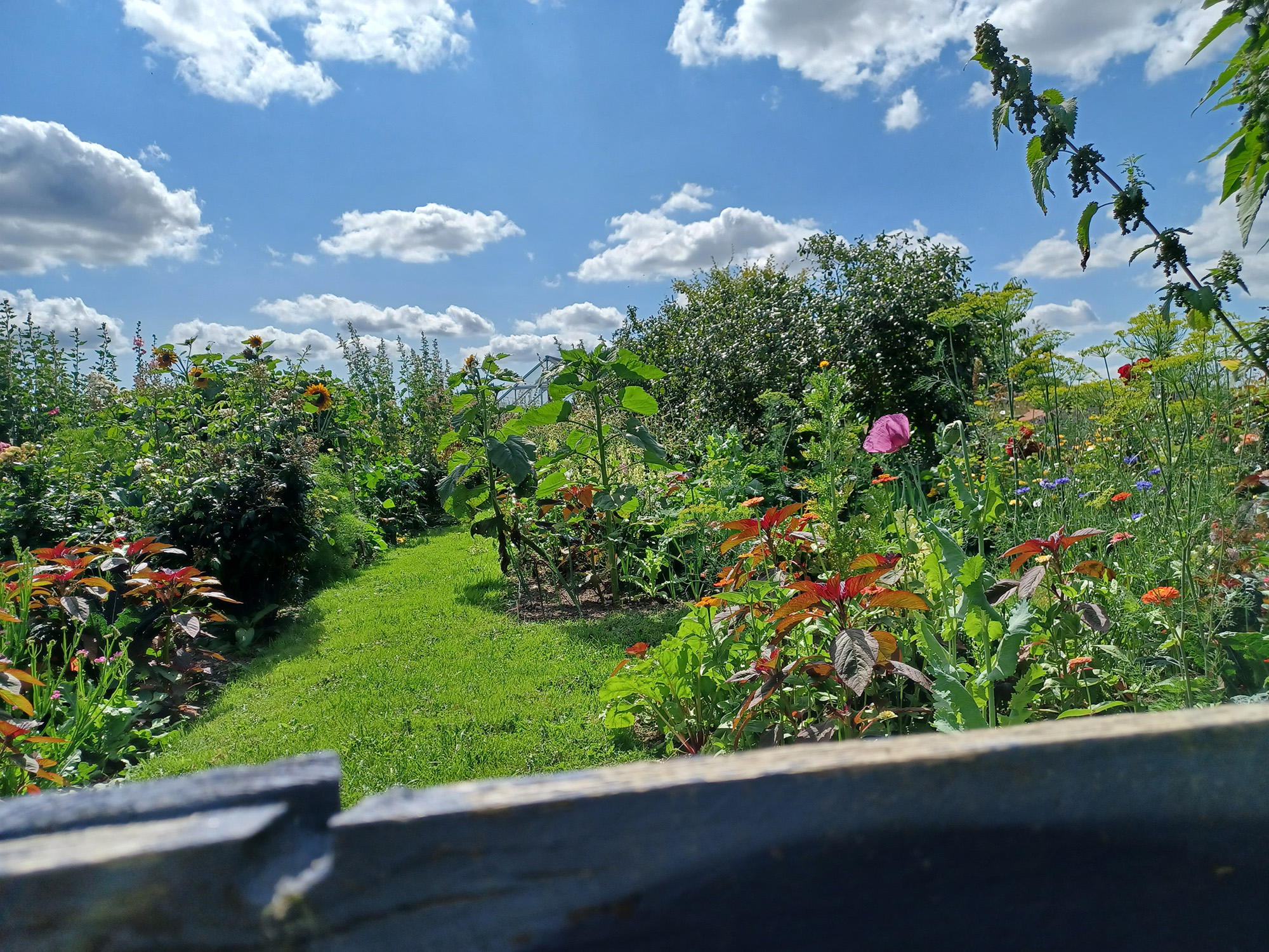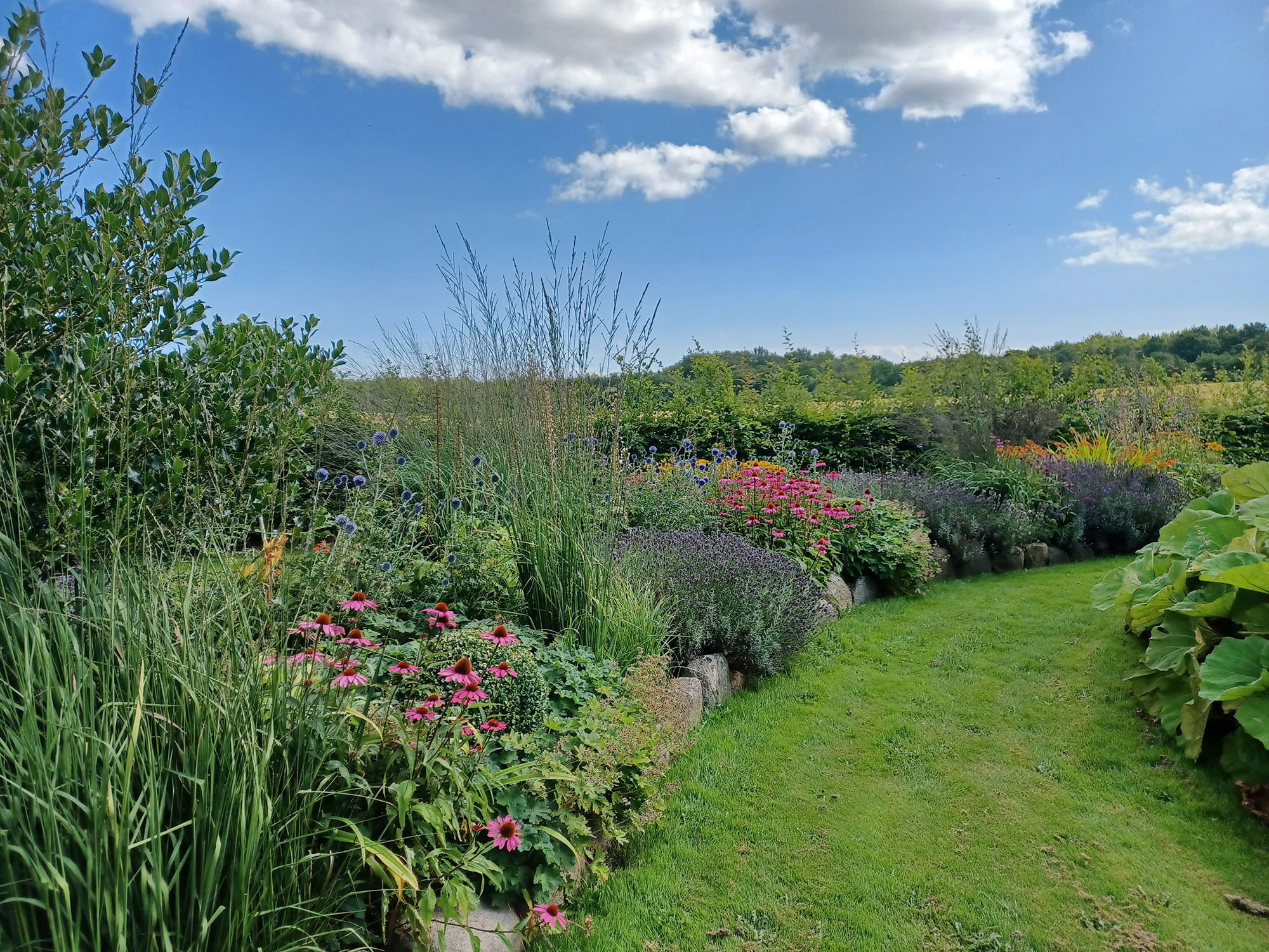 En have med fokus på mennesker og dyr. Biodiversitet og stauder. En lille sø, en troldehave og en skæv frugtlund.