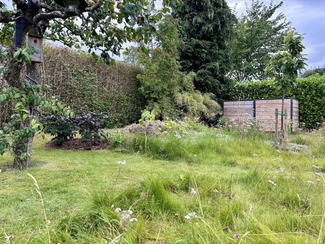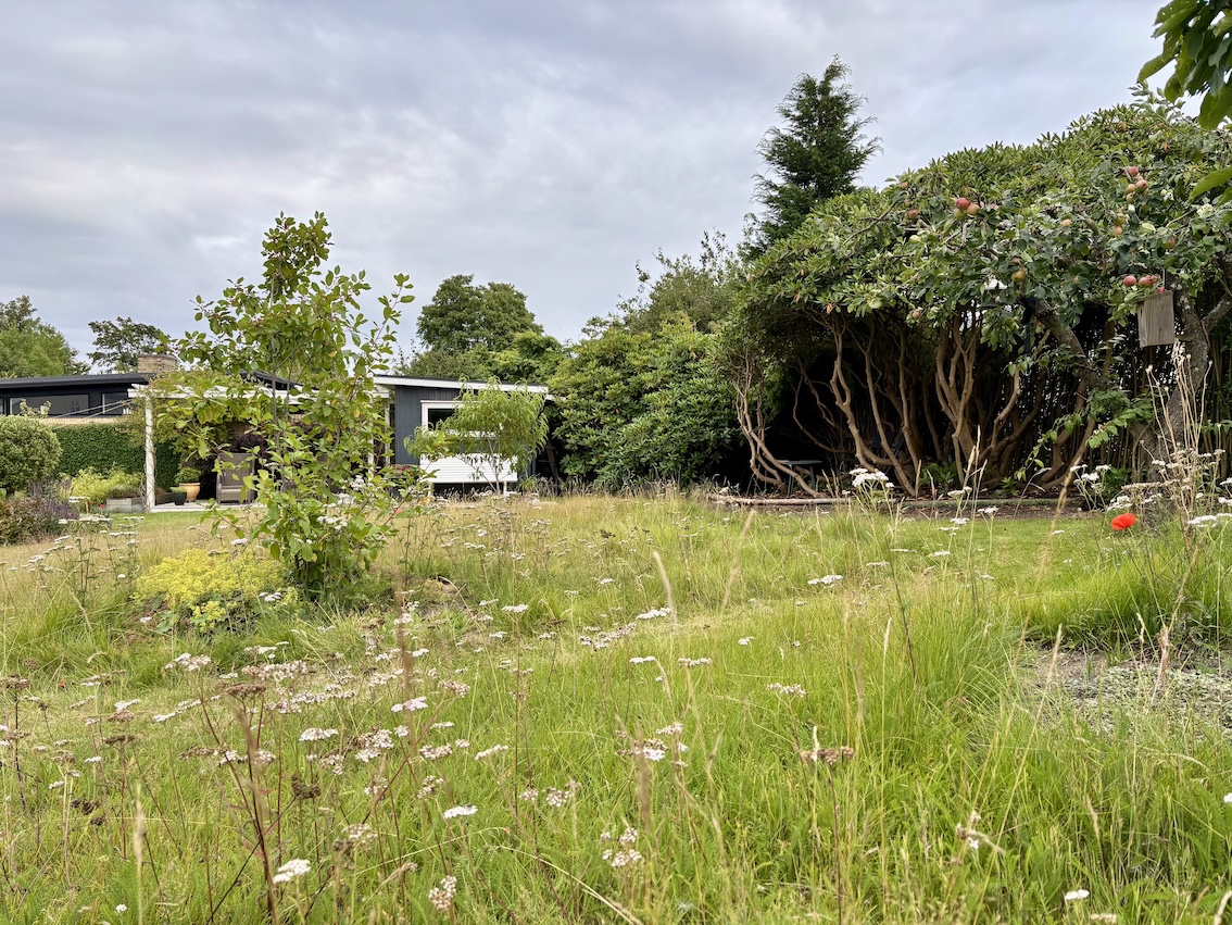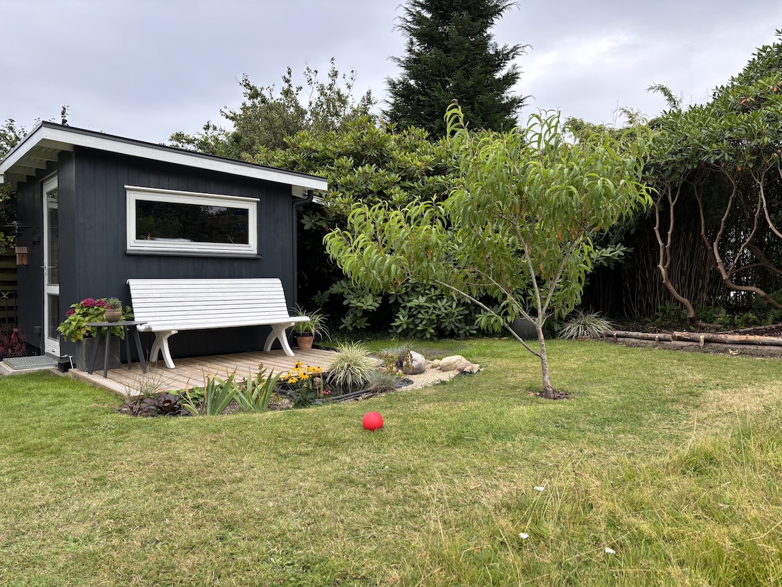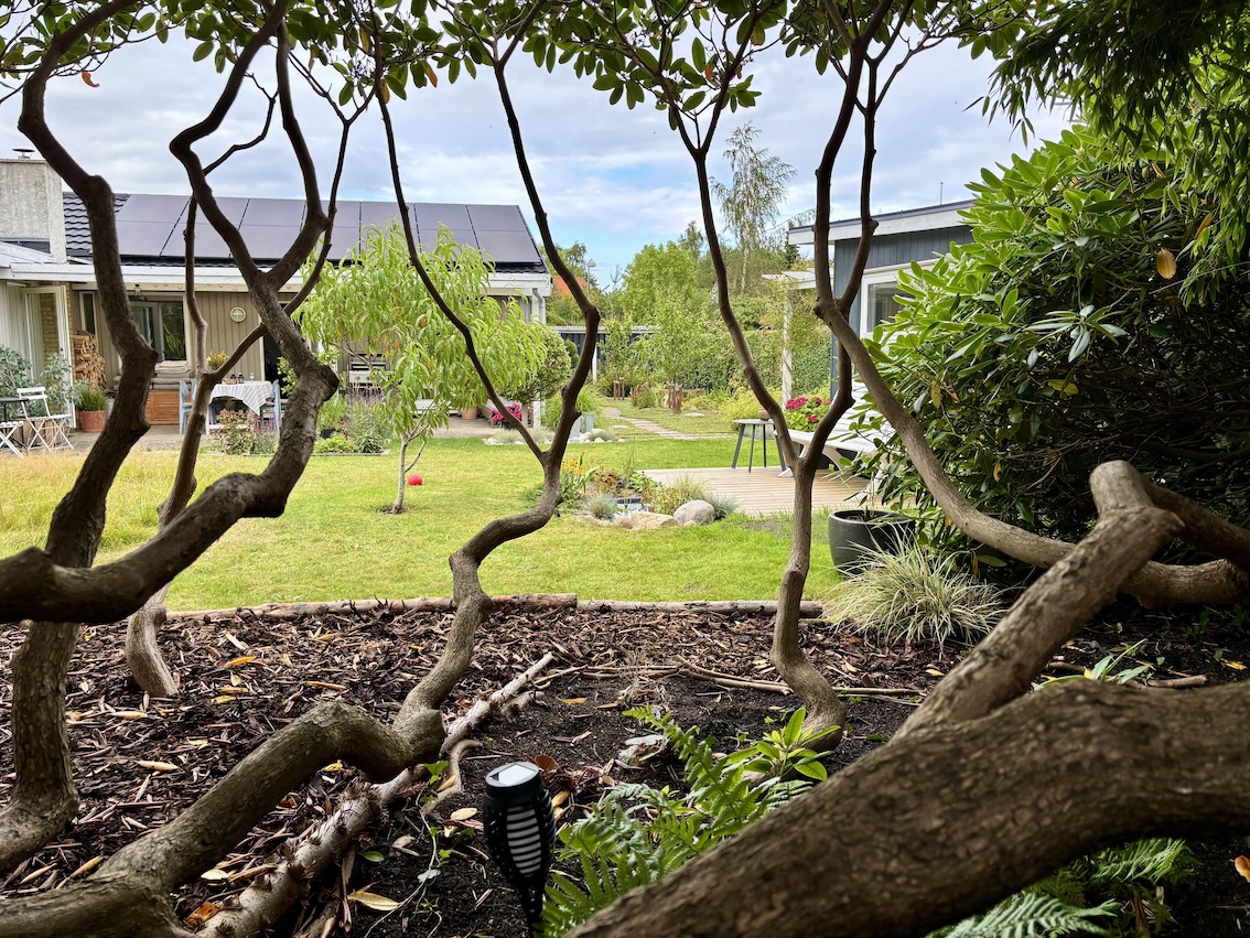 Baghaven er en lille smule vild-med-vilje-agtig. Stor del af græsplænen står uklippet og skal hen ad vejen beplantes meget mere biodiversitetsrigt. En meget stor rododendron er opstammet og danner baggrund i et lille skovhaveafsnit. En lille dam med terrasse og bænk er også næsten færdig. Jeg skulle gerne få hovedtrækkene på plads i 2025.