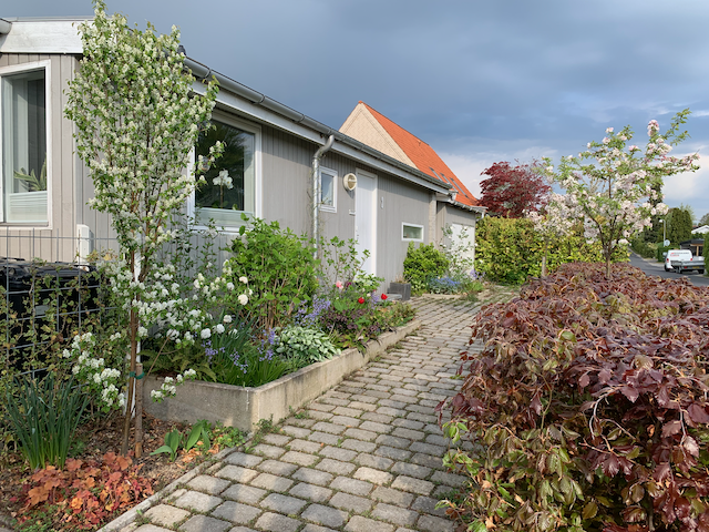 Forhaven er med rødbøgepur mod fortov og halvvilde bede langs husmuren. Af hensyn til lokal nedsivning af regnvand, er der semipermeabel betonstensbelægning med krybende timian i de brede fuger.