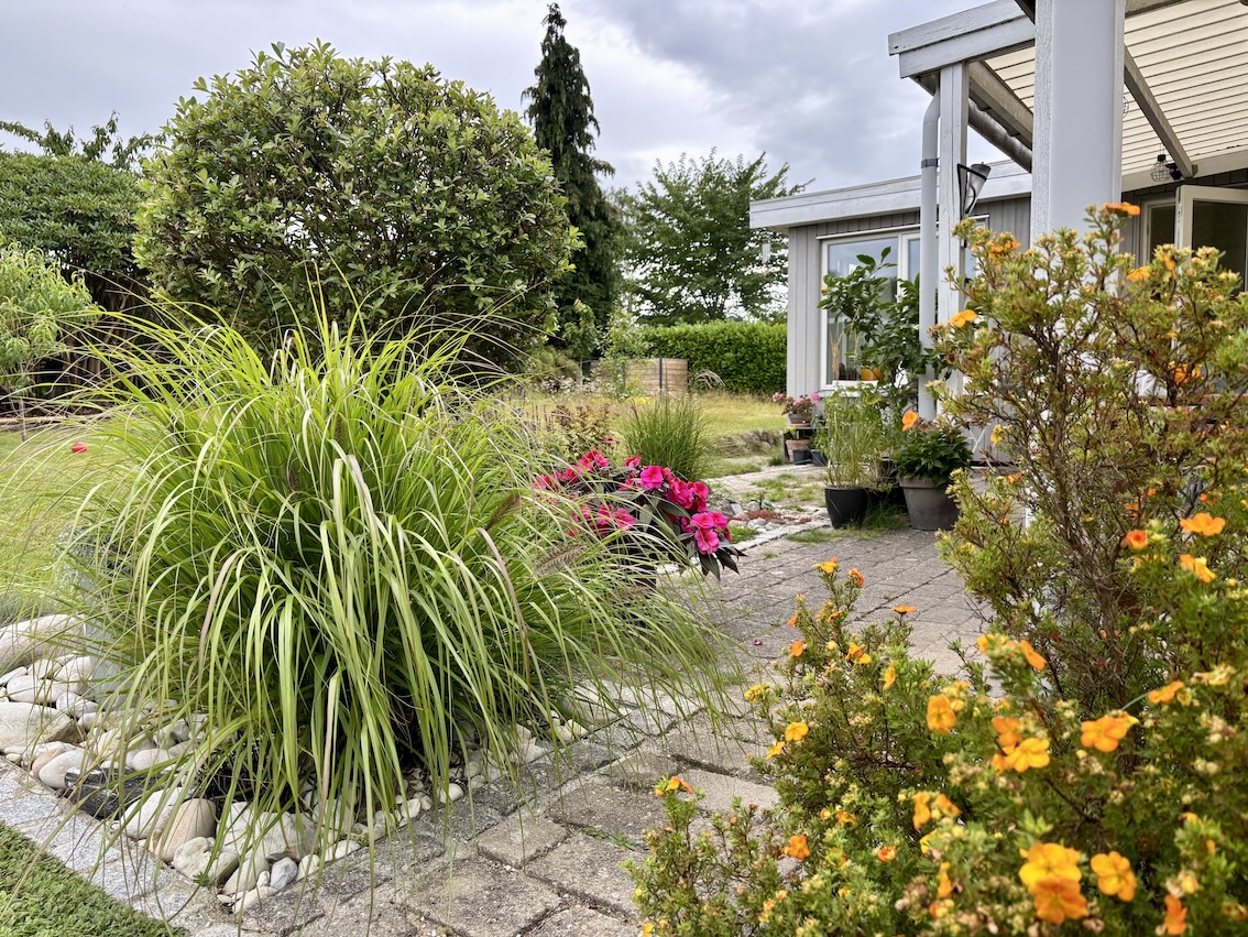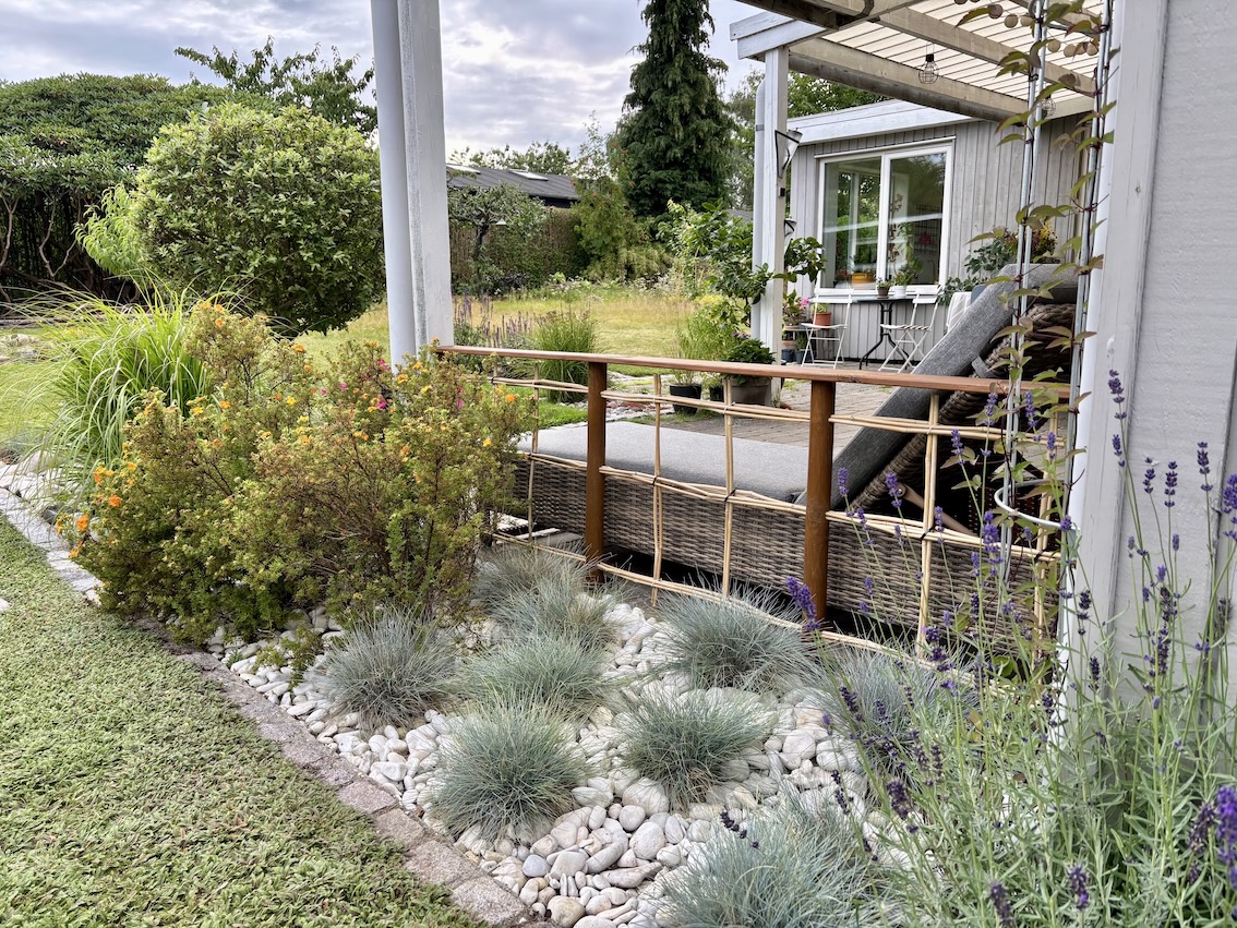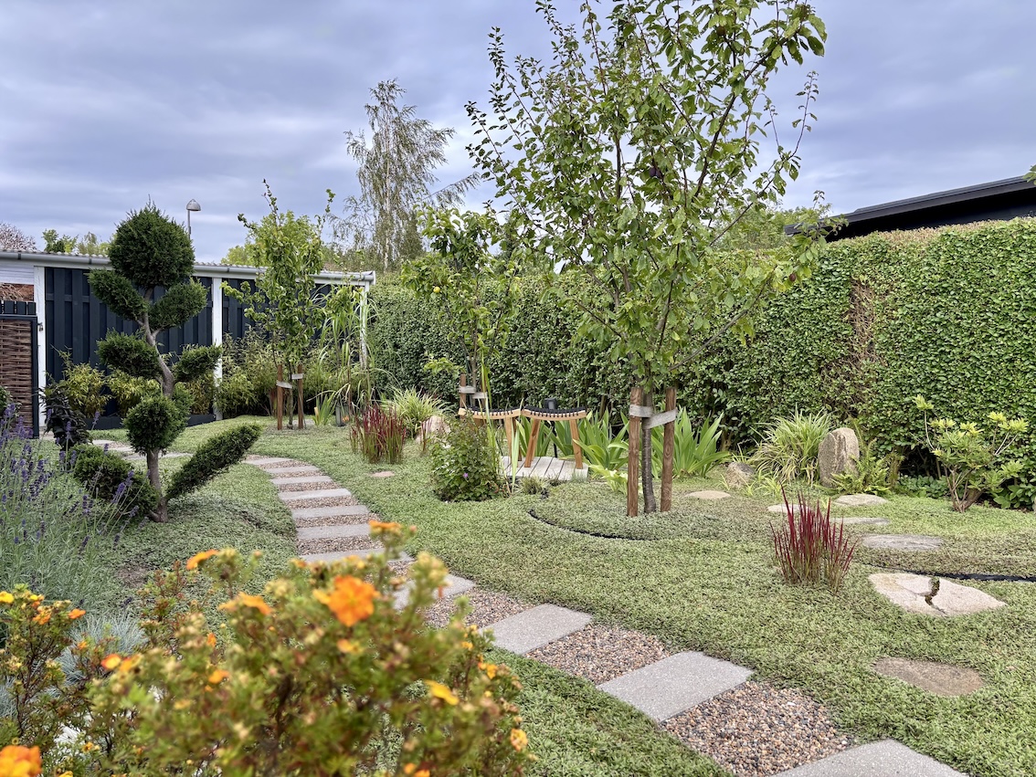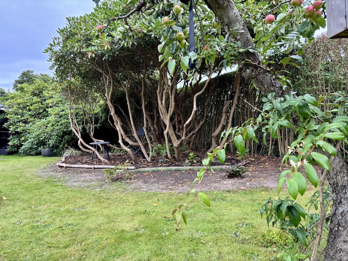 Japansk inspireret afsnit blev startet forår 2024 lidt for sjov og aldeles uovervejet. Jeg blev selvfølgelig fænget af temaet og har gradvist øget “japaniseringen”. Nu med to asiatiske pæretræer, et blommetræ, et æbletræ (alle plantet 2023), bambus, trædebregner som bunddække, to halvstore stengrupper, stargræsser, azalea, pudeklippet cypres, japansk løn, blodgræs, bregner, mm. Sågar også med to små damme og et vandløb. Jeg er også blevet medlem af Foreningen Japanske haver i Danmark. Med øget viden og manglende plan fra starten, er rigtigt meget lavet om flere gange (tunge sten og jord flyttet rundt!), men jeg tror grundplanen er rimeligt på plads nu. Jeg mener også at have fået lidt mere hold på mine begrænsninger for dette haveafsnit.