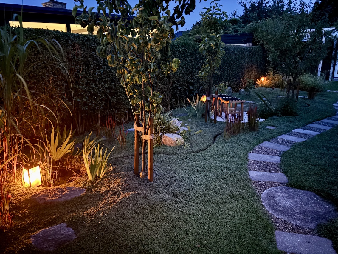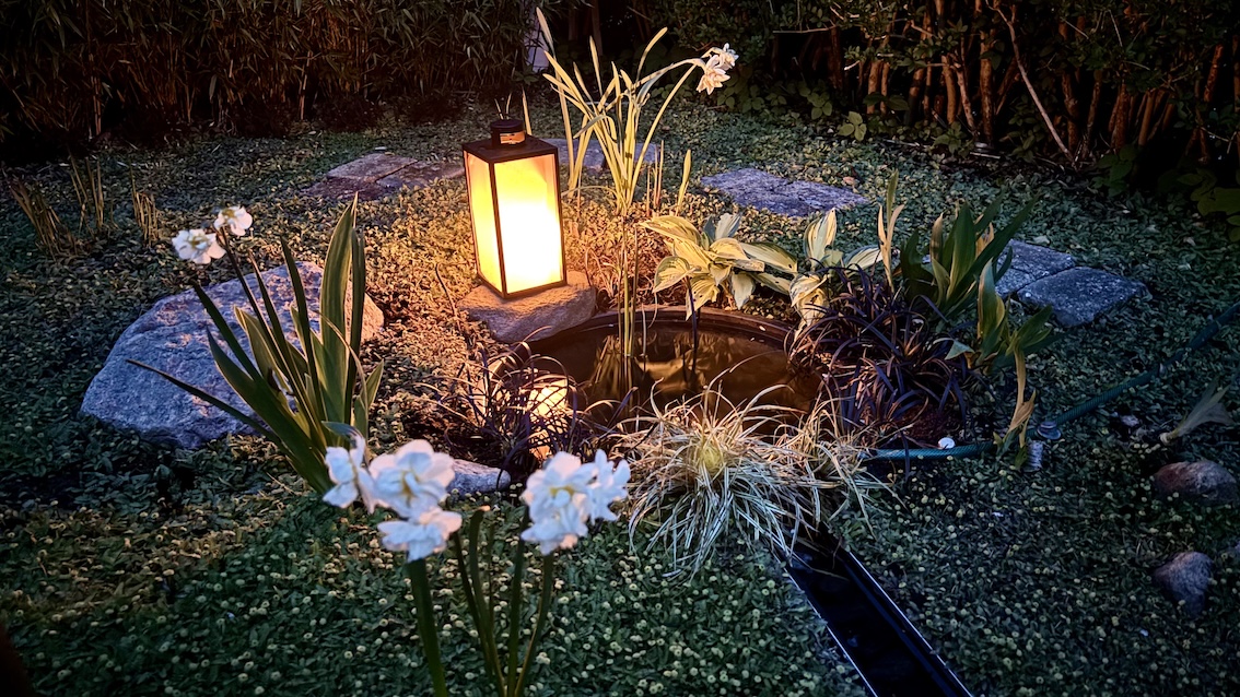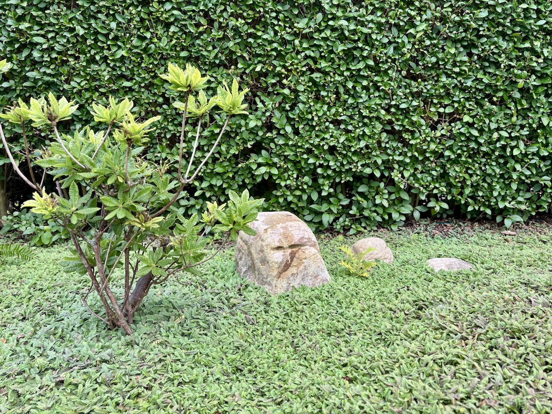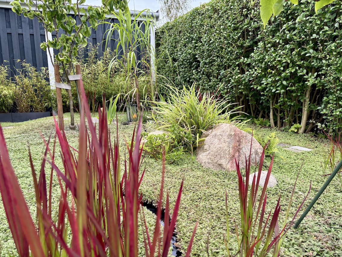 Japansk inspireret afsnit blev startet forår 2024 lidt for sjov og aldeles uovervejet. Jeg blev selvfølgelig fænget af temaet og har gradvist øget “japaniseringen”. Nu med to asiatiske pæretræer, et blommetræ, et æbletræ (alle plantet 2023), bambus, trædebregner som bunddække, to halvstore stengrupper, stargræsser, azalea, pudeklippet cypres, japansk løn, blodgræs, bregner, mm. Sågar også med to små damme og et vandløb. Jeg er også blevet medlem af Foreningen Japanske haver i Danmark. Med øget viden og manglende plan fra starten, er rigtigt meget lavet om flere gange (tunge sten og jord flyttet rundt!), men jeg tror grundplanen er rimeligt på plads nu. Jeg mener også at have fået lidt mere hold på mine begrænsninger for dette haveafsnit.