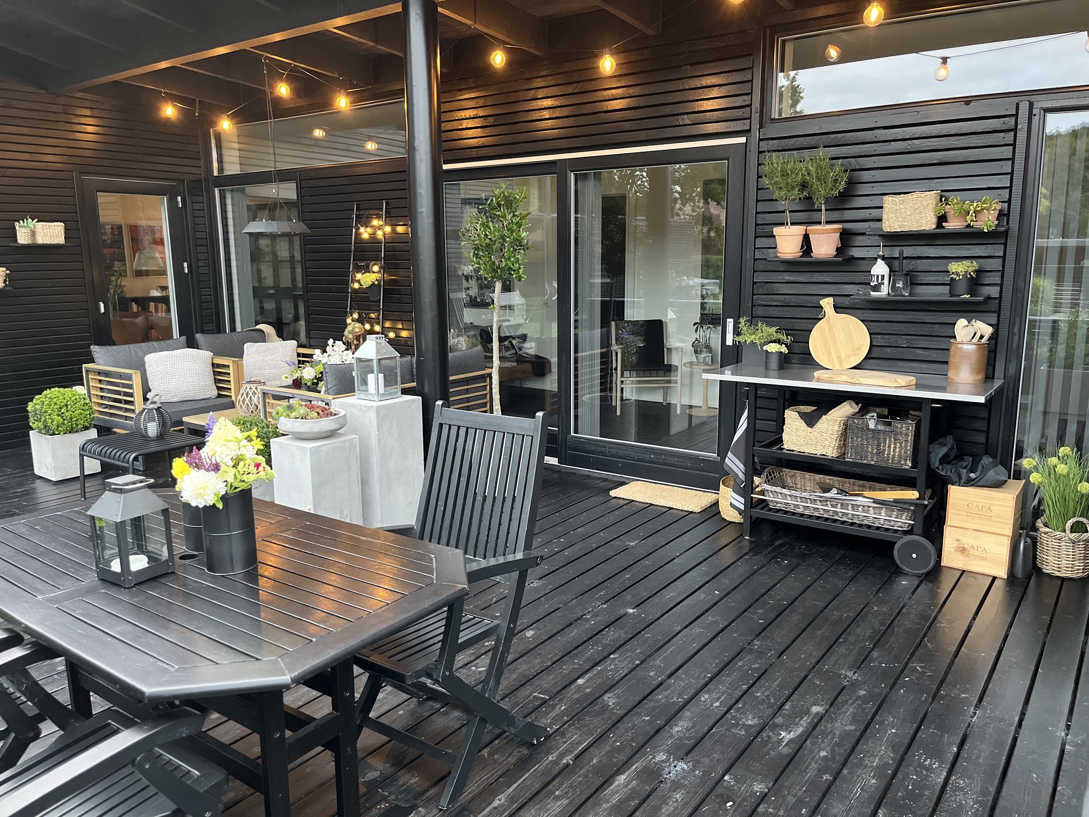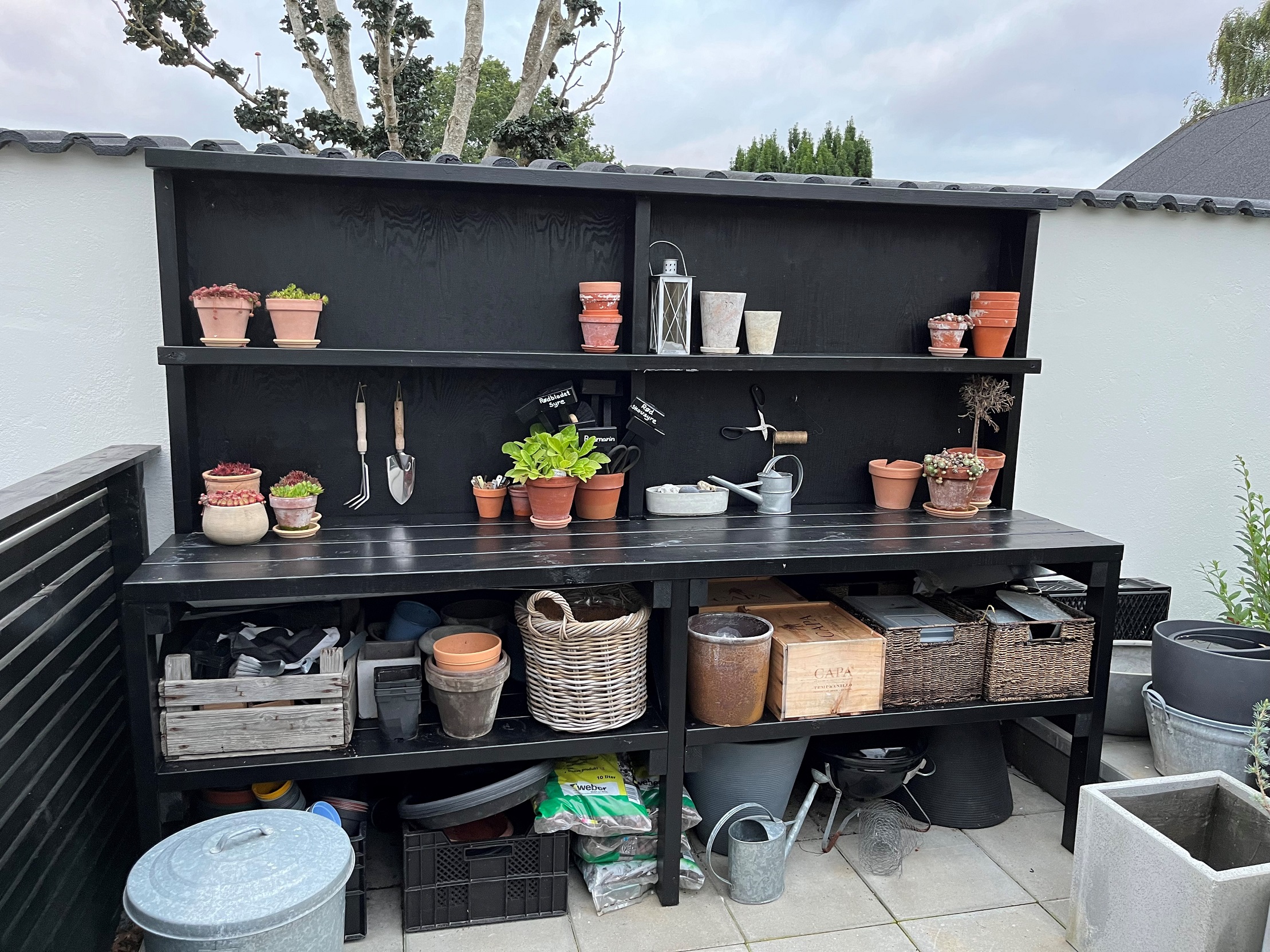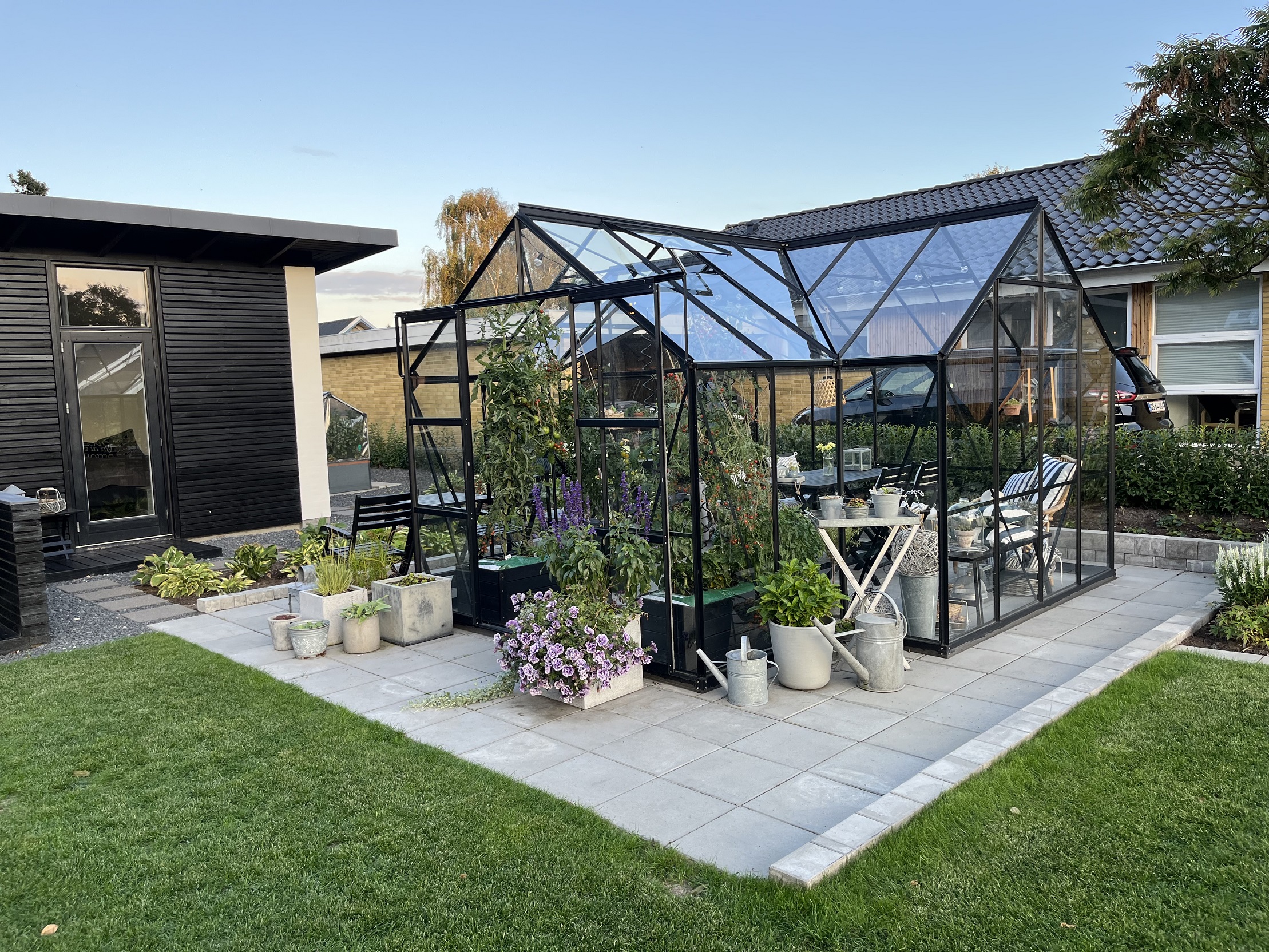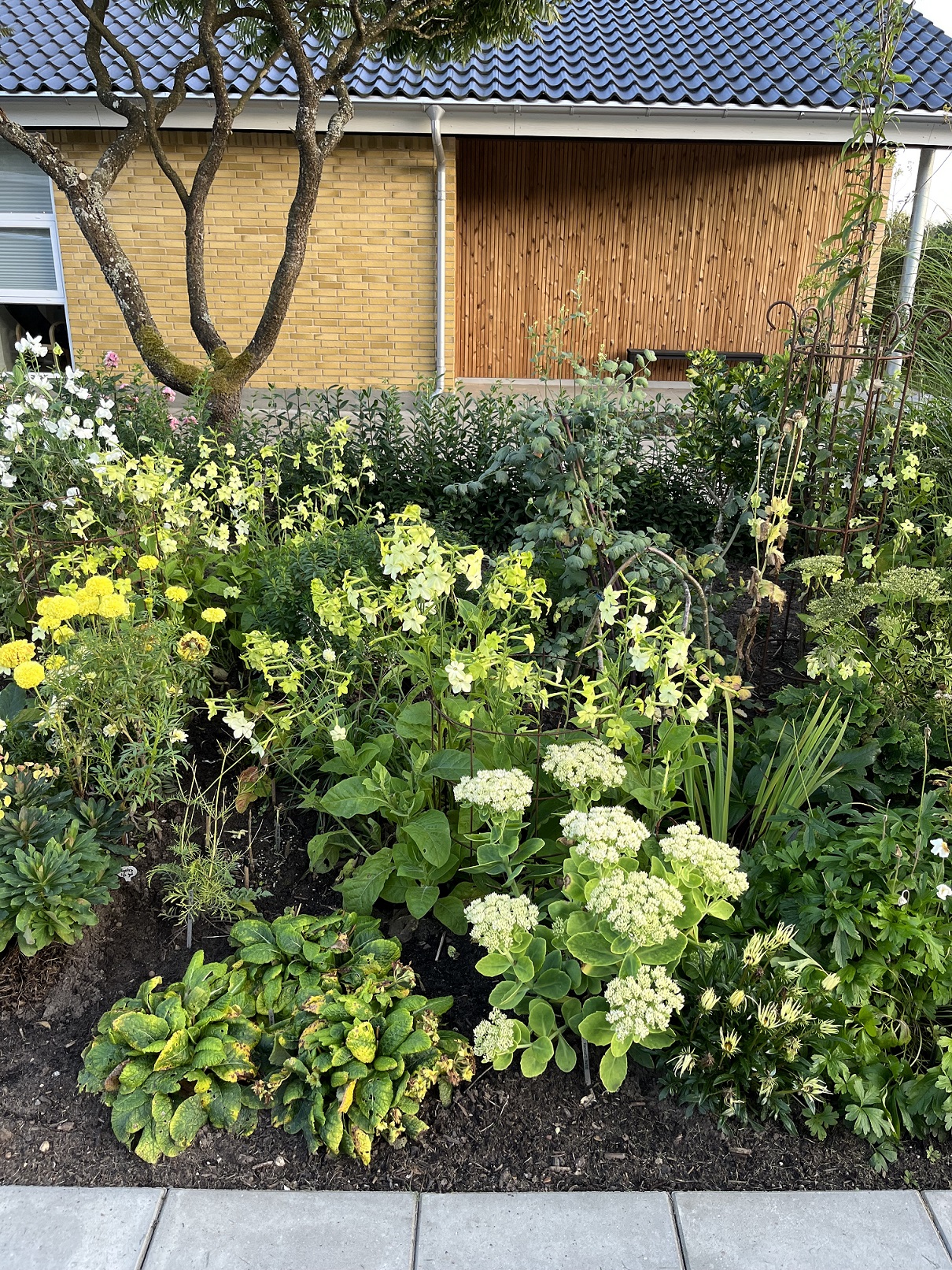 Haven er anlagt for 3 år siden og designet så den passer til et moderne hus. Der er 2 store staudebede med ca. 90 forskellige stauder og 2 hosta bede med 80-90 forskellige hostaer. Nyt orangeri/drivhus med plads til både prikling, tomater og hygge. Skærehave i højbede, køkkenhave i Growcamp, krydderurtehave i højbede. Stor terrasse med krukker og udekøkken. I haven er der også et arbejdshjørne til ompotning, buketbinding m.v. Forhaven er en stenbedshave med stedsegrønt og enkelte stenbedsplanter.